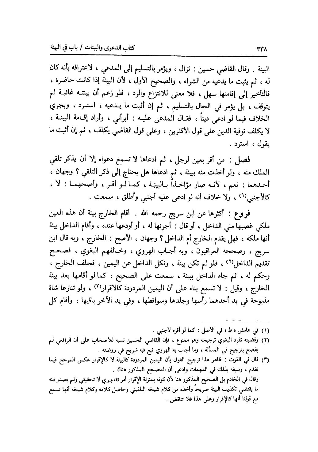 البينة. وقال القاضي حسين: تزال، ويؤمر بالتسليم إلى المدعي، لاعترافه بأنه كان له، ثم يثبت ما يدعيه من الشراء، والصحيح الاول، لان البينة إذا كانت حاضرة، فالتأخير إلى إقامتها سهل، فلا معنى للانتزاع والرد، فلو زعم أن بينته غائبة لم يتوقف، بل يؤمر في الحال بالتسليم، ثم إن أثبت ما يدعيه، استرد، ويجري الخلاف فيما لو ادعى دينا، فقال المدعى عليه: أبرأني، وأراد إقامة البينة، لا يكلف توفية الدين على قول الاكثرين، وعلى قول القاضي يكلف، ثم إن أثبت ما يقول، استرد. فصل من أقر بعين لرجل، ثم ادعاها لا تسمع دعواه إلا أن تذكر تلقي الملك منه، ولو أخذت منه ببينة، ثم ادعاها هل يحتاج إلى ذكر التلقي ؟ وجهان، أحدهما: نعم، لانه صار مؤاخذا بالبينة، كما لو أقر، وأصحهما: لا، كالاجنبي، ولا خلاف أنه لو ادعى عليه أجنبي وأطلق، سمعت. فروع أكثرها عن ابن سريج رحمه الله. أقام الخارج بينة أن هذه العين ملكي غصبها مني الداخل، أو قال: أجرتها له، أو أودعها عنده، وأقام الداخل بينة أنها ملكه، فهل يقدم الخارج أم الداخل ؟ وجهان، الاصح: الخارج، وبه قال ابن سريج، وصححه العراقيون، وبه أجاب الهروي، وخالفهم البغوي، فصحح تقديم الداخل، فلو لم تكن بينة، ونكل الداخل عن اليمين، فحلف الخارج، وحكم له، ثم جاء الداخل ببينة، سمعت على الصحيح، كما لو أقامها بعد بينة الخارج، وقيل: لا تسمع بناء على أن اليمين المردودة كالاقرار، ولو تنازعا شاة مذبوحة في يد أحدهما رأسها وجلدها وسواقطها، وفي يد الآخر باقيها، وأقام كل