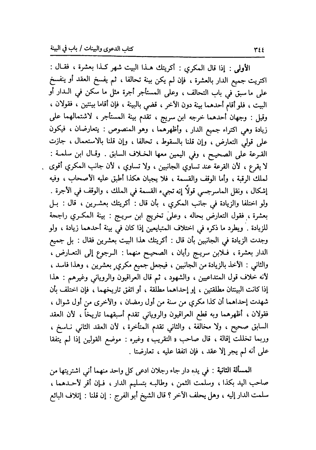 الاولى: إذا قال المكري: أكريتك هذا البيت شهر كذا بعشرة، فقال: اكتريت جميع الدار بالعشرة، فإن لم يكن بينة تحالفا، ثم يفسخ العقد أو ينفسخ على ما سبق في باب التحالف، وعلى المستأجر أجرة مثل ما سكن في الدار أو البيت، فلو أقام أحدهما بينة دون الآخر، قضي بالبينة، فإن أقاما بينتين، فقولان، وقيل: وجهان أحدهما خرجه ابن سريج، تقدم بينة المستأجر، لاشتمالهما على زيادة وهي اكترا جميع الدار، وأظهرهما، وهو المنصوص: يتعارضان، فيكون على قولي التعارض، وإن قلنا: بالسقوط، تحالفا، وإن قلنا: بالاستعمال، جازت القرعة على الصحيح، وفي اليمين معها الخلاف السابق. وقال ابن سلمة: لا يقرع، لان القرعة عند تساوي الجانبين، ولا تساوي، لان جانب المكري أقوى لملك الرقبة، وأما الوقف والقسمة، فلا يجبان هكذا أطبق عليه الاصحاب، وفيه إشكال، ونقل الماسرجسي قولا أنه تجئ القسمة في الملك، والوقف في الاجرة. ولو اختلفا والزيادة في جانب المكري، بأن قال: أكريتك بعشرين، قال: بل بعشرة، فقول التعارض بحاله، وعلى تخريج ابن سريج: بينة المكري راجحة للزيادة. ويطرد ما ذكره في اختلاف المتبايعين إذا كان في بينة أحدهما زيادة، ولو وجدت الزيادة في الجانبين بأن قال: أكريتك هذا البيت بعشرين، فقال: بل جميع الدار بعشرة، فلابن سريج رأيان، الصحيح منهما: الرجوع إلى التعارض، والثاني: الاخذ بالزيادة من الجانبين، فيجعل جميع مكري بعشرين، وهذا فاسد، لانه خلاف قول المتداعيين، والشهود، ثم قال العراقيون والروياني وغيرهم: هذا إذا كانت البينتان مطلقتين، أو إحداهما مطلقة، أو اتفق تاريخهما، فإن اختلف بأن شهدت إحداهما أن كذا مكري من سنة من أول رمضان، والاخرى من أول شوال، فقولان، أظهرهما وبه قطع العراقيون والروياني تقدم أسبقهما تاريخا، لان العقد السابق صحيح، ولا مخالفة، والثاني تقدم المتأخرة، لان العقد الثاني ناسخ، وربما تخللت إقالة، قال صاحب التقريب وغيره: موضع القولين إذا لم يتفقا على أنه لم يجر إلا عقد، فإن اتفقا عليه، تعارضتا. المسألة الثانية: في يده دار جاء رجلان ادعى كل واحد منهما أني اشتريتها من صاحب اليد بكذا، وسلمت الثمن، وطالبه بتسليم الدار، فإن أقر لأحدهما، سلمت الدار إليه، وهل يحلف الآخر ؟ قال الشيخ أبو الفرج: إن قلنا إتلاف البائع