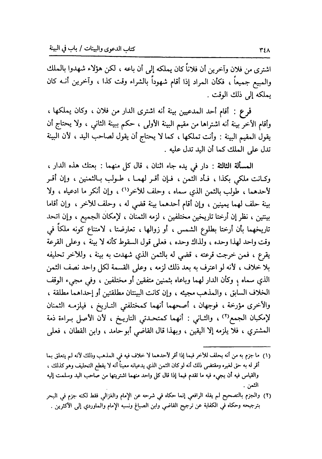 اشترى من فلان وآخرين أن فلانا كان يملكه إلى أن باعه، لكن هؤلاء شهدوا بالملك والمبيع جميعا، فكأن المراد إذا أقام شهودا بالشراء وقت كذا، وآخرين أنه كان يملكه إلى ذلك الوقت. فرع أقام أحد المدعيين بينة أنه اشترى الدار من فلان، وكان يملكها، وأقام الآخر بينة أنه اشتراها من مقيم البينة الاولى، حكم ببينة الثاني، ولا يحتاج أن يقول المقيم البينة: وأنت تملكها، كما لا يحتاج أن يقول لصاحب اليد، لان البينة تدل على الملك كما أن اليد تدل عليه. المسألة الثالثة: دار في يده جاء اثنان، قال كل منهما: بعتك هذه الدار، وكانت ملكي بكذا، فأد الثمن، فإن أقر لهما، طولب بالثمنين، وإن أقر لاحدهما، طولب بالثمن الذي سماه، وحلف للآخر، وإن أنكما ادعياه، ولا بينة حلف لهما يمينين، وإن أقام أحدهما بينة قضي له، وحلف للآخر، وإن أقاما بينتين، نظر إن أرختا تاريخين مختلفين، لزمه الثمنان، لامكان، الجميع، وإن اتحد تاريخهما بأن أرختا بطلوع الشمس، أو زوالها، تعارضتا، لامتناع كونه ملكا في وقت واحد لهذا وحده، ولذاك وحده، فعلى قول السقوط كأنه لا بينة، وعلى القرعة يقرع، فمن خرجت قرعته، قضي له بالثمن الذي شهدت به بينة، وللآخر تحليفه بلا خلاف، لانه لو اعترف به بعد ذلك لزمه، وعلى القسمة لكل واحد نصف الثمن الذي سماه، وكأن الدار لهما وباعاه بثمنين متفقين أو مختلفين، وفي مجئ الوقف الخلاف السابق، والمذهب مجيئه، وإن كانت البينتان مطلقتين أو إحداهما مطلقة، والاخرى مؤرخة، فوجهان، أصحهما أنهما كمختلفتي التاريخ، فيلزمه الثمنان لامكان الجمع، والثاني: أنهما كمتحدتي التاريخ، لان الاصل براءة ذمة المشتري، فلا يلزمه إلا اليقين، وبهذا قال القاضي أبو حامد، وابن القطان، فعلى