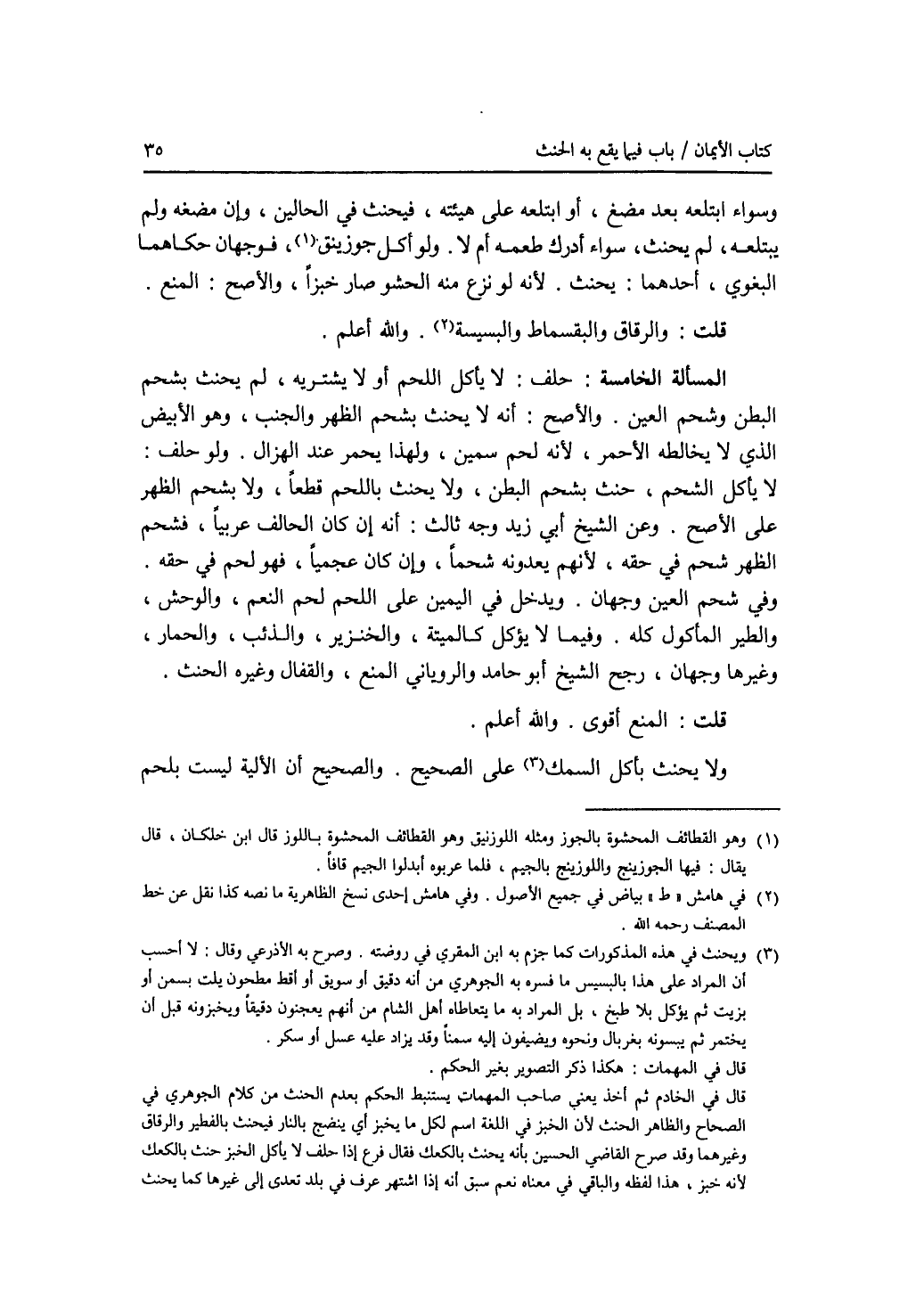 وسواء ابتلعه بعد مضغ، أو ابتلعه على هيئته، فيحنث في الحالين، وإن مضغه ولم يبتلعه، لم يحنث، سواء أدرك طعمه أم لا. ولو أكل جوز نيقا، فوجهان حكاهما البغوي، أحدهما: يحنث، لانه لو نزع منه الحشو صار خبزا، والاصح: المنع. قلت: والرقاق والبقسماط والبسيسة.... والله أعلم. المسألة الخامسة: حلف: لا يأكل اللحم أو لا يشتريه، لم يحنث بشحم البطن وشحم العين. والاصح: أنه لا يحنث بشحم الظهر والجنب، وهو الابيض الذي لا يخالطه الاحمر، لانه لحم سمين. ولهذا يحمر عند الهزال. ولو حلف: لا يأكل الشحم، حنث بشحم البطن، ولا يحنث باللحم قطعا، ولا بشحم الظهر على الاصح. وعن الشيخ أبي زيد وجه ثالث: أنه إن كان الحالف عربيا، فشحم الظهر شحم في حقه، لانهم يعدونه شحما، وإن كان عجميا، فهو لحم في حقه. وفي شحم العين وجهان. ويدخل في اليمين على اللحم لحم النعم، والوحش، والطير المأكول كله. وفيما لا يؤكل كالميتة، والخنزير، والذئب، والحمار، وغيرها وجهان، رجح الشيخ أبو حامد والروياني المنع، والقفال وغيره الحنث. قلت: المنع أقوى. والله أعلم. ولا يحنث بأكل السمك على الصحيح. والصحيح أن الالية ليست بلحم