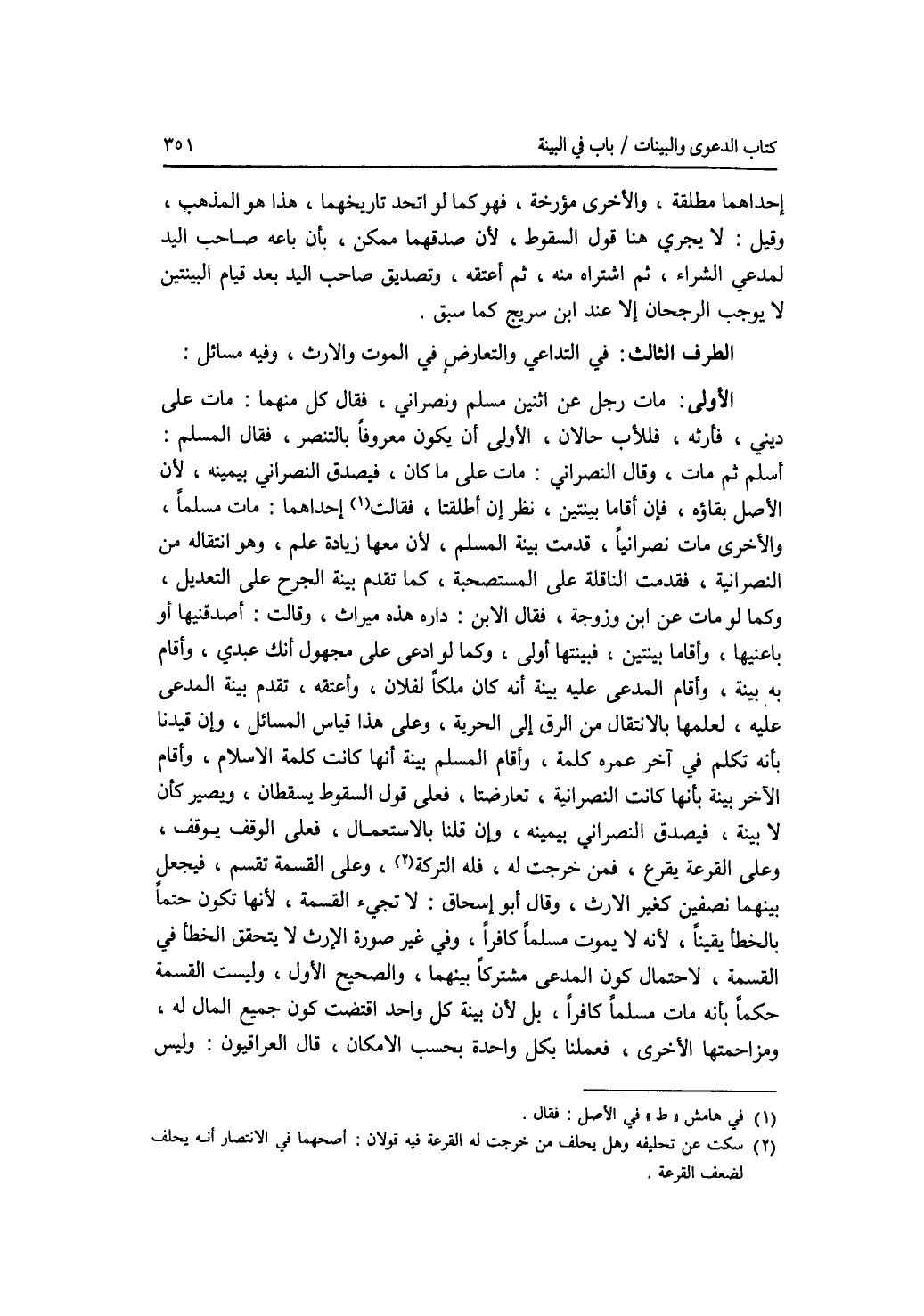 الطرف الثالث : في التداعي والتعارض في الموت والارث، وفيه مسائل: الاولى: مات رجل عن اثنين مسلم ونصراني، فقال كل منهما: مات على ديني فأرثه، فللاب حالان، الاولى أن يكون معروفا بالتنصر، فقال المسلم: أسلم ثم مات، وقال النصراني: مات على ما كان، فيصدق النصراني بيمينه، لان الاصل بقاؤه، فإن أقاما بينتين، نظر إن أطلقتا، فقالت إحداهما: مات مسلما، والاخرى مات نصرانيا، قدمت بينة المسلم، لان معها زيادة علم، وهو انتقاله من النصرانية، فقدمت الناقلة على المستصحبة، كما تقدم بينة الجرح على التعديل، وكما لو مات عن ابن وزوجة، فقال الابن: داره هذه ميراث، وقالت: أصدقنيها أو باعنيها، وأقاما بينتين، فبينتها أولى، وكما لو ادعى على مجهول أنك عبدي، وأقام به بينة، وأقام المدعى عليه بينة أنه كان ملكا لفلان، وأعتقه، تقدم بينة المدعى عليه، لعلمها بالانتقال من الرق إلى الحرية، وعلى هذا قياس المسائل، وإن قيدنا بأنه تكلم في آخر عمره كلمة، وأقام المسلم بينة أنها كانت كلمة الاسلام، وأقام الآخر بينة بأنها كانت النصرانية، تعارضتا، فعلى قول السقوط يسقطان، ويصير كأن لا بينة، فيصدق النصراني بيمينه، وإن قلنا بالاستعمال، فعلى الوقف يوقف، وعلى القرعة يقرع، فمن خرجت له، فله التركة، وعلى القسمة تقسم، فيجعل بينهما نصفين كغير الارث، وقال أبو إسحاق: لا تجئ القسمة، لانها تكون حتما بالخطأ يقينا، لانه لا يموت مسلما كافرا، وفي غير صورة الارث لا يتحقق الخطأ في القسمة، لاحتمال كون المدعى مشتركا بينهما، والصحيح الاول، وليست القسمة حكما بأنه مات مسلما كافرا، بل لان بينة كل واحد اقتضت كون جميع المال له، ومزاحمتها الاخرى، فعملنا بكل واحدة بحسب الامكان، قال العراقيون: وليس