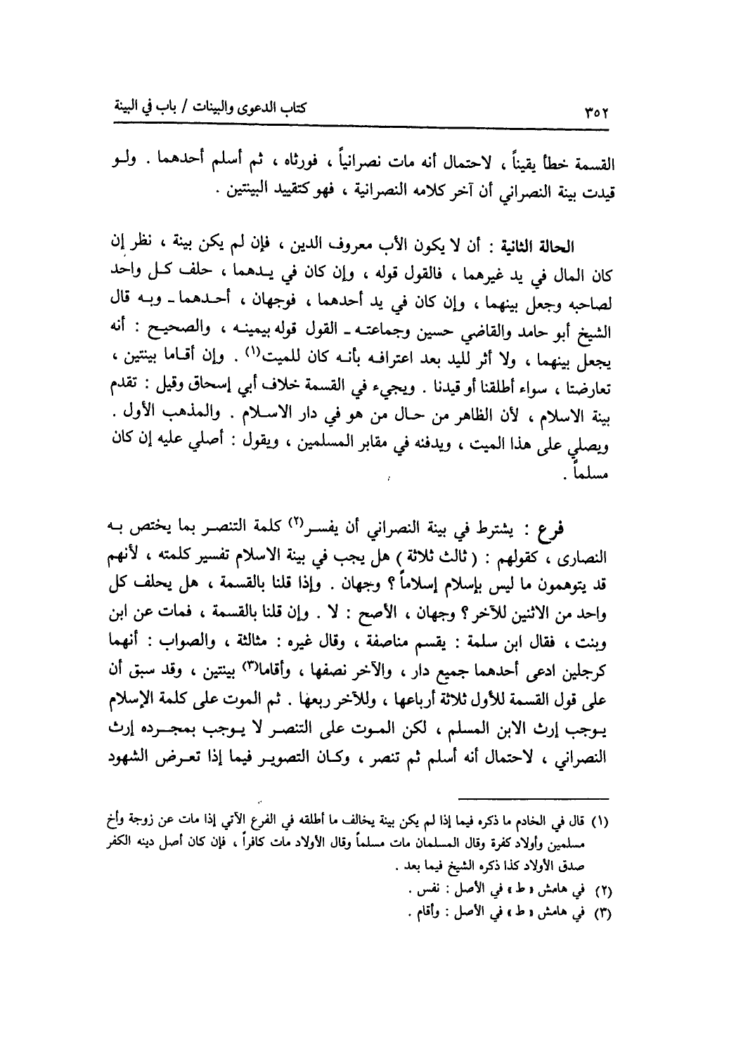 القسمة خطأ يقينا، لاحتمال أنه مات نصرانيا، فورثاه، ثم أسلم أحدهما. ولو قيدت بينة النصراني أن آخر كلامه النصرانية، فهو كتقييد البينتين. الحالة الثانية: أن لا يكون الا ب معروف الدين، فإن لم يكن بينة، نظر إن كان المال في يد غيرهما، فالقول قوله: وإن كان في يدهما، حلف كل واحد لصاحبه وجعل بينهما، وإن كان في يد أحدهما، فوجهان، أحدهما - وبه قال الشيخ أبو حامد والقاضي حسين وجماعته -: القول قوله بيمينه، والصحيح: أنه يجعل بينهما، ولا أثر لليد بعد اعترافه بأنه كان للميت. وإن أقاما بينتين، تعارضتا، سواء أطلقنا أو قيدنا. ويجئ في القسمة خلاف أبي إسحاق وقيل: تقدم بينة الاسلام، لان الظاهر من حال من هو في دار الاسلام. والمذهب الاول. ويصلي على هذا الميت، ويدفنه في مقابر المسلمين، ويقول: أصلي عليه إن كان مسلما. فرع يشترط في بينة النصراني أن يفسر كلمة التنصر بما يختص به النصارى، كقولهم: (ثالث ثلاثة) هل يجب في بينة الاسلام تفسير كلمته، لانهم قد يتوهمون ما ليس بإسلام إسلاما ؟ وجهان. وإذا قلنا بالقسمة، هل يحلف كل واحد من الاثنين للآخر ؟ وجهان، الاصح: لا. وإذا قلنا بالقسمة: فمات عن ابن وبنت، فقال ابن سلمة: يقسم مناصفة، وقال غيره: مثالثة، والصواب: أنهما كرجلين ادعى أحدهما جميع دار، والآخر نصفها، وأقاما بينتين، وقد سبق أن على قول القسمة للاول ثلاثة أرباعها، وللآخر ربعها. ثم الموت على كلمة الاسلام يوجب إرث الابن المسلم، لكن الموت على التنصر لا يوجب بمجرده إرث النصراني، لاحتمال أنى أسلم ثم تنصر، وكان التصوير فيما إذا تعرض الشهود