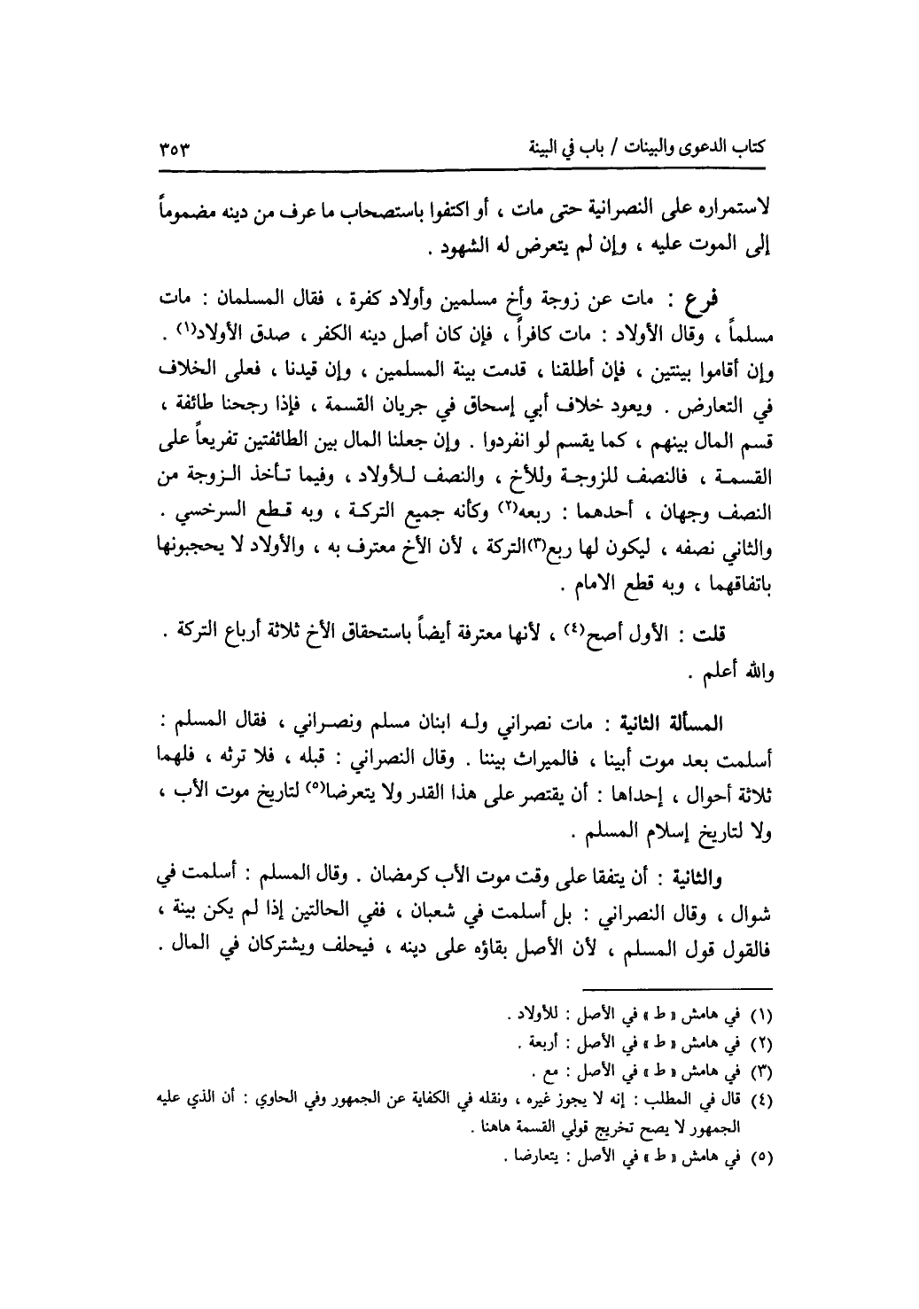 لاستمراره على النصرانية حتى مات، أو اكتفوا باستصحاب ما عرف من دينه مضموما إلى الموت عليه، وإن لم يتعرض له الشهود. فرع مات عن زوجة وأخ مسلمين وأولاد كفرة، فقال المسلمان: مات مسلما، وقال الاولاد: مات كافرا، فإن كان أصل دينه الكفر، صدق الاولاد. وإن أقاموا بينتين، فإن أطلقنا، قدمت بينة المسلمين، وإن قيدنا، فعلى الخلاف في التعارض. ويعود خلاف أبي اسحاق في جريان القسمة، فإذا رجحنا طائفة، قسم المال بينهم، كما يقسم لو انفردوا. وإن جعلنا المال بين الطائفتين تفريعا على القسمة، فالنصف للزوجة وللاخ، والنصف للاولاد، وفيما تأخذ الزوجة من النصف وجهان، أحدهما: ربعه وكأنه جميع التركة، وبه قطع السرخسي. والثاني نصفه، ليكون لها ربع التركة، لان الاخ معترف به، والاولاد لا يحجبونها باتفاقهما، وبه قطع الامام. قلت: الاول أصح، لانها معترفة أيضا باستحقاق الاخ ثلاثة أرباع التركة. والله أعلم. المسألة الثانية: مات نصراني وله ابنان مسلم ونصراني، فقال المسلم: أسلمت بعد موت أبينا، فالميراث بيننا. وقال النصراني: قبله، فلا ترثه، فلهما ثلاثة أحوال، إحداها: أن يقتصر على هذا القدر ولا يتعرضا لتاريخ موت الاب، ولا لتاريخ إسلام المسلم. والثانية: أن يتفقا على وقت موت الاب كرمضان. وقال المسلم: أسلمت في شوال، وقال النصراني: بل أسلمت في شعبان، ففي الحالتين إن لم يكن بينة، فالقول قول المسلم، لان الاصل بقاؤه على دينه، يحلف ويشتركان في المال.