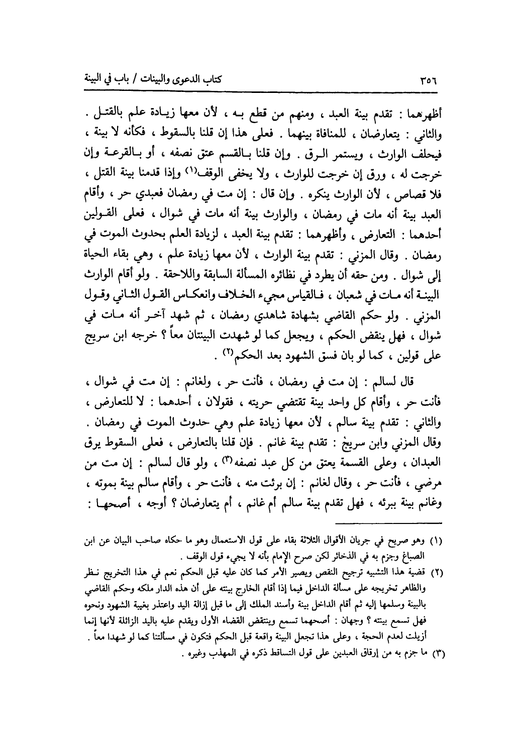 أظهرهما: تقدم بينة العبد، ومنهم من قطع به، لان معها زيادة علم بالقتل. والثاني: يتعارضان، للمنافاة بينهما. فعلى هذا إن قلنا بالسقوط، فكأنه لا بينة، فيحلف الوارث، ويستمر الرق. وإن قلنا بالقسم عتق نصفه، أو بالقرعة وإن خرجت له، ورق إن خرجت للوارث، ولا يخفى الوقف. وإذا قدمنا بينة القتل، فلا قصاص، لان الوارث ينكره. وإن قال إن مت في رمضان فعبدي حر، وأقام العبد بينة أنه مات في رمضان، والوارث بينة أنه مات في شوال، فعلى القولين أحدهما: التعارض، وأظهرهما: تقدم بينة العبد، لزيادة العلم بحدوث الموت في رمضان. وقال المزني: تقدم بينة الوار ث، لان معها زيادة علم، وهي بقاء الحياة إلى شوال. ومن حقه أن يطرد في نظائره المسألة السابقة واللاحقة. ولو أقام الوارث البينة أنه مات في شعبان، فالقياس مجئ الخلاف وانعكاس القول الثاني وقول المزني. ولو حكم القاضي بشهادة شاهدي رمضان، ثم شهد آخر أنه مات في شوال، فهل ينقض الحكم، ويجعل كما لو شهدت البينتان معا ؟ خرجه ابن سريج على قولين، كما لو بان فسق الشهود بعد الحكم. فرع قال لسالم: إن مت في رمضان، فأنت حر، ولغانم: إن مت في شوال، فأنت حر، وأقام كل واحد بينة تقتضي حريته، فقولان، أحدهما: لا للتعارض، والثاني: تقدم بينة سالم، لان معها زيادة علم وهي حدوث الموت في رمضان. وقال المزني وابن سريج: تقدم بينة غانم. فإن قلنا: بالتعارض، فعلى السقوط يرق العبدان، وعلى القسمة يعتق من كل عبد نصفه، ولو قال لسالم: إن مت من مرضي فأنت حر، وقال لغانم: إن برئت منه، فأنت حر، وأقام سالم بينة بموته، وغانم بينة ببرئه، فهل تقدم بينة سالم أم غانم، أم يتعارضان ؟ أوجه، أصحهما: