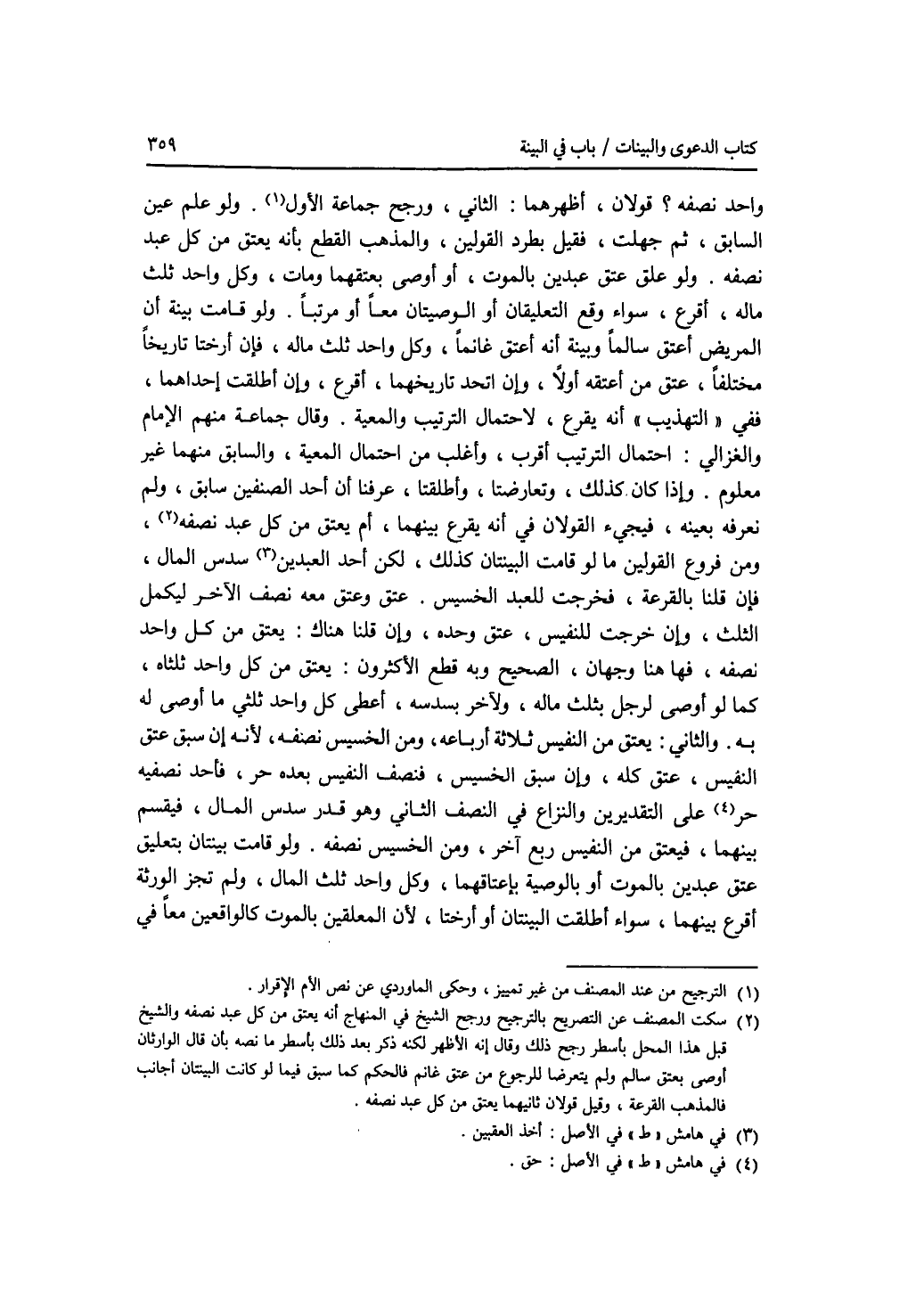 واحد نصفه ؟ قولان، أظهرهما: الثاني، ورجح جماعة الاول. ولو علم عين السابق، ثم جهلت، فقيل بطرد القولين، والمذهب القطع بأنه يعتق من كل عبد نصفه. ولو علق عتق عبدين بالموت، أو أوصى بعتقهما ومات، وكل واحد ثلث ماله، أقرع، سواء وقع التعليقان أو الوصيتان معا أو مرتبا. ولو قامت بينة أن المريض أعتق سالما وبينة أنه أعتق غانما، وكل واحد ثلث ماله، فإن أرختا تاريخا مختلفا، عتق من أعتقه أولا، وإن اتحد تاريخهما، أقرع وإن أطلقت إحداهما، ففي التهذيب أنه يقرع، لاحتمال الترتيب والمعية وقال جماعة منهم الامام والغزالي: احتمال الترتيب أقرب، وأغلب من احتمال المعية، والسابق منهما غير معلوم. وإذا كان كذلك، وتعارضتا، وأطلقتا، عرفنا أن أحد الصنفين سابق، ولم نعرفه بعينه، فيجئ القولان في أنه يقرع بينهما، أم يعتق مكل عبد نصفه ؟ ومن فروع القولين ما لو قامت البينتان كذلك، لكن أحد العبدين سدس المال، فإن قلنا بالقرعة، فخرجت للعبد الخسيس، عتق وعتق معه نصف الآخر ليكمل الثلث، وإن خرجت للنفيس، عتققحده، وإن قلنا هناك: يعتق من كل واحد نصفه، فهاهنا وجهان، الصحيح وبه قطع الاكثرون: يعتق من كل واحد ثلثاه، كما لو أوصى لرجل بثلث ماله، ولآخر بسدسه، أعطى كل واحد ثلثي ما أوصى له به. والثاني: يعتق من النفيس ثلاثة أرباعه، ومن الخسيس نصفه، لانه إن سبق عتق النفيس، عتق كله، وإن سبق الخسيس، فنصف النفيس بعده حر، فأحد نصفيه حر على التقديرين والنزاع في النصف الثاني وهو قدر سدس المال، فيقسم بينهما، فيعتق من النفيس ربع آخر، ومن الخسيس نصفه. ولو قامت بينتان بتعليق عتق عبدين بالموت أو بالوصية بإعتاقهما، وكل واحد ثلث المال، ولم تجز الورثة أقرع بينهما، سواء أطلقت البينتان أو أرختا، لان المعلقين بالموت كالواقعين معا في