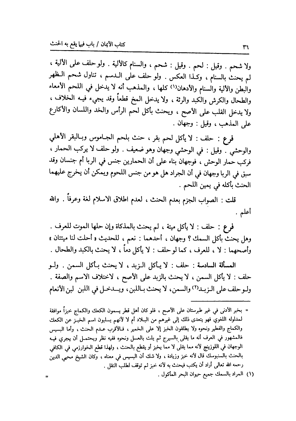 ولا شحم. وقيل: لحم. وقيل: شحم، والسنام كالالية. ولو حلف على الالية، لم يحنث بالسنام، وكذا العكس. ولو حلف على الدسم، تناول شحم الظهر والبطن والالية والسنام والادهان كلها، والمذهب أنه لا يدخل في اللحم الامعاء والطحال والكرش والكبد والرئة، ولا يدخل المخ قطعا وقد يجئ فيه الخلاف، ولا يدخل القلب على الاصح، ويحنث بأكل لحم الرأس والخد واللسان والاكارع على المذهب، وقيل: وجهان. فرع حلف: لا يأكل لحم بقر، حنث بلحم الجاموس وبالبقر الاهلي والوحشي. وقيل: في الوحشي وجهان وهو ضعيف. ولو حلف لا يركب الحمار، فركب حمار الوحش، فوجهان بناء على أن الحمارين جنس في الربا أم جنسان وقد سبق في الربا وجهان في أن الجراد هل هو من جنس اللحوم ويمكن أن يخرج عليهما الحنث بأكله في يمين اللحم. قلت: الصواب الجزم بعدم الحنث، لعدم اطلاق الاسم لغة وعرفا. والله أعلم. فرع حلف: لا يأكل ميتة، لم يحنث بالمذكاة وإن حلها الموت للعرف. وهل يحنث بأكل السمك ؟ وجهان، أحدهما: نعم للحديث أحلت لنا ميتتان وأصحهما: لا، للعرف، كما لو حلف: لا يأكل دما، لا يحنث بالكبد والطحال. المسألة السادسة: حلف: لا يأكل الزبد، لا يحنث بأكل السمن. ولو حلف: لا يأكل السمن، لا يحنث بالزبد على الاصح، لاختلاف الاسم والصفة. ولو حلف على الزبد والسمن، لا يحنث باللبن، ويدخل في اللبن لبن الانعام