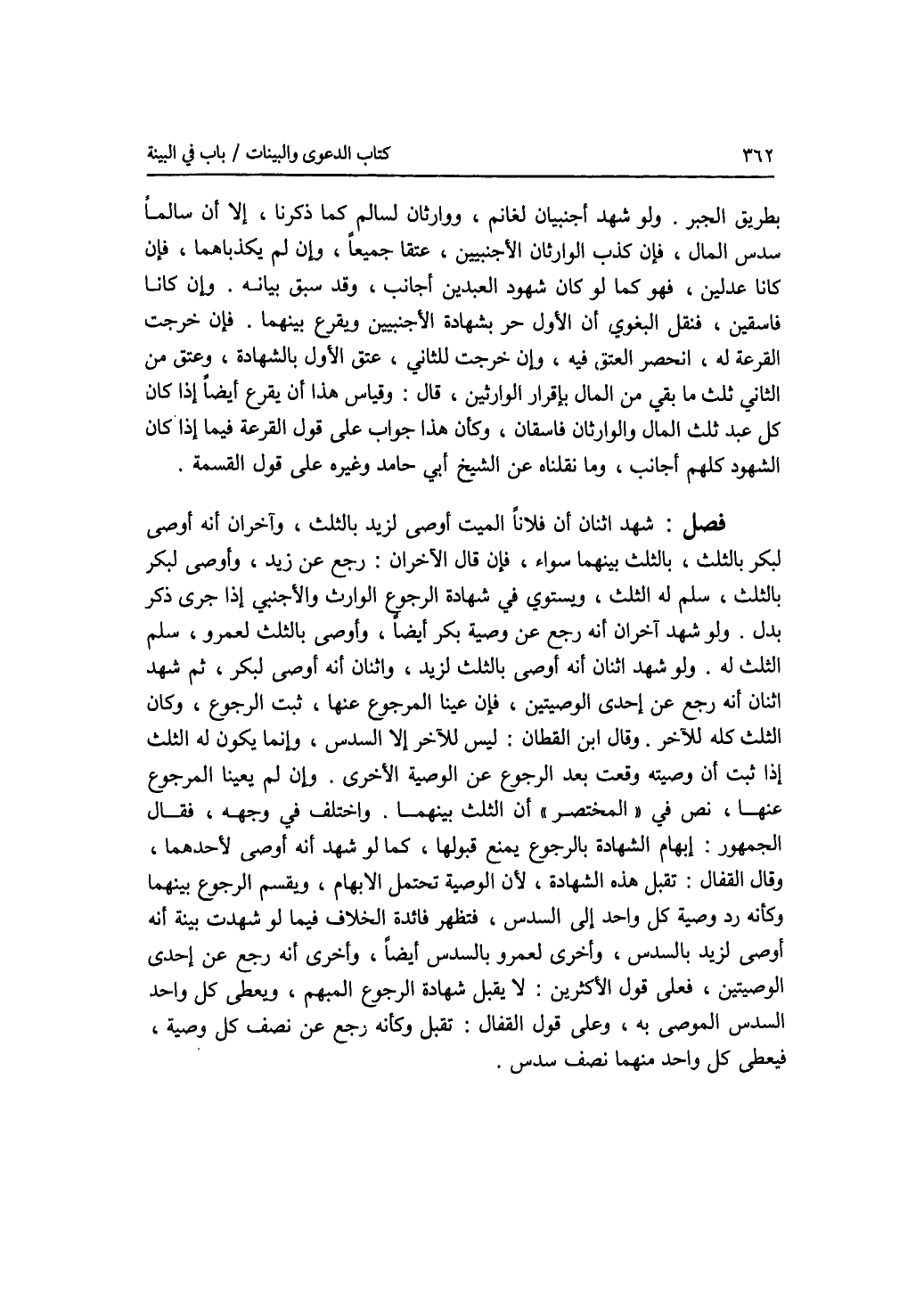 بطريق الجبر. ولو شهد أجنبيان لغانم، ووارثان لسالم كما ذكرنا، إلا أن سالما سدس المال، فإن كذب الوارثان الاجنبيين، عتقا جميعا، وإن لم يكذباهما، فإن كانا عدلين، فهو كما لو كان شهود العبدين أجانب، وقد سبق بيانه. وإن كانا فاسقين، فنقل البغوي أن الاول حر بشهادة الاجنبيين، ويقرع بينهما. فإن خرجت القرعة له، انحصر العتق فيه، وإن خرجت للثاني، عتق الاول بالشهادة، وعتق من الثاني ثلث ما بقي من المال بإقرار الوارثين، قال: وقياس هذا أن يقرع أيضا إذا كان كل عبد ثلث المال والوارثان فاسقان، وكأن هذا جواب على قول القرعة فيما إذا كان الشهود كلهم أجانب، وما نقلناه عن الشيخ أبي حامد وغيره على قول القسمة. فصل شهد اثنان أن فلانا الميت أوصى لزيد بالثلث، وآخران أنه أوصى لبكر بالثلث، فالثلث بينهما سواء، فإن قال الآخران: رجع عن زيد، وأوصى لبكر بالثلث، سلم له الثلث، ويستوي في شهادة الرجوع الوارث والاجنبي إذا جرى ذكر بدل. ولو شهد آخران أنه رجع عن وصية بكر أيضا، وأوصى بالثلث لعمرو، سلم الثلث له. ولو شهد إثنان أنه أوصى بالثلث لزيد، واثنان أنه أوصى لبكر، ثم شهد اثنان أنه رجع عن إحدى الوصيتين، فإن عينا المرجوع عنها، ثبت الرجوع، وكان الثلث كله للآخر. وقال ابن القطان: ليس للآخر الا السدس، وإنما يكون له الثلث إذا ثبت أن وصيته وقعت بعد الرجوع عن الوصية الاخرى. وإن لم يعينا المرجوع عنها، نص في المختصر أن الثلث بينهما. واختلف في وجهه، فقال الجمهور: إبهام الشهادة بالرجوع يمنع قبولها، كما لو شهد أنه أوصى لاحدهما، وقال القفال: تقبل الشهادة لان الوصية تحتمل الابهام، ويقسم الرجوع بينهما وكأنه رد وصية كل واحد إلى السدس، فتظهر فائدة الخلاف فيما لو شهدت بينة أنه أوصى لزيد بالسدس، وأخرى لعمرو بالسدس أيضا، وأخرى أنه رجع عن إحدى الوصيتين، فعلى قول الاكثرين: لا يقبل شهادة الرجوع المبهم، ويعطى كل واحد السدس الموصى به، وعلى قول القفال: تقبل وكأنه رجع عن نصف كل وصية، فيعطى كل واحد منهما نصف سدس.