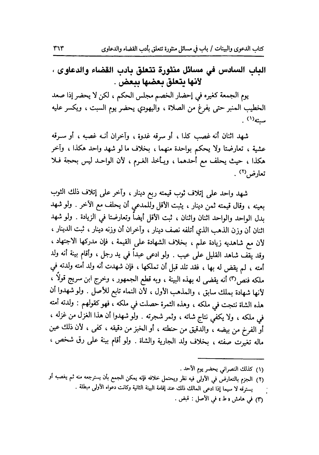 الباب السادس : في مسائل منثورة تتعلق بأدب القضاء والشهادات والدعاوي، لانها يتعلق بعضها ببعض يوم الجمعة كغيره في إحضار الخصم مجلس الحكم، لكن لا يحضر إذا صعد الخطيب المنبر حتى يفرغ من الصلاة، واليهودي يحضر يوم السبت، ويكسر عليه سبته. شهد اثنان أنه غصت كذا، أو سرقه غدوة، وآخران أنه غصبه، أو سرقه عشية، تعارضتا ولا يحكم بواحدة منهما، بخلاف ما لو شهد واحد هكذا، وآخر هكذا حيث يحلف مع أحدهما، ويأخذ الغرم، لان الواحد ليس بحجة فلا تعارض. شهد واحد على إتلاف ثوب قيمته ربع دينار، وآخر على إتلاف ذلك الثوب بعينه، وقال قيمته ثمن دينار، يثبت الاقل وللمدعي أن يحلف مع الآخر. ولو شهد بدل الواحد والواحد اثنان واثنان، ثبت الاقل أيضا وتعارضتا في الزيادة. ولو شهد اثنان أن وزن الذهب الذي أتلفه نصف دينار، وآخران أن وزنه دينار، ثبت الدينار، لان مع شاهديه زيادة علم، بخلاف الشهادة على القيمة، فإن مدركها الاجتهاد، وقد يقف شاهد القليل على عيب. ولو ادعى عبدا في يد رجل، وأقام بينة أنه ولد أمته، لم يقض له بها، فقد تلد قبل أن تملكها، فإن شهدت أنه ولد أمته ولدته في ملكه فنص أنه يقضى له بهذه البينة، وبه قطع الجمهور، وخرج ابن سريج قولا، لانها شهادة بملك سابق، والمذهب الدول، لان النماء تابع للاصل. ولو شهدوا أن هذه الشاة نتجت في ملكه، وهذه الثمرة حصلت في ملكه، فهو كقولهم: ولدته أمته في ملكه، ولا يكفي نتاج شاته، وثمر شجرته. ولو شهدوا أن هذا الغزل من غزله، أو الفرخ من بيضه، والدقيق من حنطته، أو الخبز من دقيقه، كفى، لان ذلك عين ماله تغيرت صفته، بخلاف ولد الجارية والشاة. ولو أقام بينة على رق شخص،
