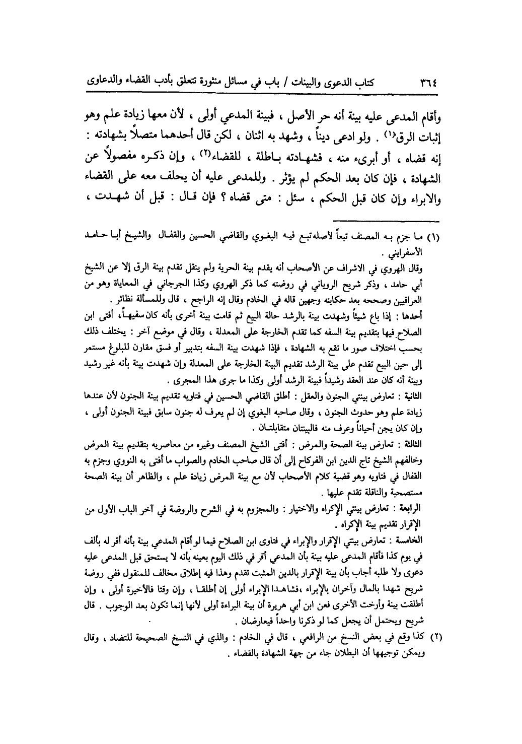 وأقام المدعى عليه بينة أنه حر الاصل، فبينة المدعي أولى، لان معها زيادة علم وهو إثبات الرق. ولو ادعى دينا، وشهد به اثنان، لكن قال أحدهما متصلا بشهادته: إنه قضاه، أو أبرئ منه، فشهادته باطلة، للقضاء، وإن ذكره مفصولا عن الشهادة، فإن كان بعد الحكم لم يؤثر. وللمدعى عليه أن يحلف معه على القضاء والابراء وإن كان قبل الحكم، سئل: متى قضاه ؟ فإن قال: قبل أن شهدت،