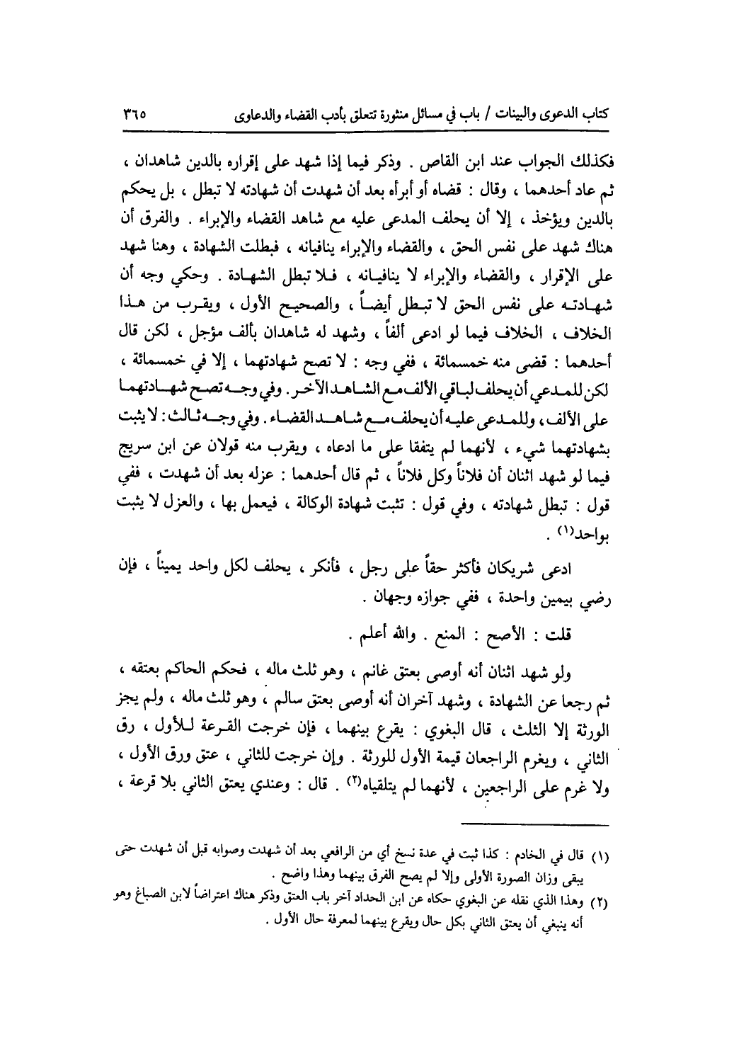 فكذلك الجواب عند ابن القاص. وذكر فيما إذا شهد على إقراره بالدين شاهدان، ثم عاد أحدهما، وقال: قضاه أو أبرأه بعد أن شهدت أن شهادته لا تبطل، بل يحكم بالدين ويؤخذ، إلا أن يحلف المدعى عليه مع شاهد القضاء والابراء. والفرق أن هناك شهد على نفس الحق، والقضاء والابراء ينافيانه، فبطلت الشهادة، وهنا شهد على الاقرار، والقضاء والابراء لا ينافيانه، فلا تبطل الشهادة. وحكي وجه أن شهادته على نفس الحق لا تبطل أيضا، والصحيح الاول، ويقرب من هذا الخلاف، الخلاف فيما لو ادعى ألفا، وشهد له شاهدان بألف مؤجل، لكن قال أحدهما: قضى منه خمسمائة، ففي وجه: لا تصح شهادتهما، إلا في خمسمائة، أن يحلف لباقي الالف مع الشاهد الآخر. وفي وجه: تصح شهادتهما على الالف، وللمدعى عليه أن يحلف مع شاهد القضاء. وفي وجه ثالث: لا يثبت بشهادتهما شئ، لانهما لم يتفقا على ما ادعاه، ويقرب منه قولان عن ابن سريج فيما لو شهد اثنان أن فلانا وكل فلانا، ثم قال أحدهما: عزله بعد أن شهدت، ففي قول: تبطل شهادته. وفي قول: تثبت شهادة الوكالة، فيعمل بها، والعزل لا يثبت بواحد. ادعى شريكان فأكثر حقا على رجل، فأنكر، يحلف لكل واحد يمينا، فإن رضي بيمين واحدة، ففي جوازه وجهان قلت: الاصح: المنع. والله أعلم. ولو شهد اثنان أنه أوصى بعتق غانم، وهثلث ماله، فحكم الحاكم بعتقه، ثم رجعا عن الشهادة، وشهد آخران أنه أوصى بسالم، وهو ثلث ماله، ولم يجز الورثة إلا الثلث، قال البغوي: يقرع بينهما، فان خرجت القرعة للاول، رق الثاني، ويغرم الراجعان قيمة الاول للورثة. وإن خرجت للثاني، عتق ورق الاول، ولا غرم على الراجعين، لانهما لم يتلقياه. قال: وعندي يعتق الثاني بلا قرعة،