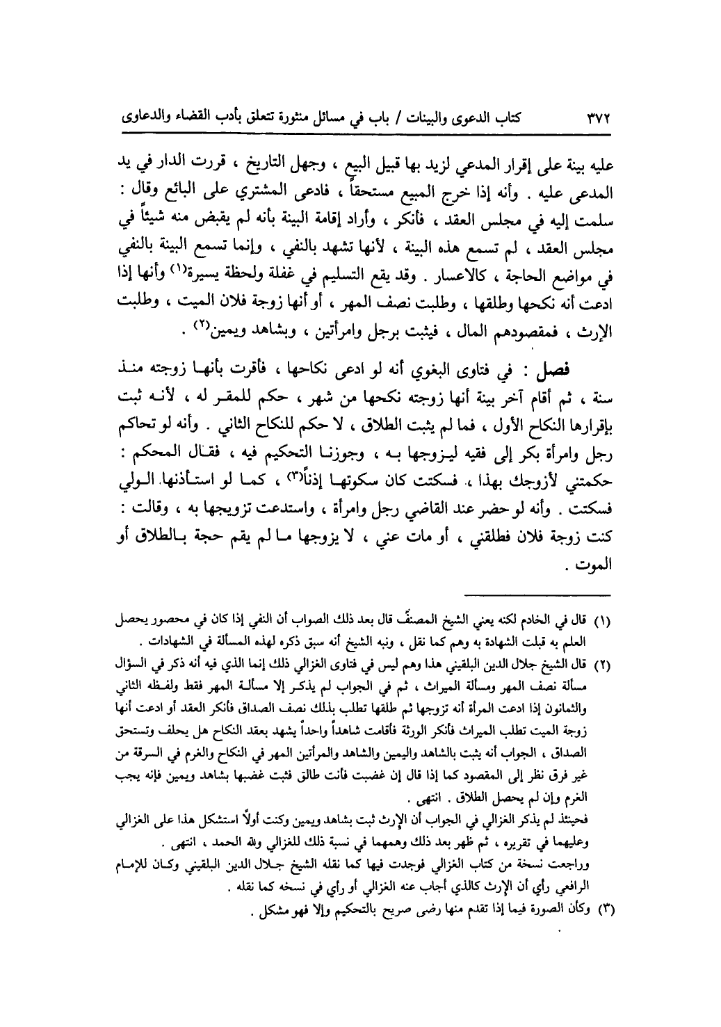عليه بينة على إقرار المدعي لزيد بها قبيل البيع، وجهل التاريخ، قررت الدار في يد المدعى عليه. وأنه إذا خرج المبيع مستحقا، فادعى المشتري على البائع وقال: سلمت إليه في مجلس العقد، فأنكر، وأراد إقامة البينة بأنه لم يقبض منه شيئا في مجلس العقد، لم تسمع هذه البينة، لانها تشهد بالنفي، وإنما تسمع البينة بالنفي في مواضع الحاجة، كالاعسار. وقد يقع التسليم في غفلة ولحظة يسيرة. وأنها إذا ادعت أنه نكحها وطلقها، وطلبت نصف المهر، أو أنها زوجة فلان الميت، وطلبت الارث، فمقصودهم المال، فيثبت برجل وامرأتين، وبشاهد ويمين. فصل في فتاوى البغوي أنه لو ادعى نكاحها، فأقرت بأنها زوجته منذ سنة، ثم أقام آخر بينة أنها زوجته نكحها من شهر، حكم للمقر له، لانه ثبت بإقرارها النكاح الاول، فما لم يثبت الطلاق، لا حكم للنكاح الثاني. وأنه لو تحاكم رجل وامرأة بكر إلى فقيه ليزوجها به، وجوزنا التحكيم فيه، فقال المحكم: حكمتني لازوجك بهذا، فسكتت كان سكوتها إذنا، كما لو استأذنها الولي فسكتت. وأنه لو حضر عند القاضي رجل وامرأة، واستدعت تزويجها به، وقالت: كنت زوجة فلان فطلقني، أو مات عني، لا يزوجها ما لم يقم حجة بالطلاق أو الموت.