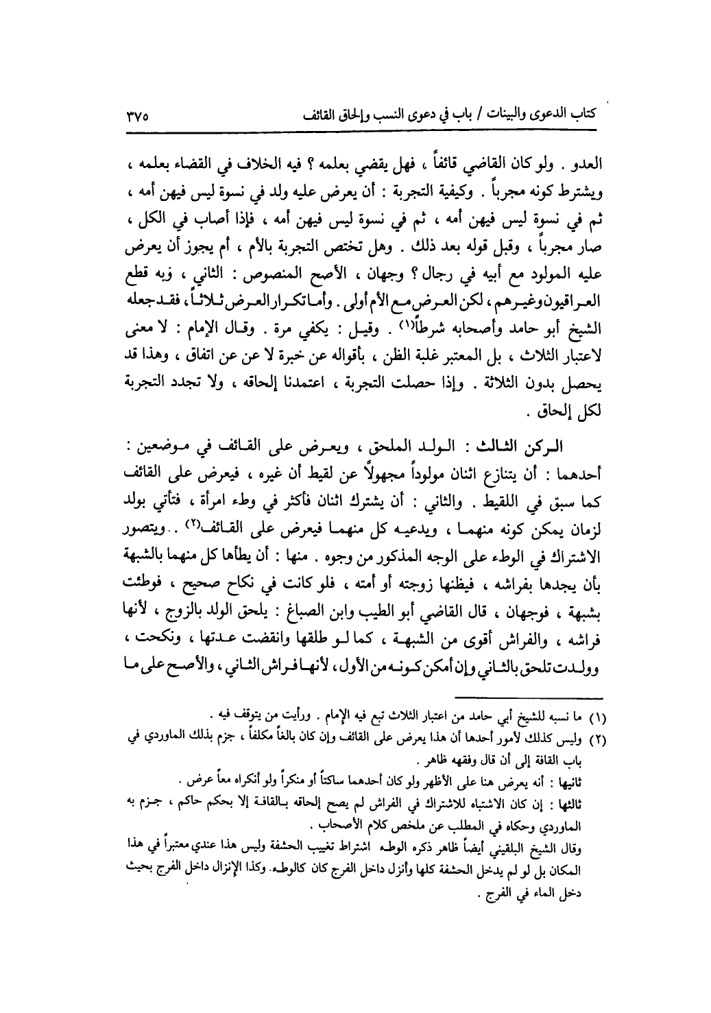 العدو. ولو كان القاضي قائفا، فهل يقضي بعلمه ؟ فيه الخلاف في القضاء بعلمه، ويشترط كونه مجربا. وكيفية التجربة: أن يعرض عليه ولد في نسوة ليس فيهن أمه، ثم في نسوة ليس فيهن أمه، ثم في نسوة ليس فيهن أمه، فإذا أصاب في الكل، صار مجربا، وقبل قوله بعد ذلك. وهل تختص التجربة بالام، أم يجوز أن يعرض عليه المولود مع أبيه في رجال ؟ وجهان، الاصح المنصوص: الثاني، وبه قطع العراقيون وغيرهم، لكن العرض مع الام أولى. وأما تكرار العرض ثلاثا، فقد جعله الشيخ أبو حامد وأصحابه شرطا. وقيل: يكفي مرة، وقال الامام: لا معنى لاعتبار الثلاث، بل المعتبر غلبة الظن، بأقواله عن خبرة لا عن اتفاق، وهذا قد يحصل بدون الثلاثة. وإذا حصلت التجربة، اعتمدنا إلحاقه، ولا تجدد التجربة لكل إلحاق. الركن الثالث: الولد الملحق، ويعرض على القائف في موضعين: أحدهما: أن يتنازع اثنان مولودا مجهولا من لقيط أن غيره، فيعرض على القائف كما سبق في اللقيط. والثاني: أن يشترك اثنان فأكثر في وطئ امرأة، فتأتي بولد لزمان يمكن كونه منهما، ويدعيه كل منهما فيعرض على القائف. ويتصور الاشتراك في الوطئ على الوجه المذكور من وجوه. منها: أن يطأها كل منهما بالشبهة بأن يجدها بفراشه، فيظنها زوجته أو أمته، فلو كانت في نكاح صحيح فوطئت بشبهة، فوجهان، قال القاضي أبو الطيب وابن الصباغ: يلحق الولد بالزوج، لانها فراشه، والفراش أقوى من الشبهة، كما لو طلقها وانقضت عدتها، ونكحت، وولدت تلحق بالثاني وإن أمكن كونه من الاول، لانها فراش الثاني، والاصح على ما