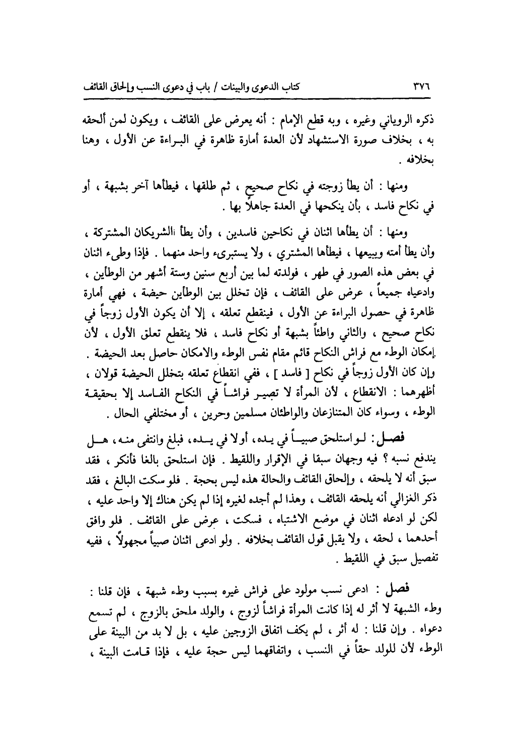 ذكره الروياني وغيره، وبه قطع الامام أنه يعرض على القائف، ويكون لمن ألحقه به، بخلاف صورة الاستشهاد لان العدة أمارة ظاهرة في البراءة عن الاول، وهنا بخلافه. ومنها: أن يطأ زوجته في نكاح صحيح، ثم طلقها، فيطأها آخر بشبهة، أو في نكاح فاسد، بأن ينكحها في العدة جاهلا بها. ومنها: أن يطأها اثنان في نكاحين فاسدين، وأن يطأ الشريكان المشتركة، وأن يطأ أمته ويبيعها، فيطأها المشتري، ولا يستبرئ واحد منهما. فإذا وطئ اثنان في بعض هذه الصور في طهر، فولدته لما بين أربع سنين وستة أشهر من الوطأين، وادعياه جميعا، عرض على القائف، فإن تخلل بين الوطأين حيضة، فهي أمارة ظاهرة في حصول البراءة عن الاول، فينقطع تعلقه، إلا أن يكون الاول زوجا في نكاح صحيح، والثاني واطئا بشبهة أنكاح فاسد، فلا ينقطع تعلق الاول، لان إمكان الوطئ مع فراش النكاح قائم مقام نفس الوطئ والامكان حاصل بعد الحيضة. وإن كان الاول زوجا في نكاح فاسد، ففي انقطاع تعلقه بتخلل الحيضة قولان، أظهرهما: الانقطاع، لان المرأة لا تصير فراشا في النكاح الفاسد إلا بحقيقة الوطئ، وسواء كان المتنازعان والواطئان مسلمين وحرين، أو مختلفي الحال. فصل لو استلحق صبيا في يده، أولا في يده، فبلغ وانتفى منه، هل يندفع نسبه ؟ فيه وجهان سبقا في الاقرار واللقيط. فإن استلحق بالغا فأنكر، فقد سبق أنه لا يلحقه، وإلحاق القائف والحالة هذه ليس بحجة. فلو سكت البالغ، فقد ذكر الغزالي أنه يلحقه القائف، وهذا لم أجده لغيره إذا لم يكن هناك إلا واحد عليه، لكن لو ادعاه اثنان في موضع الاشتباه، فسكت، عرض على القائف. فلو وافق أحدهما، لحقه، ولا يقبل قول القائف بخلافه. ولو ادعى اثنان صبيا مجهولا ففيه تفصيل سبق في اللقيط. فصل ادعى نسب مولود على فراش غيره بسبب وطئ شبهة، فإن قلنا: وطئ الشبهة لا أثر له إذا كانت المرأة فراشا لزوج، والولد ملحق بالزوج، لم تسمع دعواه. وإن قلنا: له أثر، لم يكف اتفاق الزوجين عليه، بل لا بد من البينة على الوطئ لان للولد حقا في النسب، واتفاقهما ليس حجة عليه، فإذا قامت البينة،