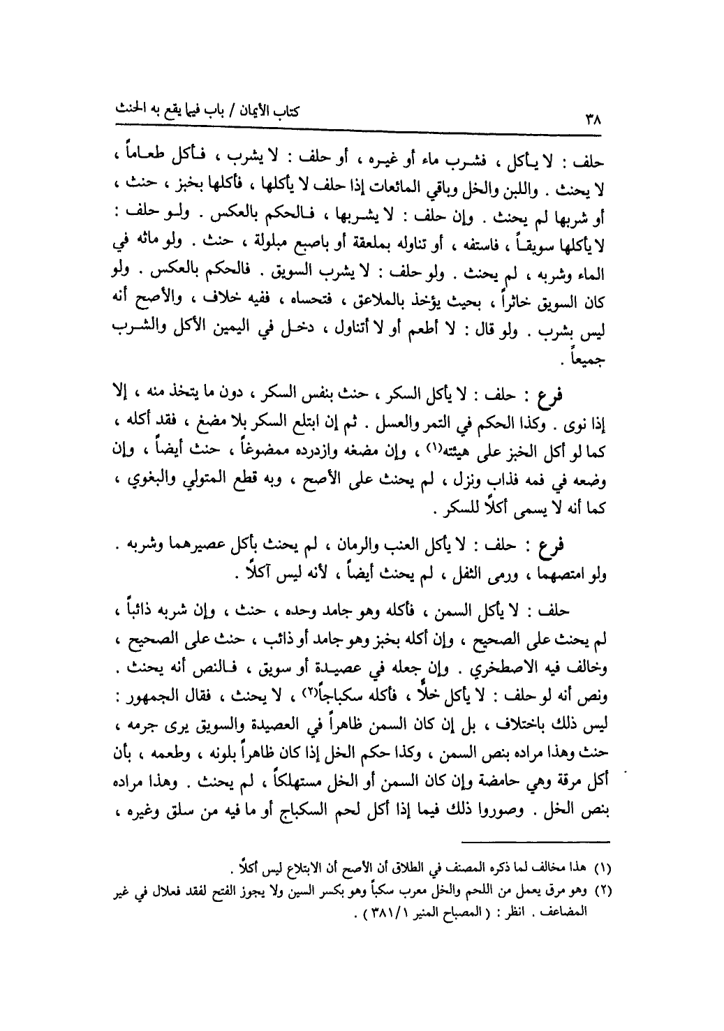 حلف: لا يأكل، فشرب ماء أو غيره، أو حلف: لا يشرب، فأكل طعاما، لا يحنث. واللبن والخل وباقي المائعات إذا حلف لا يأكلها، فأكلها بخبز، حنث، أو شربها لم يحنث. وإن حلف: لا يشربها، فالحكم بالعكس. ولو حلف: لا يأكل سويقا، فاستفه، أو تناوله بملعقة أو باصبع مبلولة، حنث. ولو ماثه في الماء وشربه، لم يحنث. ولو حلف: لا يشرب السويق، فالحكم بالعكس. ولو كان السويق خاثرا، بحيث يؤخذ بالملاعق، فتحساه، ففيه خلاف، والاصح أنه ليس بشرب. ولو قال: لا أطعم أو لا أتناول، دخل في اليمين الاكل والشرب جميعا. فرع حلف: لا يأكل السكر، حنث بنفس السكر، دون ما يتخذ منه، إلا إذا نوى. وكذا الحكم في التمر والعسل. ثم إن ابتلع السكر بلا مضغ، فقد أكله، كما لو أكل الخبز على هيئته، وإن مضغه وازدرده ممضوغا، حنث أيضا، وإن وضعه في فمه فذاب ونزل، لم يحنث على الاصح، وبه قطع المتولي والبغوي، كما أنه لا يسمى أكلا للسكر. فرع حلف: لا يأكل العنب والرمان، لم يحنث بأكل عصيرهما وشربه. ولو امتصهما، ورمى الثفل، لم يحنث أيضا، لانه ليس آكلا. حلف: لا يأكل السمن، فأكله وهو جامد وحده، حنث، وإن شربه ذائبا، لم يحنث على الصحيح، وإن أكله بخبز وهو جامد أو ذائب، حنث على الصحيح، وخالف فيه الاصطخري. وإن جعله في عصيدة أو سويق، فالنص أنه يحنث ونص أنه لو حلف: لا يأكل خلا، فأكله سكباجا، لا يحنث، فقال الجمهور: ليس ذلك باختلاف، بل إن كان السمن ظاهرا في العصيدة والسويق يرى جرمه، حنث وهذا مراده بنص السمن، وكذا حكم الخل إذا كان ظاهرا بلونه، وطعمه، بأن أكل مرقة وهي حامضة وإن كان السمن أو الخل مستهلكا، لم يحنث. وهذا مراده بنص الخل. وصوروا ذلك فيما إذا أكل لحم السكباج أو ما فيه من سلق وغيره،