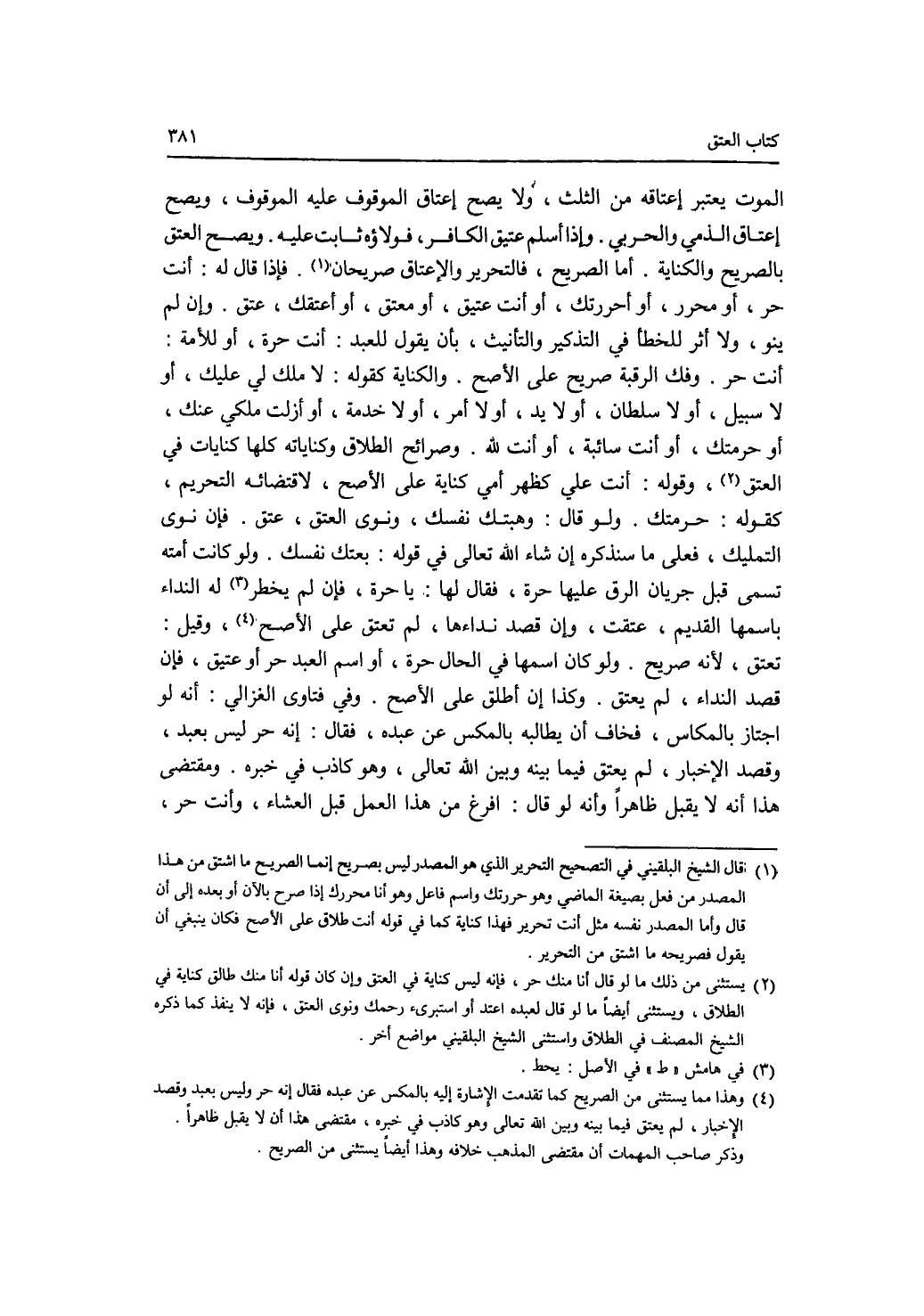 الموت يعتبر إعتاقه من الثلث، ولا يصح إعتاق الموقوف عليه الموقوف، ويصح إعتاق الذمي والحربي. وإذا أسلم عتيق الكافر، فولاؤه ثابت عليه. ويصح العتق بالصريح والكناية أما الصريح، فالتحرير والاعتاق صريحان، فإذا قال له: أنت حر، أو محرر، أو أحررتك، أو أنت عتيق، أو معتق، أو أعتقتك، عتق. وإن لم ينو، ولا أثر للخطأ في التذكير والتأنيث، بأن يقول للعبد: أنت حرة، أو للامة: أنت حر. وفك الرقبة صريح على الاصح. والكناية كقوله: لا ملك لي عليك، أو لا سبيل، أو لا سلطان، أو لا يد، أو لا أمر، أو لا خدمة، أو أزلت ملكي عنك، أو حرمتك، أو أنت سائبة، أو أنت لله. وصرائح الطلاق وكناياته كلها كنايات في العتق. وقوله: أنت علي كظهر أمي كناية على الاصح، لاقتضائه التحريم، كقوله: حرمتك. ولو قال: وهبتك نفسك، ونوى العتق، عتق. فإن نوى التمليك، فعلى ما سنذكره إن شاء الله تعالى في قوله: بعتك نفسك. ولو كانت أمته تسمى قبل جريان الرق عليها حرة، فقال لها: يا حرة، فإن لم يخطر له النداء باسمها القديم، عتقت، وإن قصد نداءها، لم تعتق على الاصح، وقيل: تعتق، لانه صريح. ولو كان اسمها في الحال حرة، أو اسم العبد حر أو عتيق، فإن قصد النداء، لم يعتق. وكذا إن أطلق على الاصح. وفي فتاوى الغزالي: أنه لو اجتاز بالمكاس، فخاف أن يطالبه بالمكس عن عبده، فقال: إنه حر لبس بعبد، وقصد الاخبار، لم يعتق فيما بينه وبين الله تعالى، وهو كاذب في خبره. ومقتضى هذا أنه لا يقبل ظاهرا وأنه لو قال: افرغ من هذا العمل قبل العشاء، وأنت حر،