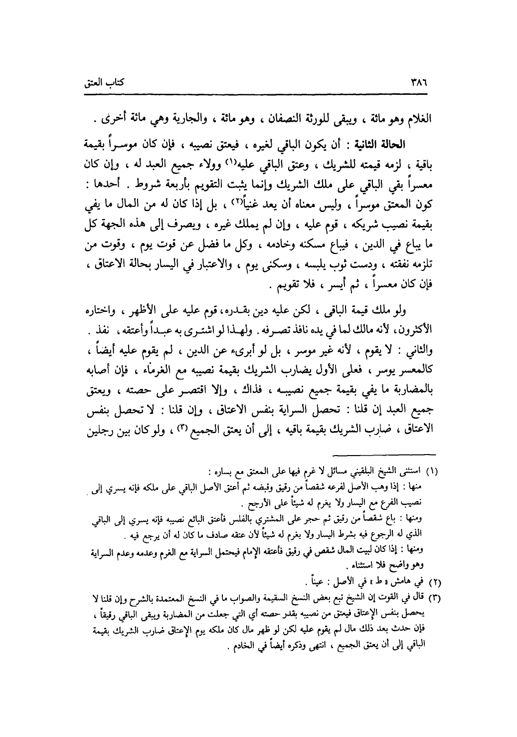 الغلام وهو مائة، ويبقى للورثة النصفان، وهو مائة، والجارية وهي مائة أخرى. الحالة الثانية: أن يكون الباقي لغيره، فيعتق نصيبه، فإن كان موسرا بقيمة باقية، لزمه قيمته للشريك، وعتق الباقي عليه وولاء جميع العبد له، وإن كان معسرا الباقي على ملك الشريك وإنما يثبت التقويم بأربعة شروط. أحدها: كون المعتق موسرا وليس معناه أن يعد غنيا، بل إذا كان له من المال ما يفي بقيمة نصيب شريكه، قوم عليه، وإن لم يملك غيره، ويصرف إلى هذه الجهة كل ما يباع في الدين، فيباع مسكنه وخادمه، وكل ما فضل عن قوت يوم، وقوت من تلزمه نفقته، ودست ثوب يلبسه، وسكنى يوم، والاعتبار في اليسار بحالة الاعتاق، فإن كان معسرا، ثم أيسر، فلا تقويم. ولو ملك قيمة الباقي، لكن عليه دين بقدره، قوم عليه على الاظهر، واختاره الاكثرون، لانه مالك لما في يده نافذ تصرفه. ولهذا لو اشترى به عبدا وأعتقه، نفذ. والثاني: لا يقوم، لانه غير موسر، بل لو أبرئ عن الدين، لم يقوم عليه أيضا، كالمعسر يوسر، فعلى الاول يضارب الشريك بقيمة نصيبه مع الغرماء، فإن أصابه بالمضاربة ما يفي بقيمة جميع نصيبه، فذاك، وإلا اقتصر على حصته، ويعتق جميع العبد إن قلنا: تحصل السراية بنفس الاعتاق، وإن قلنا: لا تحصل بنفس الاعتاق، ضارب الشريك بقيمة باقيه، إلى أن يعتق الجميع. ولو كان بين رجلين