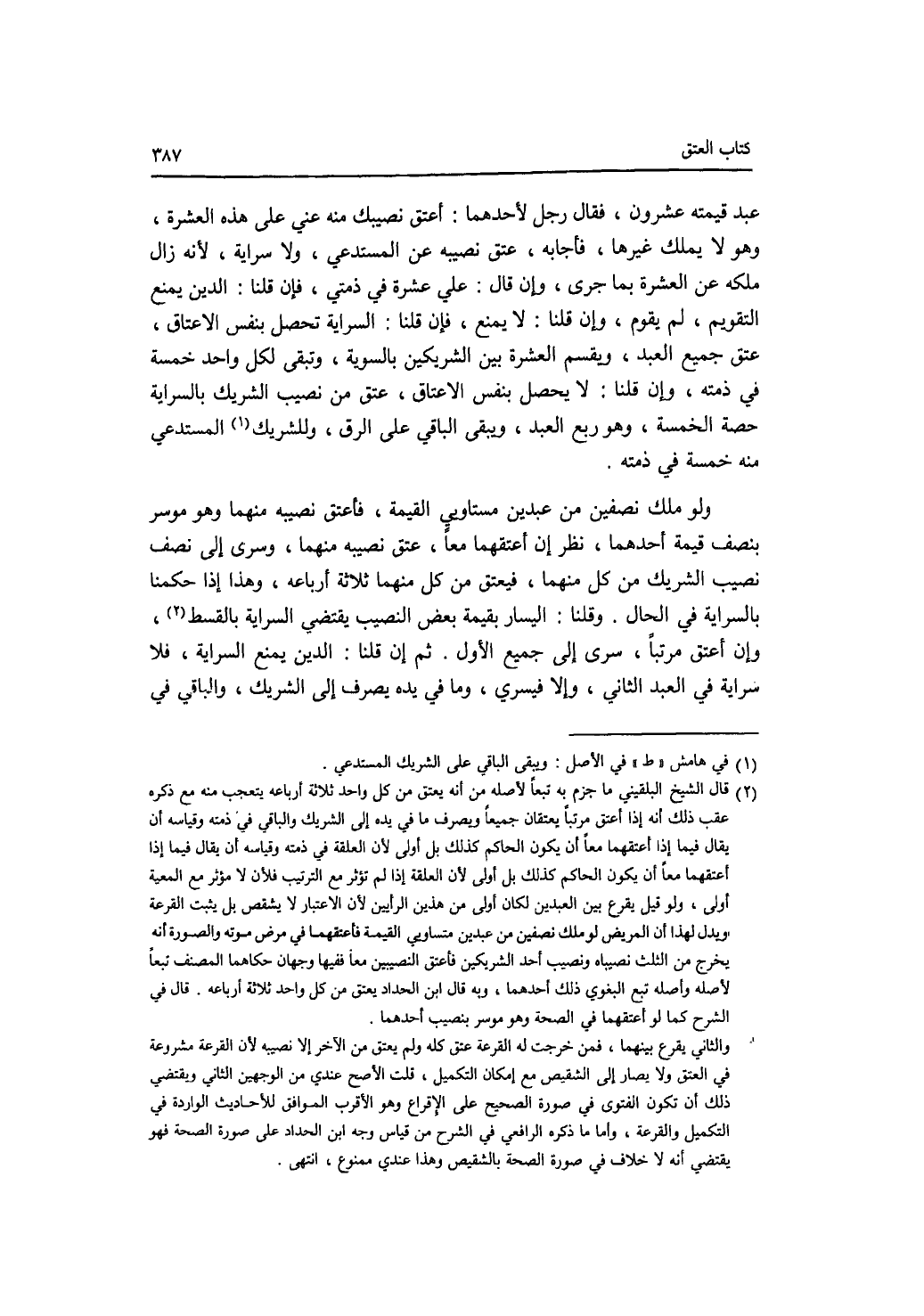عبد قيمته عشرون، فقال رجل لاحدهما: أعتق نصيبك منه عني على هذه العشرة، وهو لا يملك غيرها، فأجابه، عتق نصيبه عن المستدعي، ولا سراية، لانه زال ملكه عن العشرة بما جرى، وإن قال: علي عشرة في ذمتي، فإن قلنا: الدين يمنع التقويم، لم يقوم، وإن قلنا: لا يمنع، فإن قلنا: السراية تحصل بنفس الاعتاق، عتق جميع العبد، ويقسم العشرة بين الشريكين بالسوية، وتبقى لكل واحد خمسة في ذمته، وإن قلنا: لا يحصل بنفس الاعتاق، عتق من نصيب الشريك بالسراية حصة الخمسة، وهو ربع العبد، ويبقى الباقي على الرق، وللشريك المستدعي منه خمسة في ذمته. ولو ملك نصفين من عبدين متساويي القيمة، فأعتق نصيبه منهما وهو موسر بنصف قيمة أحدهما، نظر إن أعتقهما معا، عتق نصيبه منهما، وسرى إلى نصف نصيب الشريك من كل منهما، فيعتق من كل منهما ثلاثة أرباعه، وهذا إذا حكمنا بالسراية في الحال. وقلنا: اليسار بقيمة بعض النصيب يقتضي السراية بالقسط، وإن أعتق مرتبا، سرى إلى جميع الاول. ثم إن قلنا: الدين يمنع السراية، فلا سراية في العبد الثاني، وإلا فيسري، وما في يده يصرف إلى الشريك، والباقي في