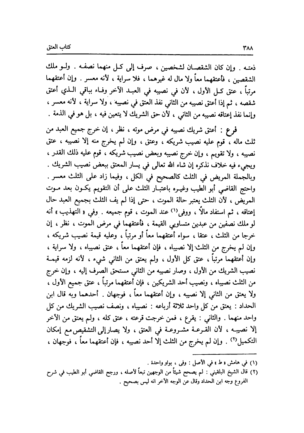ذمته. وإن كان الشقصان لشخصين، صرف إلى كل منهما نصفه. ولو ملك الشقصين، فأعتقهما معا ولا مال له غيرهما، فلا سراية، لانه معسر. وإن أعتقهما مرتبا، عتق كل الاول، لان في نصيبه في العبد الآخر وفاء بباقي الذي أعتق شقصه، ثم إذا أعتق نصيبه من الثاني نفذ العتق في نصيبه، ولا سراية، لانه معسر، وإنما نفذ إعتاقه نصيبه من الثاني، لان حق الشريك لا يتعين فيه، بل هو في الذمة. فرع أعتق شريك نصيبه في مرض موته، نظر، إن خرج جميع العبد من ثلث ماله، قوم عليه نصيب شريكه، وعتق، وإن لم يخرج منه إلا نصيبه، عتق نصيبه، ولا تقويم، وإن خرج نصيبه وبعض نصيب شريكه، قوم عليه ذلك القدر، ويجئ فيه خلاف نذكره إن شاء الله تعالى في يسار المعتق ببعض نصيب الشريك. وبالجملة المريض في الثلث كالصحيح في الكل، وفيما زاد على الثلث معسر. واحتج القاضي أبو الطيب وغيره باعتبار الثلث على أن التقويم يكون بعد موت المريض، لان الثلث يعتبر حالة الموت، حتى إذا لم يف الثلث بجميع العبد حال إعتاقه، ثم استفاد مالا، ووفى عند الموت، قوم جميعه. وفي التهذيب أنه لو ملك نصفين من عبدين متساويي القيمة، فأعتقهما في مرض الموت، نظر، إن خرجا من الثلث، عتقا، سواء أعتقهما معا أو مرتبا، وعليه قيمة نصيب شريكه، وإن لم يخرج من الثلث إلا نصيباه، فإن أعتقهما معا، عتق نصيباه، ولا سراية، وإن أعتقهما مرتبا، عتق كل الاول، ولم يعتق من الثاني شئ، لانه لزمه قيمة نصيب الشريك من الاول، وصار نصيبه من الثاني مستحق الصرف إليه، وإن خرج من الثلث نصيباه، ونصيب أحد الشريكين، فإن أعتقهما مرتبا، عتق جميع الاول، ولا يعتق من الثاني إلا نصيبه، وإن أعتقهما معا فوجهان. أحدهما وبه قال ابن الحداد: يعتق من كل واحد ثلاثة أرباعه: نصيباه، ونصف نصيب الشريك من كل واحد منهما. والثاني: يقرع، فمن خرجت قرعته، عتق كله، ولم يعتق من الآخر إلا نصيبه، لان القرعة مشروعة في العتق، ولا يصار إلى التشقيص مع إمكان التكميل. وإن لم يخرج من الثلث إلا أحد نصيبه، فإن أعتقهما معا، فوجهان،