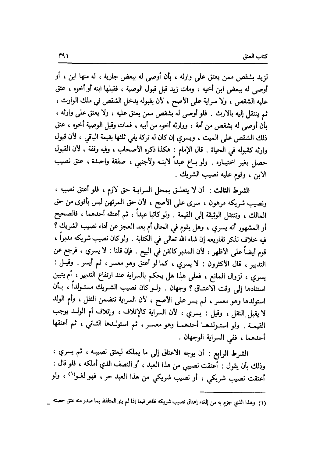 لزيد بشقص ممن يعتق على وارثه، بأن أوصى له ببعض جارية، له منها ابن، أو أوصى له ببعض ابن أخيه، ومات زيد قبل قبول الوصية، فقبلها ابنه أو أخوه، عتق عليه الشقص، ولا سراية على الاصح، لان بقبوله يدخل الشقص في ملك الوارث، ثم ينتقل إليه بالارث. فلو أوصى له بشقص ممن يعتق عليه، ولا يعتق على وارثه، بأن أوصى له بشقص من أمة، ووارثه أخوه من أبيه، فمات وقبل الوصبة أخوه، عتق ذلك الشقص على الميت، ويسري إن كان له تركة يفي ثلثها بقيمة الباقي، لان قبول وارثه كقبوله في الحياة. قال الامام: هكذا ذكره الاصحاب، وفيه وقفة، لان القبول حصل بغير اختياره. ولو باع عبدا لابنه ولاجنبي، صفقة واحدة، عتق نصيب الابن، وقوم عليه نصيب الشريك. الشرط الثالث: أن لا يتعلق بمحل السراية حق لازم، فلو أعتق نصيبه، ونصيب شريكه مرهون، سرى على الاصح، لان حق المرتهن ليس بأقوى من حق المالك، وتنتقل الوثيقة إلى القيمة. ولو كاتبا عبدا، ثم أعتقه أحدهما، فالصحيح أو المشهور أنه يسري، وهل يقوم في الحال أم بعد العجز عن أداء نصيب الشريك ؟ فيه خلاف نذكر تفاريعه إن شاء الله تعالى في الكتابة. ولو كان نصيب شريكه مدبرا، قوم أيضا على الاظهر، لان المدبر كالقن في البيع. فإن قلنا: لا يسري، فرجع عن التدبير، قال الاكثرون: لا يسري، كما لو أعتق وهو معسر، ثم أيسر. وقيل: يسري، لزوال المانع، فعلى هذا هل يحكم بالسراية عند ارتفاع التدبير، أم يتبين استنادها إلى وقت الاعتاق ؟ وجهان. ولو كان نصيب الشريك مستولدا، بأن استولدها وهو معسر، لم يسر على الاصح، لان السراية تتضمن النقل، وأم الولد لا يقبل النقل، وقيل: يسري، لان السراية كالاتلاف، وإتلاف أم الولد يوجب القيمة ولو استولدها أحدهما وهو معسر، ثم استولدها الثاني، ثم أعتقها أحدهما، ففي السراية الوجهان. الشرط الرابع: أن يوجه الاعتاق إلى ما يملكه ليعتق نصيبه، ثم يسري، وذلك بأن يقول: أعتقت نصيبي من هذا العبد، أو النصف الذي أملكه، فلو قال: أعتقت نصيب شريكي، أو نصيب شريكي من هذا العبد حر، فهو لغو، ولو