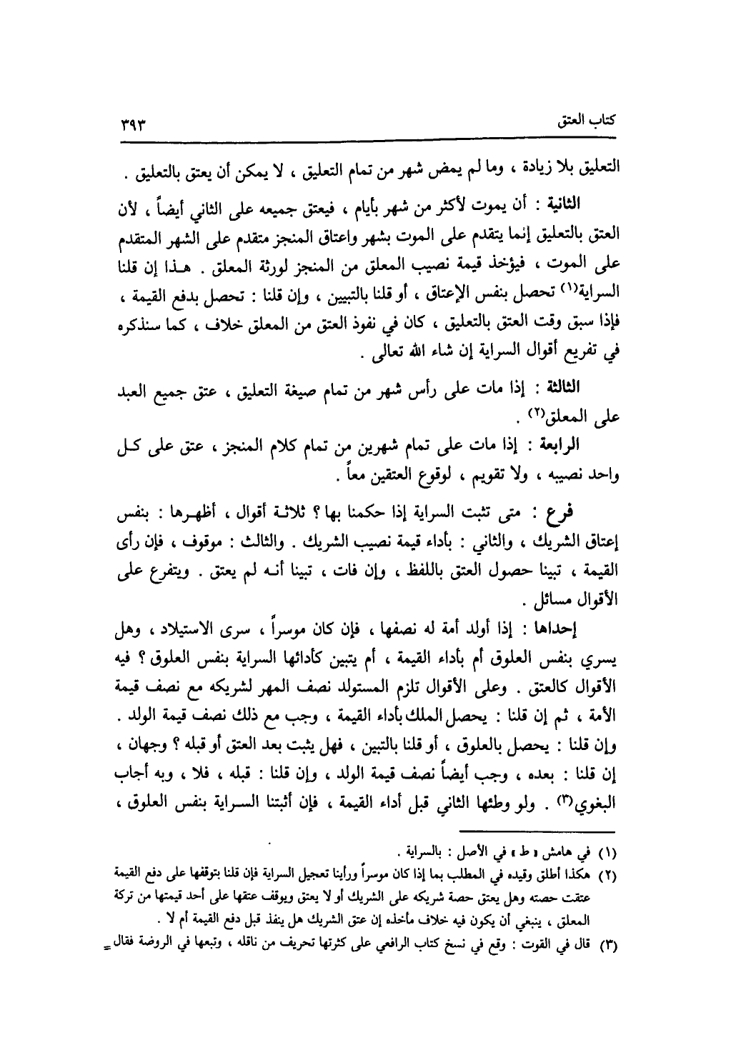 التعليق بلا زيادة، وما لم يمض شهر من تمام التعليق، لا يمكن أن يعتق بالتعليق. الثانية: أن يموت لاكثر من شهر بأيام، فيعتق جميعه على الثاني أيضا، لان العتق بالتعليق إنما يتقدم على الموت بشهر واعتاق المنجز متقدم على الشهر المتقدم على الموت، فيؤخذ قيمة نصيب المعلق من المنجز لورثة المعلق. هذا إن قلنا السراية تحصل بنفس الاعتاق، أو قلنا بالتبيين، وإن قلنا: تحصل بدفع القيمة، فإذا سبق وقت العتق بالتعليق، كان في نفوذ العتق عن المعلق خلاف، كما سنذكره في تفريع أقوال السراية إن شاء الله تعالى. الثالثة: إذا مات على رأس شهر من تمام صيغة التعليق، عتق جميع العبد على المعلق. الرابعة: إذا مات على تمام شهرين من تمام كلام المنجز، عتق على كل واحد نصيبه، ولا تقويم، لوقوع العتقين معا. فرع متى تثبت السراية إذ حكمنا بها ؟ ثلاثة أقوال، أظهرها: بنفس إعتاق الشريك، والثاني: بأداء قيمة نصيب الشريك. والثالث: موقوف، فإن رأى القيمة، تبينا حصول العتق باللفظ، وإن فات، تبينا أنه لم يعتق. ويتفرع على الاقوال مسائل. إحداها: إذا أولد أمة له نصفها، فإن كان موسرا، سرى الاستيلاد، وهل يسري بنفس العلوق أم بأداالقيمة، أم يتبين كأدائها السراية بنفس العلوق ؟ فيه الاقوال كالعتق. وعلى الاقوال تلزم المستولد نصف المهر لشريكه مع نصف قيمة الامة، ثم إن قلنا: يحصل الملك بأداء القيمة، وجب مع ذلك نصف قيمة الولد. وإن قلنا: يحصل بالعلوق، أو قلنا بالتبين، فهل يثبت بعد العتق أو قبله ؟ وجهان، إن قلنا: بعده، وجب أيضا نصف قيمة الولد، وإن قلنا: قبله، فلا، وبه أجاب البغوي. ولو وطئها الثاني قبل أداء القيمة، فإن أثبتنا السراية بنفس العلوق،