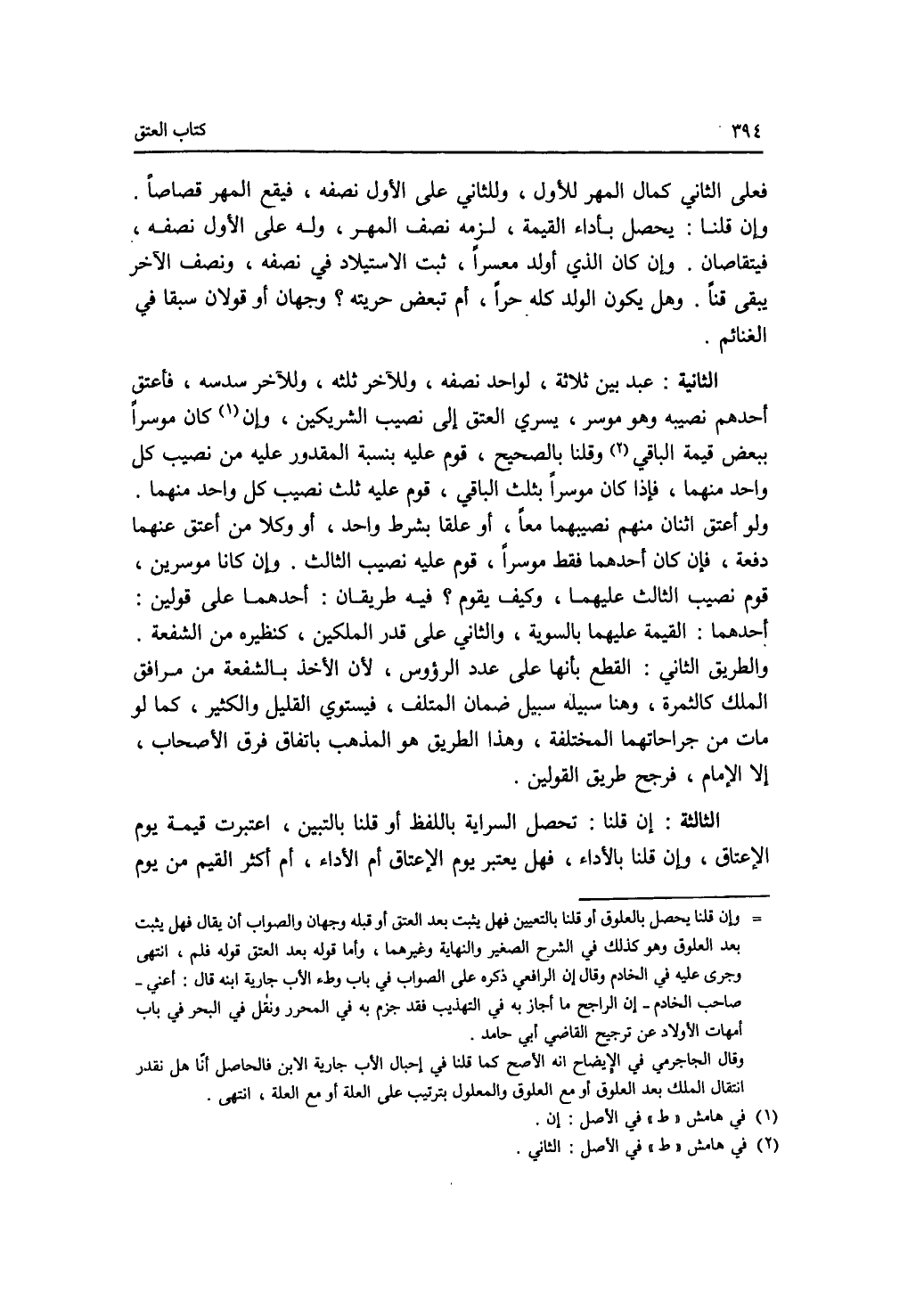 فعلى الثاني كمال المهر للاول، وللثاني على الاول نصفه، فيقع المهر قصاصا. وإن قلنا: يحصل بأداء القيمة، لزمه نصف المهر، وله على الاول نصفه، فيتقاصان. وإن كان الذي أولد معسرا، ثبت الاستيلاد في نصفه، ونصف الآخر يبقى قنا. وهل يكون الولد كله حرا، أم تبعض حريته ؟ وجهان أو قولان سبقا في الغنائم. الثانية: عبد بين ثلاثة، لواحد نصفه، وللآخر ثلثه، وللآخر سدسه، فأعتق أحدهم نصيبه وهو موسر، يسري العتق إلى نصيب الشريكين، وإن كان موسرا ببعض قيمة الباقي وقلنا بالصحيح، قوم عليه بنسبة المقدور عليه من نصيب كل واحد منهما، فإذا كان موسرا بثبث الباقي، قوم عليه ثلث نصيب كل واحد منهما. ولو أعتق اثنان منهم نصيبهما معا، أو علقا بشرط واحد، أو وكلا من أعتق عنهما دفعة، فإن كان أحدهما فقط موسرا، قوم عليه نصيب الثالث. وإن كانا موسرين، قوم نصيب الثالث عليهما، وكيف يقوم ؟ فيه طريقان: أحدهما على قولين: أحدهما: القيمة عليها بالسوية، الثاني على قدر الملكين، كنظيره من الشفعة والطريق الثاني: القطع بأنها على عدد الرؤوس، لان الاخذ بالشفعة من مرافق الملك كالثمرة، وهنا سبيله سبيل ضمان المتلف، فيستوي القليل والكثير، كما لو مات من جراحاتها المختلفة، وهذا الطريق هو المذهب باتفاق فرق الاصحاب، إلا الامام، فرجح طريق القولين. الثالثة: إن قلنا: تحصل السراية باللفظ أو قلنا بالتبين، اعتبرت قيمة يوم الاعتاق، وإن قلنا: بالاداء، فهل يعتبر يوم الاعتاق أم الاداء، أم أكثر القيم من يوم