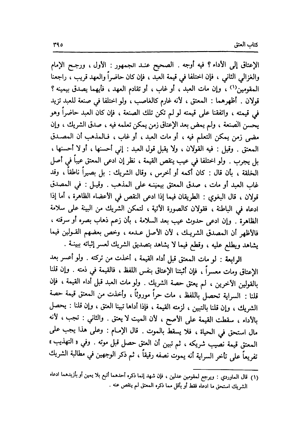 الاعتاق إلى الاداء ؟ فيه أوجه. الصحيح عند الجمهور: الاول، ورجح الامام والغزالي الثاني، فإن اختلفا في قيمة العبد، فإن كان حاضرا والعهد قريب، راجعنا المقومين، وإن مات العبد، أو غاب، أو تقادم العهد، فأيهما يصدق بيمينه ؟ قولان. أظهرهما: المعتق، لانه غارم كالغاصب، ولو اختلفا في صنعة للعبد تزيد في قيمته، واتفقنا على قيمته لو لم تكن تلك الصنعة، فإن كان العبد حاضرا وهو يحسن الصنعة، ولم يمض بعد الاعتاق زمن يمكن تعلمه فيه، صدق الشريك، وإن مضى زمن يمكن التعلم فيه، أو مات العبد، أو غاب، فالمذهب أن المصدق المعتق. وقيل: فيه القولان، ولا يقبل قول العبد: إني أحسنها، أو لا أحسنها، بل يجرب. ولو اختلفا في عيب ينقص القيمة، نظر إن ادعى المعتق عيبا في أصل الخلقة، بأن قال: كان أكمه أو أخرس، وقال الشريك: بل بصيرا ناطقا، وقد غاب العبد أو مات، صدق المعتق بيمينه على المذهب. وقيل: في المصدق قولان، قال البغوي: الطريقان فيما إذا ادعى النقص في الاعضاء الظاهرة، أما إذا ادعاه في الباطنة، فقولان كالصورة الآتية، لتمكن الشريك من البينة على سلامة الظاهرة. وإن ادعى حدوث عيب بعد السلامة، بأن زعم ذهاب بصره أو سرقته، فالاظهر أن المصدق الشريك، لان الاصل عدمه، وخص بعضهم القولين فيما يشاهد ويطلع عليه، وقطع فيما لا يشاهد بتصديق الشريك لعسر إثباته ببينة. الرابعة: لو مات المعتق قبل أداء القيمة، أخذت من تركته. ولو أعسر بعد الاعتاق ومات معسرا، فإن أثبتنا الاعتاق بنفس اللفظ، فالقيمة في ذمته وإن قلنا بالقولين الآخرين، لم يعتق حصة الشريك. ولو مات العبد قبل أداء القيمة، فإن قلنا: السراية تحصل باللفظ، مات حرا موروثا، وأخذت من المعتق قيمة حصة الشريك، وإن قلنا بالتبيين، لزمته القيمة، فإذا أداها تبينا العتق، وإن قلنا: يحصل بالاداء، سقطت القيمة على الاصح، لان الميت لا يعتق. والثاني: تجب، لانه مال استحق في الحياة، فلا يسقط بالموت. قال الامام: وعلى هذا يجب على المعتق قيمة نصيب شريكه، ثم تبيين أن العتق حصل قبل موته. وفي التهذيب تفريعا على تأخر السراية أنه يموت نصفه رقيقا، ثم ذكر الوجهين في مطالبة الشريك