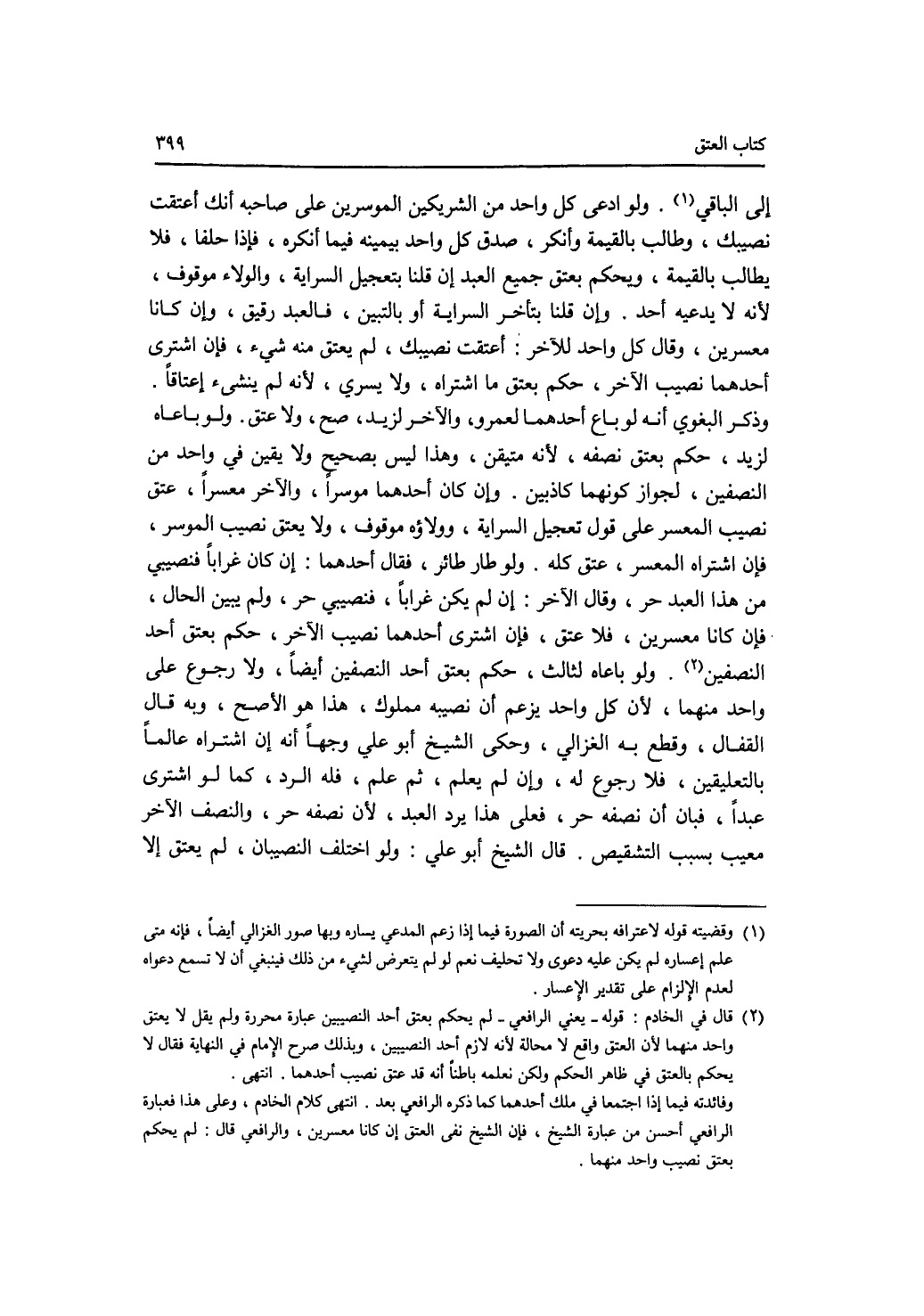إلى الباقي. ولو ادعى كل واحد من الشريكين الموسرين على صاحبه أنك أعتقت نصيبك، وطالب بالقيمة، وأنكر، صدق كل واحد بيمينه فيما أنكره، فإذا حلفا، فلا يطالب بالقيمة، ويحكم بعتق جميع العبد إن قلنا بتعجيل السراية، والولاء موقوف، لانه لا يدعيه أحد. وإن قلنا بتأخر السراية أو بالتبين، فالعبد رقيق، وإن كانا معسرين، وقال كل واحد للآخر: أعتقت نصيبك، لم يعتق منه شئ، فإن اشترى أحدهما نصيب الآخر، حكم بعتق ما اشتراه، ولا يسري، لانه لم ينشئ إعتاقا. وذكر البغوي أنه لو باع أحدهما لعمرو، والآخر لزيد، صح، ولا عتق. ولو باعاه لزيد، حكم بعتق نصفه، لانه متيقن، وهذا ليس بصحيح ولا يقين في واحد من النصفين، لجواز كونهما كاذبين. وإن كان أحدهما موسرا، والآخر معسرا، عتق نصيب المعسر على قول تعجيل السراية، وولاؤه موقوف، ولا يعتق نصيب الموسر، فإن اشتراه المعسر، عتق كله. ولو طار طائر، فقال أحدهما: إن كان غرابا، فنصيبي من هذا العبد حر، وقال الآخر: إن لم يكن غرابا، فنصيبي حر، ولم يبين الحال، فإن كانا معسرين، فلا عتق، فإن اشترى أحدهما نصيب الآخر، حكم بعتق أحد النصفين. ولو باعاه لثالث، حكم بعتق أحد النصفين أيضا، ولا رجوع على واحد منهما، لان كل واحد يزعم أن نصيبه مملوك، هذا هو الاصح، وبه قال القفال، وقطع به الغزالي، وحكى الشيخ أبو علي وجها أنه إن اشتراه عالما بالتعليقين، فلا رجوع له، وإن لم يعلم، ثم علم، فله الرد، كما لو اشترى عبدا، فبان أن نصفه حر، فعلى هذا يرد العبد، لان نصفه حر، والنصف الآخر معيب بسبب التشقيص. قال الشيخ أبو علي ولو اختلف النصيبان، لم يعتق إلا