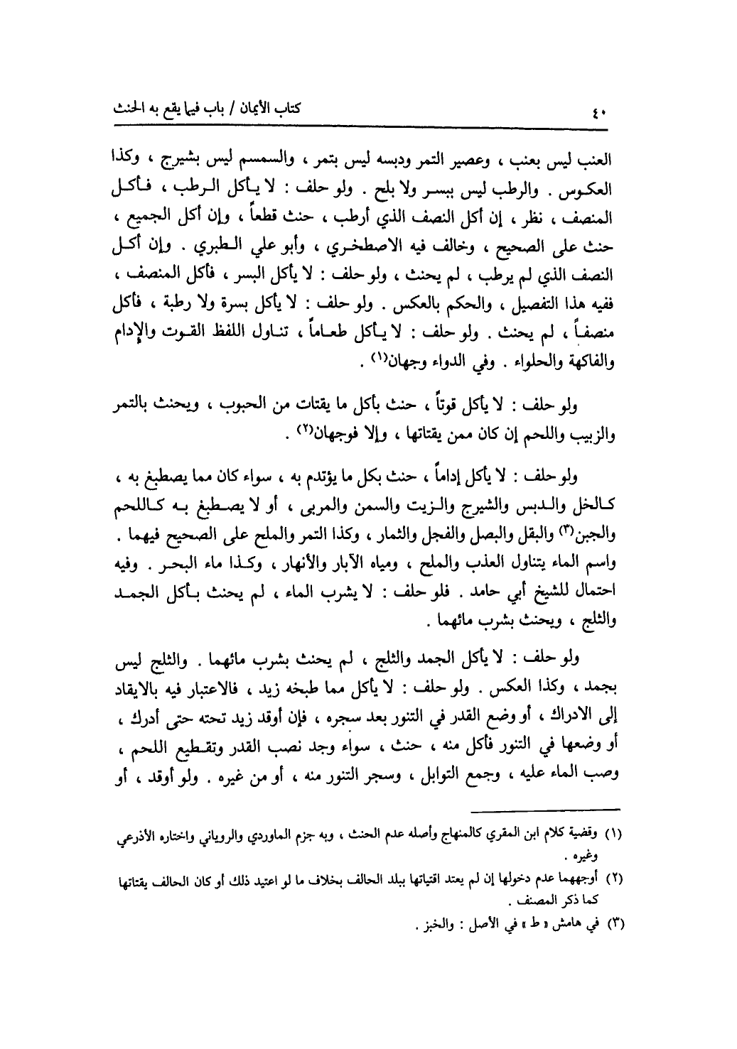 العنب ليس بعنب، وعصير التمر ودبسه ليس س بتمر، والسمسم ليس بشيرج، وكذا العكوس. والرطب ليس ببسر ولا بلح. ولو حلف: لا يأكل الرطب، فأكل المنصف، نظر، إن أكل النصف الذي أرطب، حنث قطعا، وإن أكل الجميع، حنث على الصحيح، وخالف فيه الاصطخري، وأبو علي الطبري. وإن أكل النصف الذي لم يرطب، لم يحنث، ولو حلف: لا يأكل البسر، فأكل المنصف، ففيه هذا التفصيل، والحكم بالعكس. ولو حلف: لا يأكل بسرة ولا رطبة، فأكل منصفا، لم يحنث. ولو حلف: لا يأكل طعام، تناول اللفظ القوت والادام والفاكهة والحلواء. وفي الدواء وجهان. ولو حلف: لا يأكل قوتا، حنث بأكل ما يقتات من الحبوب، ويحنث بالتمر والزبيب واللحم إن كان ممن يقتاتها، وحلا فوجهان. ولو حلف: لا يأكل إداما، حنث بكل ما يؤتدم به، سواء كان مما يصطبغ به، كالخل والدبس والشيرج والزيت والسمن والمربى، أو لا يصطبغ به كاللحم والجبن والبقل والبصل والفجل والثمار، وكذا التمر والملح على الصحيح فيهما. واسم الماء يتناول العذب والملح، ومياه الابار والانهار، وكذا ماء البحر، وفيه احتمال للشيخ أبي حامد. فلو حلف: لا يشرب الماء، لم يحنث بأكل الجمد والثلج، ويحنث بشرب مائهما. ولو حلف: لا يأكل الجمد والثلج، لم يحنث بشرب مائهما. والثلج ليس بجمد، وكذا العكس. ولو حلف: لا يأكل مما طبخه زيد، فالاعتبار فيه بالايقاد إلى الادراك، أو وضع القدر في التنور بعد سجره، فان أوقد زيد تحته حتى أدرك، أو وضعها في التنور فأكل منه، حنث، سواء وجد نصب القدر وتقطيع اللحم، وصب الماء عليه، وجمع التوابل، وسجر التنور منه، أو من غيره. ولو أوقد، أو