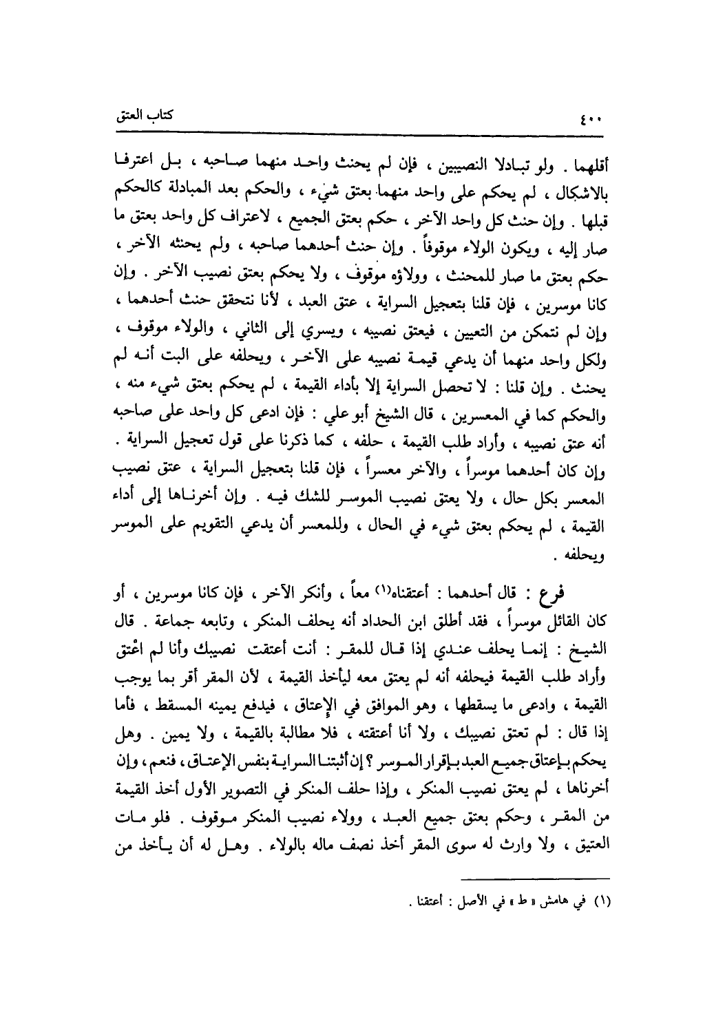 أقلهما. ولو تبادلا النصيبين، فإن لم يحنث واحد منهما صاحبه، بل اعترفا بالاشكال، لم يحكم على واحد منهما بعتق شئ، والحكم بعد المبادلة كالحكم قبلها. وان حنث كل واحد الآخر، حكم بعتق الجميع، لاعتراف كل واحد بعتق ما صار إليه، ويكون الولاء موقوفا. وإن حنث أحدهما صاحبه. ولم يحنثه الآخر، حكم بعتق ما صار للمحنث، وولاؤه موقوف، ولا يحكم بعتق نصيب الآخر. وإن كانا موسرين، فإن قلنا بتعجيل السراية، عتق العبد، لانا نتحقق حنث أحدهما، وإن لم نتمكن من التعيين، فيعتق نصيبه، ويسري إلى الثاني، والولاء موقوف، ولكل واحد منهما أن يدعي قيمة نصيبه على الآخر، ويحلفه على البت أنه لم يحنث. وإن قلنا: لا تحصل السراية إلا بأداء القيمة، لم يحكم بعتق شئ منه، والحكم كما في المعسرين، قال الشيخ أبو علي: فإن ادعى كل واحد على صاحبه أنه عتق نصيبه، وأراد طلب القيمة، حلفه، كما ذكرنا على قول تعجيل السراية. وإن كان أحدهما موسرا، والآخر معسرا، فإن قلنا بتعجيل السراية، عتق نصيب المعسر بكل حال، ولا يعتق نصيب الموسر للشك فبه. وإن أخرناها إلى أدا القيمة، لم يحكم بعتق شئ في الحال، وللمعسر أن يدعي التقويم على الموسر ويحلفه. فرع قال أحدهما: أعتقناه معا، وأنكر الآخر، فإن كانا موسرين، أو كان القائل موسرا، فقد أطلق ابن الحداد أنه يحلف المنكر، وتابعه جماعة. قال الشيخ: إنما يحلف عندي إذا قال للمقر: أنت أعتقت نصيبك وأنا لم أعتق وأراد طلب القيمة فيحلفه أنه لم يعتق معه ليأخذ القيمة، لان المقر أقر بما يوجب القيمة، وادعى ما يسقطها، وهو الموافق في الاعتاق، فيدفع يمينه المسقط، فأما إذا قال: لم تعتق نصيبك، ولا أنا أعتقته، فلا مطالبة بالقيمة، ولا يمين. وهل يحكم بإعتاق جميع العبد بإقرار الموسر ؟ إن أثبتنا السراية بنفس الاعتاق، فنعم، وإن أخرناها، لم يعتق نصيب المنكر، وإذا حلف المنكر في التصوير الاول أخذ القيمة من المقر، وحكم بعتق جميع العبد، وولاء نصيب المنكر موقوف. فلو مات العتيق، ولا وارث له سوى المقر أخذ نصف ماله بالولاء. وهل له أن يأخذ من