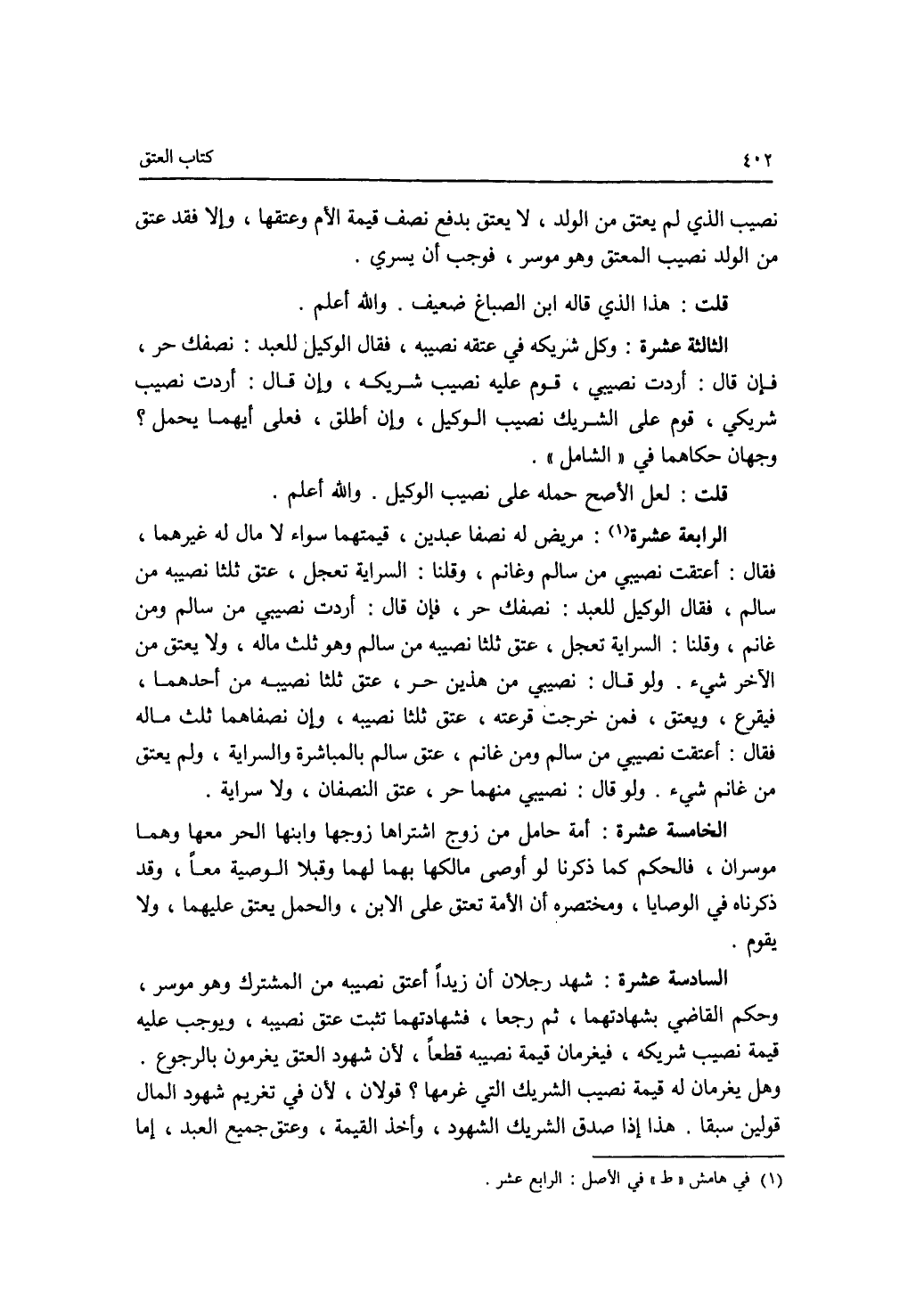 نصيب الذي لم يعتق من الولد، لا يعتق بدفع نصف قيمة الام وعتقها، وإلا فقد عتق من الولد نصيب المعتق وهو موسر، فوجب أن يسري. قلت: هذا الذي قاله ابن الصباغ ضعيف. والله أعلم. الثالثة عشرة: وكل شريكه في عتق نصيبه، فقال الوكيل للعبد: نصفك حر، فإن قال: أردت نصيبي، قوم عليه نصيب شريكه، وإن قال: أردت نصيب شريكي، قوم على الشريك نصيب الوكيل، وإن أطلق، فعلى أيهما يحمل ؟ وجهان حكاهما في الشامل. قلت: لعل الاصح حمله على نصيب الوكيل. والله أعلم. الرابعة عشرة: مريض له نصفا عبدين، قيمتهما سواء لا مال له غيرهما، فقال: أعتقت نصيبي من سالم وغانم، وقلنا: السراية تعجل، عتق ثلثا نصيبه من سالم، فقال الوكيل للعبد: نصفك حر، فإن قال: أردت نصيبي من سالم ومن غانم، وقلنا: السراية تعجل، عتق ثلثا نصيبه من سالم وهو ثلث ماله، ولا يعتق من الآخر شئ. ولو قال: نصيبي من هذين حر، عتق ثلثا نصيبه من أحدهما، فيقرع، ويعتق، فمن خرجت قرعته، عتق ثلثا نصيبه، وإن نصفاهما ثلث ماله فقال: أعتقت نصيبي من سالم ومن غانم، عتق سالم بالمباشرة والسراية، ولم يعتق من غانم شئ. ولو قال: نصيبي منهما حر، عتق النصفان، ولا سراية. الخامسة عشرة: أمة حامل من زوج اشتراها زوجها وابنها الحر معها وهما موسران، فالحكم كما ذكرنا لو أوصى مالكها بهما لهما وقبلا الوصية معا، وقد ذكرناه في الوصايا، ومختصره أن الامة تعتق على الابن، والحمل يعتق عليهما، ولا يقوم. السادسة عشرة: شهد رجلان أن زيدا أعتق نصيبه من المشترك وهو موسر، وحكم القاضي بشهادتهما، ثم رجعا، فشهادتهما تثبت عتق نصيبه، ويوجب عليه قيمة نصيب شريكه، فيغرمان قيمة نصيبه قطعا، لان شهود العتق يغرمون بالرجوع. وهل يغرمان له قيمة نصيب الشريك التي غرمها ؟ قولان، لان في تغريم شهود المال قولين سبقا. هذا إذا صدق الشريك الشهود، وأخذ القيمة، وعتق جميع العبد، اما