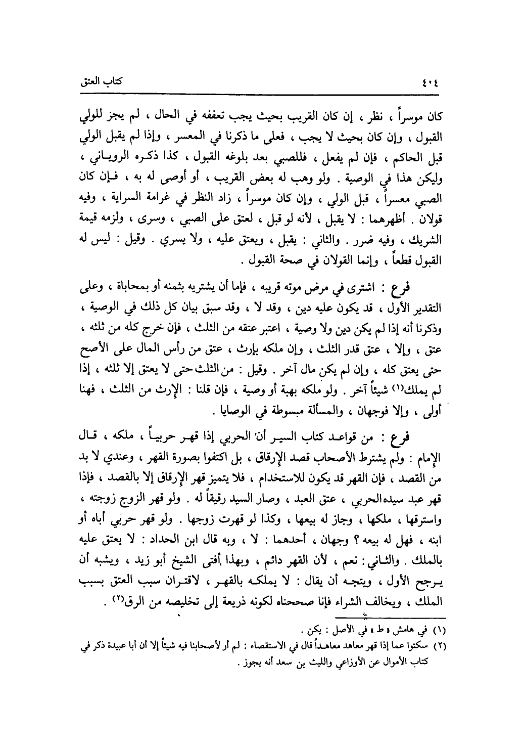كان موسرا، نظر، إن كان القريب بحيث يجب تعففه في الحال، لم يجز للولي القبول، وإن كان بحيث لا يجب، فعلى ما ذكرنا في المعسر، وإذا لم يقبل الولي قبل الحاكم، فإن لم يفعل، فللصبي بعد بلوغه القبول، كذا ذكره الروياني، وليكن هذا في الوصية. ولو وهب له بعض القريب، أو أوصى له به، فإن كان الصبي معسرا، قبل الولي، وإن كان موسرا، زاد النظر في غرامة السراية، وفيه قولان. أظهرهما: لا يقبل، لانه لو قبل، لعتق على الصبي، وسرى، ولزمه قيمة الشريك، وفيه ضرر. والثاني: يقبل، ويعتق عليه، ولا يسري. وقيل: ليس له القبول قطعا، وإنما القولان في صحة القبول. فرع اشترى فمرض موته قريبه، فإما أن يشتريه بثمنه أو بمحاباة، وعلى التقدير الاول، قد يكون عليه دين، وقد لا، وقد سبق بيان كل ذلك في الوصية، وذكرنا أنه إذا لم يكن دين ولا وصية، اعتبر عتقه من الثلث، فإن خرج كله من ثلثه، عتق، وإلا، عتق قدر الثلث، وإن ملكه بإرث، عتق من رأس المال على الاصح حتى يعتق كله، وإن لم يكن مال آخر. وقيل: من الثلث حتى لا يعتق إلا ثلثه، إذا لم يملك شيئا آخر. ولو ملكه بهبة أو وصية، فإن قلنا: الارث من الثلث، فهنا أولى، وإلا فوجهان، والمسألة مبسوطة في الوصايا. فرع من قواعد كتاب السير أن الحربي إذا قهر حربيا، ملكه، قال الامام: ولم يشترط الاصحاب قصد الارقاق، بل اكتفوا بصورة القهر، وعندي لا بد من القصد، فإن القهر قد يكون للاستخدام، فلا يتميز قهر الارقاق إلا بالقصد، فإذا قهر عبد سيده الحربي، عتق العبد، وصار السيد رقيقا له. ولو قهر الزوج زوجته، واسترقها، ملكها، وجاز له بيعها، وكذا لو قهرت زوجها. ولو قهر حربي أباه أو ابنه، فهل له بيعه ؟ وجهان، أحدهما: لا، وبه قال ابن الحداد: لا يعتق عليه بالملك. والثاني: نعم، لان القهر دائم، وبهذا أفتى الشيخ أبو زيد، ويشبه أن يرجح الاول، ويتجه أن يقال: لا يملكه بالقهر، لاقتران سبب العتق بسبب الملك. ويخالف الشراء فإنا صححناه لكونه ذريعة إلى تخليصه من الرق.