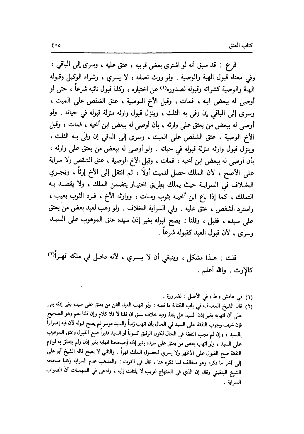 فرع قد سبق أنه لو اشترى بعض قريبه، عتق عليه، وسرى إلى الباقي، وفي معناه قبول الهبة والوصية. ولو ورث نصفه، لا يسري، وشراء الوكيل وقبوله الهبة والوصية كشرائه وقبوله لصدوره عن اختياره، وكذا قبول نائبه شرعا، حتى لو أوصى له ببعض ابنه، فمات، وقبل الاخ الوصية، عتق الشقص على الميت، وسرى إلى الباقي إن وفى به الثلث، وينزل قبول وارثه منزلة قبوله في حياته. ولو أوصى له ببعض من يعتق على وارثه، بأن أوصى له ببعض ابن أخيه، فمات، وقبل الاخ الوصية، عتق الشقص على الميت، وسرى إلى الباقي إن وفى به الثلث، وينزل قبول وارثه منزلة قبوله في حياته. ولو أوصى له ببعض من يعتق على وارثه، بأن أوصى له ببعض ابن أخيه، فمات، وقبل الاخ الوصية، عتق الشقص ولا سراية على الاصح، لان الملك حصل للميت أولا، ثم انتقل إلى الاخ إرثا، ويجري الخلاف في السراية حيث يملك بطريق اختيار يتضمن الملك، ولا يقصد به التملك، كما إذا باع ابن أخيه بثوب ومات، ووارثه الاخ، فرد الثوب بعيب، واسترد الشقص، عتق عليه. وفي السراية الخلاف. ولو وهب لعبد بعض من يعتق على سيده، فقبل، وقلنا: يصح قبوله بغير إذن سيده، عتق الموهوب على السيد، وسرى، لان قبول العبد كقبوله شرعا. قلت: هذا مشكل، وينبغي أن لا يسري، لانه دخل في ملكه قهرا كالارث. والله أعلم.