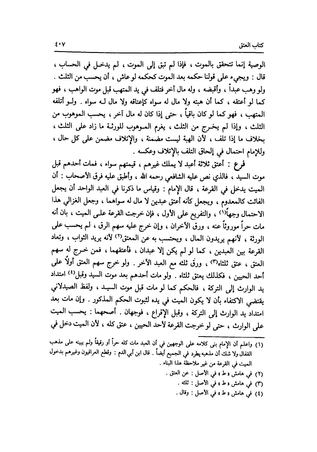 الوصية إنلا تتحقق بالموت، فإذا لم تبق إلى الموت، لم يدخل في الحساب، قال: ويجئ على قولنا حكمه بعد الموت كحكمه لو عاش، أن يحسب من الثلث. ولو وهب عبدا، وأقبضه، وله مال آخر فتلف في يد المتهب قبل موت الواهب، فهو كما لو أعتقه، كما أن هبته ولا مال له سواه كإعتاقه ولا مال له سواه. ولو أتلفه المتهب، فهو كما لو كان باقيا، حتى إذا كان له مال آخر، يحسب الموهوب من الثلث، وإذا لم يخرج من الثلث، يغرم الموهوب للورثة ما زاد على الثلث، بخلاف ما إذا تلف، لان الهبة ليست مضمنة، والاتلاف مضمن على كل حال، وللامام احتمال في إلحاق التلف بالاتلاف وعكسه. فرع أعتق ثلاثة أعبد لا يملك غيرهم قيمتهم سواء، فمات أحدهم قبل موت السيد، فالذي نص عليه الشافعي رحمه الله، وأطبق عليه فرق الاصحاب: أن الميت يدخل في القرعة، قال الامام: وقياس ما ذكرنا في العبد الواحد أن يجعل الفائت كالمعدوم، ويجعل كأنه أعتق عبدين لا مال له سواهما، وجعل الغزالي هذا الاحتمال وجها، والتفريع على الاول، فإن خرجت القرعة على الميت، بان أنه مات حرا موروثا عنه، ورق الآخران، وإن خرج عليه سهم الرق، لم يحسب على الورثة، لانهم يريدون المال، ويحتسب به عن المعتق لانه يريد الثواب، وتعاد القرعة بين العبدين، كما لو لم يكن إلا عبدان، فأعتقهما، فمن خرج له سهم العتق، عتق ثلثاه، ورق ثلثه مع العبد الآخر. ولو خرج سهم العتق أولا على أحد الحيين، فكذلك يعتق ثلثاه. ولو مات أحدهم بعد موت السيد وقبل امتداد يد الوارث إلى التركة، فالحكم كما لو مات قبل موت السيد، ولفظ الصيدلاني يقتضي الاكتفاء بأن لا يكون الميت في يده لثبوت الحكم المذكور. وإن مات بعد امتداد يد الوارث إلى التركة، وقبل الاقراع، فوجهان. أصحهما: يحسب الميت على الوارث، حتى لو خرجت القرعة لاحد الحيين، عتق كله، لان الميت دخل في