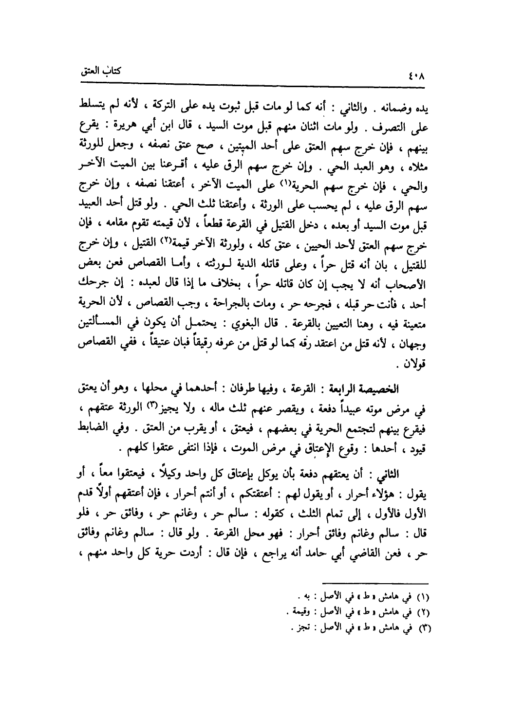الخصيصة الرابعة : القرعة، وفيها طرفان: أحدهما في محلها، وهو أن يعتق في مرض موته عبيدا دفعة، ويقصر عنهم ثلث ماله، ولا يجيز الورثة عتقهم، فيقرع بينهم لتجتمع الحرية في بعضهم، فيعتق، أو يقرب من العتق. وفي الضابط قيود، أحدها: وقوع الاعتاق في مرض الموت، فإذا انتفى عتقوا كلهم. الثاني: أن يعتقهم دفعة بأن يوكل بإعتاق كل واحد وكيلا، فيعتقوا معا، أو يقول: هؤلاء أحرار، أو يقول لهم: أعتقتكم، أو أنتم أحرار، فإن أعتقهم أولا قدم الاول فالاول، إلى تمام الثلث، كقوله: سالم حر، وغانم حر، وفائق حر، فلو قال: سالم وغانم وفائق أحرار: فهو محل القرعة. ولو قال: سالم وغانم وفائق حر، فعن القاضي أبي حامد أنه يراجع، فإن قال: أردت حرية كل واحد منهم،