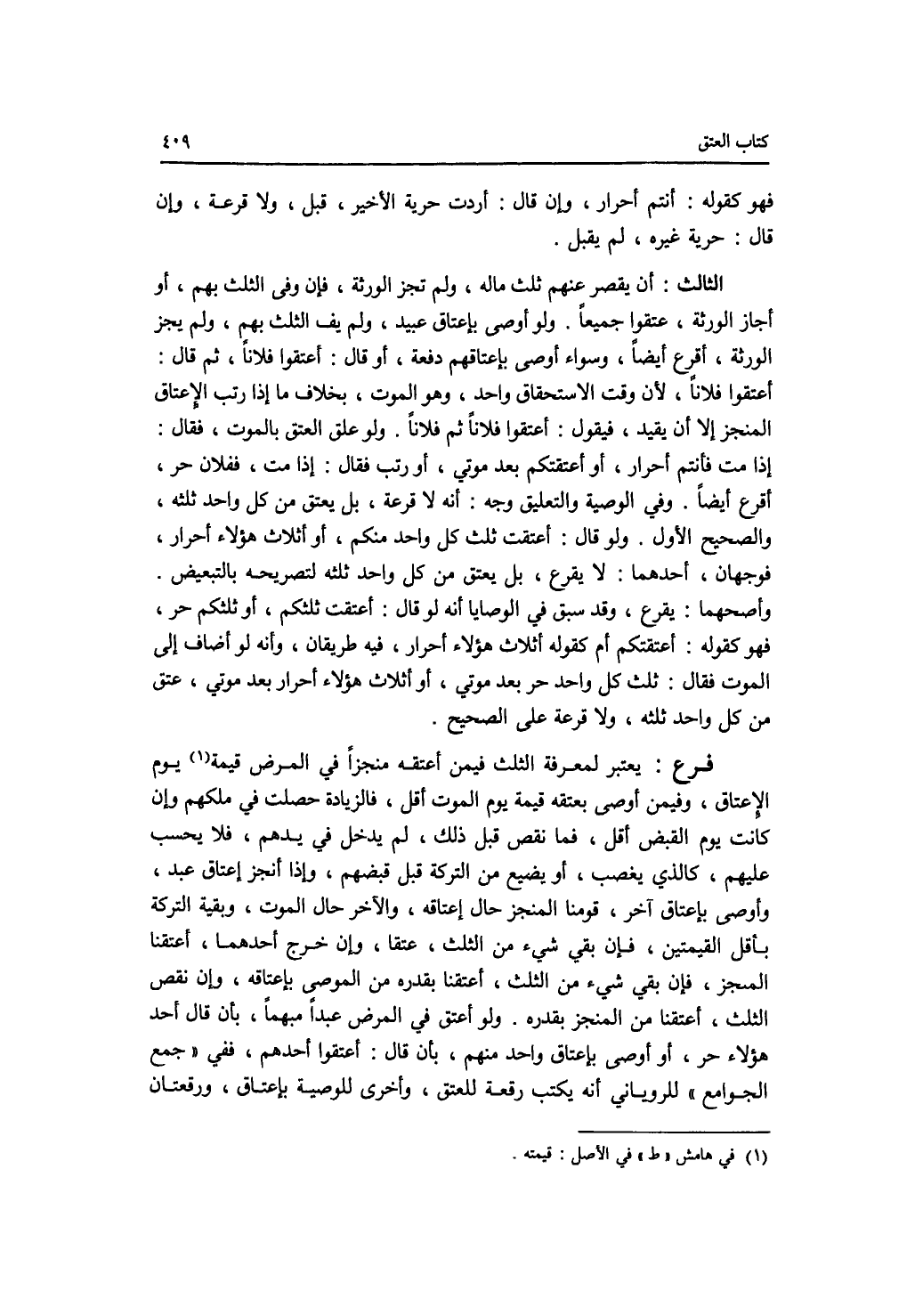فهو كقوله: أنتم أحرار، وإن قال: أردت حرية الاخير، قبل، ولا قرعة، وإن قال: حرية غيره، لم يقبل. الثالث: أن يقصر عنهم ثلث ماله، ولم تجز الورثة، فإن وفى الثلث بهم، أو أجاالورثة، عتقوا جميعا. ولو أوصى بإعتاق عبيد، ولم يف الثلث بهم، ولم يجز الورثة، أقرع أيضا، وسواء أوصى بإعتاقهم دفعة، أو قال: أعتقوا فلانا، ثم قال: أعتقوا فلانا، لان وقت الاستحقاق واحد، وهو الموت، بخلاف ما إذا رتب الاعتاق المنجز إلا أن يقيد، فيقول: اعتقوا فلانا ثم فلانا ولو علق العتق بالموت، فقال: إذا مت فأنتم أحرار، أو أعتقتكم بعد موتي، أو رتب فقال: إذا مت، ففلان حر، أقرع أيضا. وفي الوصية والتعليق وجه: أنه لا قرعة، بل يعتق من كل واحد ثلثه، والصحيح الاول. ولو قال: أعتقت ثلث كل واحد منكم، أو أثلاث هؤلاء أحرار، فوجهان، أحدهما: لا يقرع، بل يعتق من كل واحد ثلثه لتصريحه بالتبعيض. وأصحهما: يقرع، وقد سبق في الوصايا أنه لو قال: أعتقت ثلثكم، أو ثلثكم حر، فهو كقوله: أعتقتكم أم كقوله أثلاث هؤلاء أحرار، فيه طريقان، وأنه لو أضاف إلى الموت فقال: ثلث كل واحد حر بعد موتي، أو أثلاث هؤلاء أحرار بعد موتي، عتق من كل واحد ثلثه، ولا قرعة على الصحيح. فرع يعتبر لمعرفة الثلث فيمن أعتقه منجزا في المرض قيمة يوم الاعتاق، وفيمن أوصى بعتقه قيمة يوم الموت أقل، فالزيادة حصلت في ملكهم وإن كانت يوم القبض أقل، فما نقص قبل ذلك، لم يدخل في يدهم، فلا يحسب عليهم، كالذي يغصب، أو يضيع من التركة قبل قبضهم، وإذا أنجز إعتاق عبد، وأوصى بإعتاق آخر، قومنا المنجز حال إعتاقه، والآخر حال الموت، وبقية التركة بأقل القيمتين، فإن بقي شئ من الثلث، عتقا، وإن خرج أحدهما، أعتقنا المنجز، فإن بقي شئ من الثلث، أعتقنا بقدره من الموصى بإعتاقه، وإن نقص الثلث، أعتقنا من المنجز بقدره. ولو أعتق في المرض عبدا مبهما، بأن قال أحد هؤلاء حر، أو أوصى بإعتاق واحد منهم، بأن قال: اعتقوا أحدهم، ففي جمع الجوامع للروياني أنه يكتب رقعة للعتق، وأخرى للوصية بإعتاق، ورقعتان