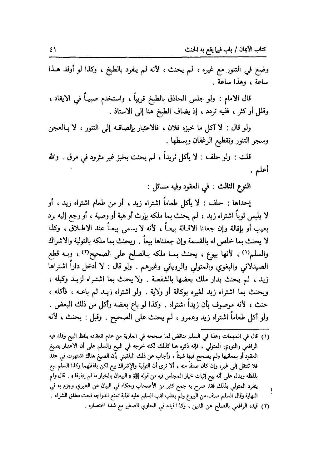النوع الثالث : في العقود وفيه مسائل: إحداها: حلف: لا يأكل طعاما اشتراه زيد، أو من طعام اشتراه زيد، أو لا يلب ثوبا اشتراه زيد، لم يحنث بما ملكه بإرث أو هبة أو وصية، أو رجع إليه برد بعيب أو بإقالة وإن جعلنا الاقالة بيعا، لانه لا يسمى بيعا عند الاطلاق، وكذا لا يحنث بما خلص له بالقسمة وإن جعلناها بيعا. ويحنث بما ملكه بالتولية والاشراك والسلم، لانها بيوع، ولا يحنث بما ملكه بالصلح على الصحيح، وبه قطع الصيدلاني والبغوي والمتولي والروياني وغيرهم. ولو قال: لا أدخل دارا اشتراها زيد، لم يحنث بدار ملك بعضها بالشفعة. ولا يحنث بم اشتراه لزيد وكيله، ويحنث بما اشتراه زيد لغيره بوكالة أو ولاية. ولو اشتراه زيد ثم باعه، فأكله، حنث، لانه موصوف بأن زيدا اشتراه. وكذا لو باع بعضه وأكل من ذلك البعض ولو أكل طعاما اشتراه زيد وعمرو، لم يحنث على الصحيح. وقيل: يحنث، لانه