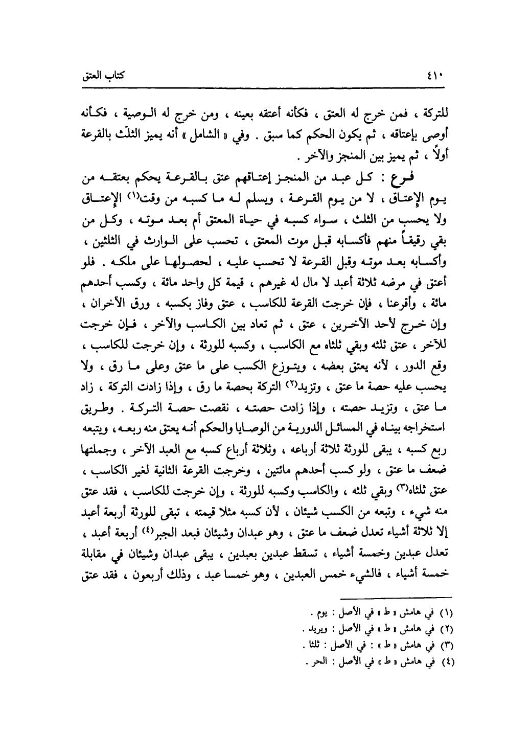 للتركة، فمن خرج له العتق، فكأنه أعتقه بعينه، ومن خرج له الوصية، فكأنه أوصى بإعتاقه، ثم يكون الحكم كما سبق. وفي الشامل أنه يميز الثلث بالقرعة أولا، ثم يميز بين المنجز والآخر. فرع كل عبد من المنجز إعتاقهم عتق بالقرعة يحكم بعتقه من يوم الاعتاق لا من يوم القرعة، ويسلم له ما كسبه من وقت الاعتاق ولا يحسب من الثلث، سواء كسبه في حياة المعتق أم بعد موته، وكل من بقي رقيقا منهم فأكسابه قبل موت المعتق، تحسب على الوارث في الثلثين، وأكسابه بعد موته وقبل القرعة لا تحسب عليه، لحصولها على ملكه. فلو أعتق في مرضه ثلاثة أعبد لا مال له غيرهم، قيمة كل واحد مائة، وكسب أحدهم مائة، وأقرعنا، فإن خرجت القرعة للكاسب، عتق وفاز بكسبه، ورق الآخران، وإن خرج لاحد الآخرين، عتق، ثم تعاد بين الكاسب والآخر، فإن خرجت للآخر، عتق ثلثه وبقي ثلثاه مع الكاسب، وكسبه للورثة، وإن خرجت للكاسب، وقع الدور، لانه يعتق بعضه، ويتوزع الكسب على ما عتق وعلى ما رق، ولا يحسب عليه حصة ما عتق، وتزيد التركة بحصة ما رق، وإذا زادت التركة، زاد ما عتق، وتزيد حصته، وإذا زادت حصته، نقصت حصة التركة. وطريق استخراجه بيناه في المسائل الدورية من الوصايا والحكم أنه يعتق منه ربعه، ويتبعه ربع كسبه، يبقى للورثة ثلاثة أرباعه، وثلاثة أرباع كسبه مع العبد الآخر، وجملتها ضعف ما عتق، ولو كسب أحدهم مائتين، وخرجت القرعة الثانية لغير الكاسب، عتق ثلثاه وبقي ثلثه، والكاسب وكسبه للورثة، وإن خرجت للكاسب، فقد عتق منه شئ، وتبعه من الكسب شيئان، لان كسبه مثلا قيمته، تبقى للورثة أربعة أعبد إلا ثلاثة أشياء تعدل ضعف ما عتق، وهو عبدان وشيئان فبعد الجبر أربعة أعبد، تعدل عبدين وخمسة أشياء، تسقط عبدين بعيدين، يبقى عبدان وشيئان في مقابلة خمسة أشياء، فالشئ خمس العبدين، وهو خمسا عبد، وذلك أربعون، فقد عتق
