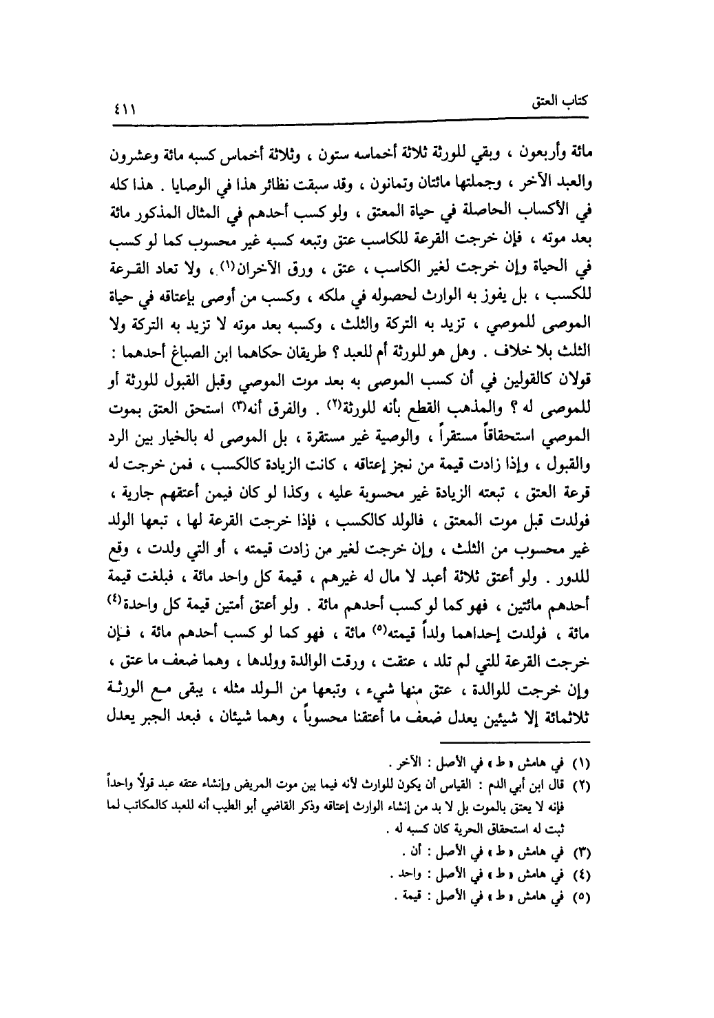 مائة وأربعون، وبقي للورثة ثلاثة أخماسه ستون، وثلاثة أخماس كسبه مائة وعشرون والعبد الآخر، وجملتها مائتان وثمانون، وقد سبقت نظائر هذا في الوصايا. هذا كله في الاكساب الحاصلة في حياة المعتق، ولو كسب أحدهم في المثال المذكور مائة بعد موته، فإن خرجت القرعة للكاسب عتق وتبعه كسبه غير محسوب كما لو كسب في الحياة وإن خرجت لغير الكاسب، عتق، ورق الآخران، ولا تعاد القرعة للكسب، بل يفوز به الوارث لحصوله في ملكه، وكسب من أوصى بإعتاقه في حياة الموصى للموصي، تزيد به التركة والثلث، وكسبه بعد موته لا تزيد به التركة ولا الثلث بلا خلاف. وهل هو للورثة أم للعبد ؟ طريقان حكاهما ابن الصباغ أحدهما: قولان كالقولين في أن كسب الموصى به بعد موت الموصي وقبل القبول للورثة أو للموصى له ؟ والمذهب القطع بأنه للورثة. والفرق أنه استحق العتق بموت الموصي استحقاقا مستقرا، والوصية غير مستقرة، بل الموصى له بالخيار بين الرد والقبول، وإذا زادت قيمة من نجز إعتاقه، كانت الزيادة كالكسب، فمن خرجت له قرعة العتق، تبعته الزيادة غير محسوبة عليه، وكذا لو كان فيمن أعتقهم جارية، فولدت قبل موت المعتق، فالولد كالكسب، فإذا خرجت القرعة لها، تبعها الولد غير محسوب من الثلث، وإن خرجت لغير من زادت قيمته، أو التي ولدت، وقع للدور. ولو أعتق ثلاثة أعبد لا مال له غيرهم، قيمة كل واحد مائة، فبلغت قيمة أحدهم مائتين، فهو كما لو كسب أحدهم مائة. ولو أعتق أمتين قيمة كل واحدة مائة، فولدت إحداهما ولدا قيمته مائة، فهو كما لو كسب أحدهم مائة، فإن خرجت القرعة للتي لم تلد، عتقت، ورقت الوالدة وولدها، وهما ضعف ما عتق، وإن خرجت للوالدة، عتق منها شئ، وتبعها من الولد مثله، يبقى مع الورثة ثلاثمائة إلا شيئين يعدل ضعف ما أعتقنا محسوبا، وهما شيئان، فبعد الجبر يعدل