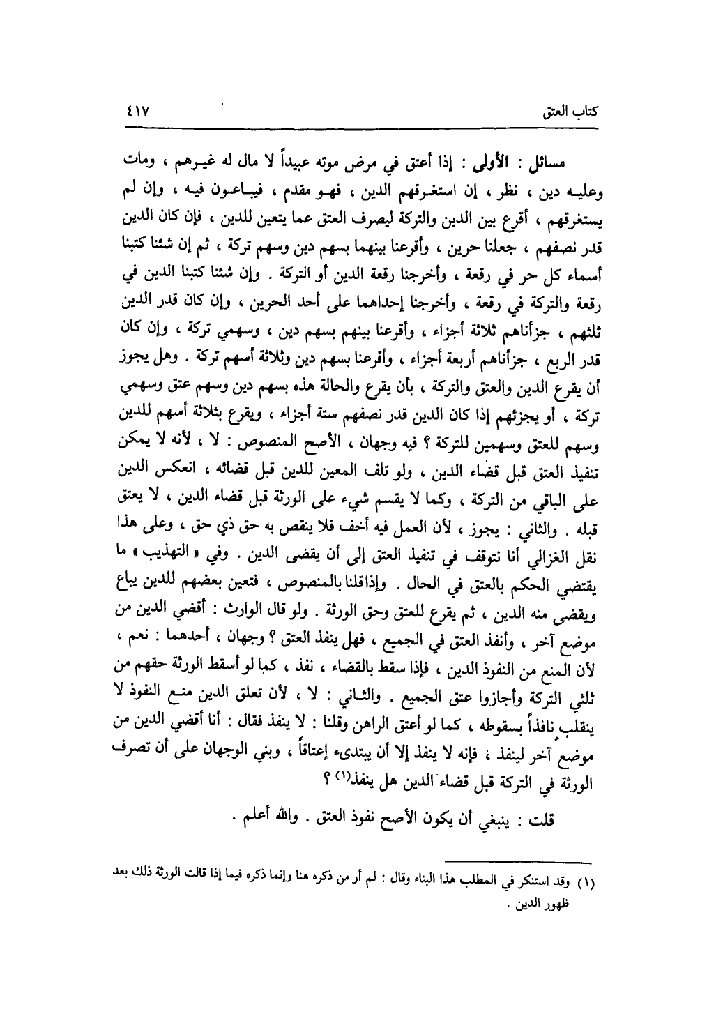 مسائل: الاولى: إذا أعتق في مرض موته عبيدا لا مال له غيرهم ومات وعليه دين، نظر، إن استغرقهم الدين، فهو مقدم، فيباعون فيه، وإن لم يستغرقهم، أقرع بين الدين والتركة ليصرف العتق عما يتعين للدين، فإن كان الدين قدر نصفهم، جعلنا حرين، وأقرعنا بينهما بسهم دين وسهم تركة، ثم إن شئنا كتبنا أسماء كل حر في رقعة، وأخرجنا رقعة الدين أو التركة. وإن شئنا كتبنا الدين في رقعة والتركة في رقعة، وأخرجنا إحداهما على أحد الحرين، وإن كان قدر الدين ثلثهم، جزأناهم ثلاثة أجزاء، وأقرعنا بينهم بسهم دين، وسهمي تركة، وإن كان قدر الرابع، جزأناهم أربعة أجزاء، وأقرعنا بسهم دين، وثلاثة أسهم تركة وهل يجوز أن يقرع للدين والعتق والتركة، بأن يقرع والحالة هذه بسهم دين وسهم عتق وسهمي تركة، أو يجزئهم إذا كان الدين قدر نصفهم ستة أجزاء، ويقرع بثلاثة أسهم للدين وسهم للعتق وسهمين للتركة ؟ فيه وجهان، الاصح المنصوص: لا، لانه لا يمكن تنفيذ العتق قبل قضاء الدين، ولو تلف المعين للدين قبل قضائه، انعكس الدين على الباقي من التركة، وكما لا يقسم شئ على الورثة قبل قضاء الدين، لا يعتق قبله. والثاني: يجوز، لان العمل فيه أخف فلا ينقص به حق ذي حق، وعلى هذا نقل الغزالي أنا نتوقف في تنفيذ العتق إلى أن يقضى الدين. وفي التهذيب ما يقتضي الحكم بالعتق في الحال. وإذا قلنا بالمنوص، فتعين بعضهم للدين يباع ويقضى منه الدين، ثم يقرع للعتق وحق الورثة. ولو قال الوارث: أقضي الدين من موضع آخر، وأنفذ العتق في الجميع، فهل ينفذ العتق ؟ وجهان، أحدهما: نعم، لان المنع من النفوذ الدين، فإذا سقط بالقضاء، نفذ، كما لو أسقط الورثة حقهم من ثلثي التركة وأجازوا عتق الجميع. والثاني: لا، لان تعلق الدين منع النفوذ لا ينقلب نافذا بسقوطه، كما لو أعتق الراهن وقلنا: لا ينفذ فقال: أنا أقضي الدين من موضع آخر لينفذ، فإنه لا ينفذ إلا أن يبتدئ إعتاقا، وبني الوجهان على أن تصرف الورثة في التركة قبل قضاء الدين هل ينفذ ؟ قلت: ينبغي أن يكون الاصح نفوذ العتق. والله أعلم.