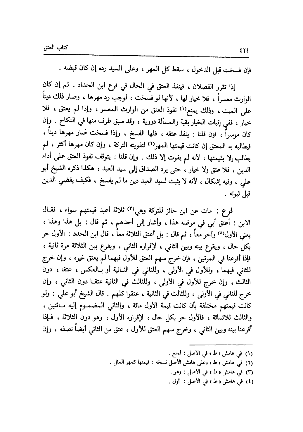 فإن فسخت قبل الدخول، سقط كل المهر، وعلى السيد رده إن كان قبضه إذا تقرر الفصلان، فينفذ العتق في الحال في فرع ابن الحداد. ثم إن كان الوارث معسرا، فلا خيار لها، لانها لو فسخت، لوجب رد مهرها، وصار ذلك دينا على الميت، وذلك يمنع نفوذ العتق من الوارث المعسر، وإذا لم يعتق، فلا خيار، ففي إثبات الخيار بقية والمسألة دورية، وقد سبق طرف منها في النكاح. وإن كان موسرا، فإن قلنا: ينفذ عتقه، فلها الفسخ، وإذا فسخت صار مهرها دينا، فيطالبه به المعتق إن كانت قيمتها المهر لتفويته التركة، وإن كان مهرها أكثر، لم يطالب إلا بقيمتها، لانه لم يفوت إلا ذلك. وإن قلنا: يتوقف نفوذ العتق على أداء الدين، فلا عتق ولا خيار، حتى يرد الصداق إلى سيد العبد، هكذا ذكره الشيخ أبو علي، وفيه إشكال، لانه لا يثبت لسيد العبد دين ما لم يفسخ، فكيف يقضي الدين قبل ثبوته. فرع مات عن ابن حائز للتركة وهي ثلاثة أعبد قيمتهم سواء، فقال الابن: أعتق أبي في مرضه هذا، وأشار إلى أحدهم، ثم قال: بل هذا وهذا، يعني الاول وآخر معا، ثم قال: بل أعتق الثلاثة معا، قال ابن الحداد: الاول حر بكل حال، ويقرع بينه وبين الثاني، لاقراره الثاني، ويقرع بين الثلاثة مرة ثانية، فإذا أقرعنا في المرتين، فإن خرج سهم العتق للاول فيهما لم يعتق غيره، وإن خرج للثاني فيهما، وللاول في الاولى، وللثاني في الثانية أو بالعكس، عتقا، دون الثالث، وإن خرج للاول في الاولى، وللثالث في الثانية عتقا دون الثاني، وإن خرج للثاني في الاولى، وللثالث في الثانية، عتقوا كلهم. قال الشيخ أبو علي: ولو كانت قيمتهم مختلفة بأن كانت قيمة الاول مائة، والثاني المضوم إليه مائتين، والثالث ثلاثمائة، فالاول حر بكل حال، لاقراره الاول، وهو دون الثلاثة، فإذا أقرعنا بينة وبين الثاني، وخرج سهم العتق للاول، عتق من الثاني أيضا نصفه، وإن