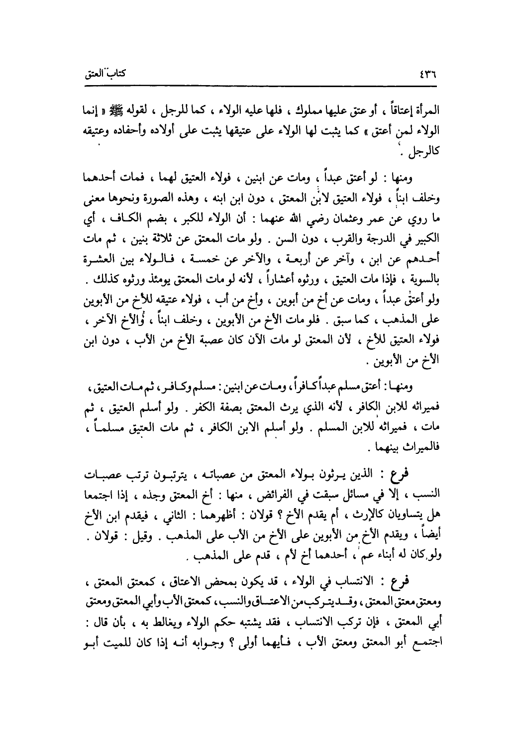 المرأة إعتاقا، أو عتق عليها مملوك، فلها عليه الولاء، كما للرجل، لقوله - صلى الله عليه وسلم - إنما الولاء لمن أعتق كما يثبت لها الولاء على عتيقها يثبت على أولاده وأحفاده وعتيقه كالرجل. ومنها: لو أعتق عبدا، ومات عن ابنين، فولاء العتيق لهما، فمات أحدهما وخلف ابنا، فولاء العتيق لابن المعتق، دون ابن ابنه، وهذه الصورة ونحوها معنى ما روى عن عمر وعثمان رضي الله عنهما: أن الولاء للكبر، بضم الكاف، أي الكبير في الدرجة والقرب، دون السن. ولو مات المعتق عن ثلاثة بنين، ثم مات أحدهم عن ابن، وآخر عن أربعة، والآخر عن خمسة، فالولاء بين العشرة بالسوية، فإذا مات العتيق، ورثوه أعشارا، لانه لو مات المعتق يومئذ ورثوه كذلك. ولو أعتق عبدا، ومات عن أخ من أبوين وأخ من أب، فولاء عتيقه للاخ من الابوين على المذهب، كما سبق. فلو مات الاخ من الابوين، وخلف ابنا، والاخ الآخر، فولاء العتيق للاخ، لان المعتق لو مات الآن كان عصبة الاخ من الاب، دون ابن الاخ من الابوين. ومنها: أعتق مسلم عبدا كافرا، ومات عن ابنين: مسلم وكافر، ثم مات العتيق، فميراثه للابن الكافر، لانه الذي يرث المعتق بصفة الكفر. ولو أسلم العتيق، ثم مات، فميراثه للابن المسلم. ولو أسلم الابن الكافر، ثم مات العتيق مسلما، فالميراث بينهما. فرع الذين يرثون بولاء المعتق من عصباته، يترتبون ترتب عصبات النسب، إلا في مسائل سبقت في الفرائض. منها: أخ المعتق وجده، إذا اجتمعا هل يتساويان كالارث، أم يقدم الاخ ؟ قولان: أظهرهما: الثاني، فيقدم ابن الاخ أيضا، ويقدم الاخ من الابوين على الاخ من الاب على المذهب. وقيل: قولان. ولو كان له ابناء عم، أحدهما أخ لام، قدم على المذهب. فرع الانتساب في الولاء، قد يكون بمحض الاعتاق، كمعتق المعتق، ومعتق معتق المعتق، وقد يتركب من الاعتاق والنسب، كمعتق الاب وأبي المعتق ومعتق أبي المعتق، فإن تركب الانتساب، فقد يشتبه حكم الولاء ويغالط به، بأن قال: اجتمع أبو المعتق ومعتق الاب فأيهما أولى ؟ وجوابه أنه إذا كان للميت أبو