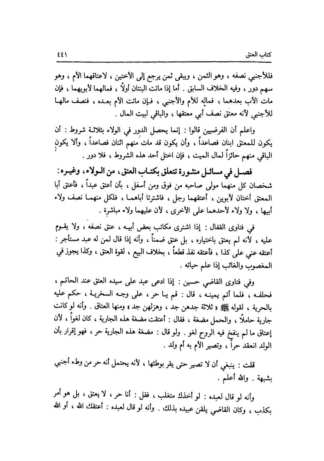 فصل في مسائل منثورة تتعلق بكتاب العتق، من الولاء، وغيره شخصان كل منهما مولى صاحبه من فوق ومن أسفل، بأن أعتق عبدا، فأعتق أبا المعتق أختان لابوين، أعتقهما رجل، فاشترتا أباهما، فلكل منهما نصف ولاء أبيها، ولا ولاء لاحدهما على الاخرى، لان عليهما ولاء مباشرة. وفي فتاوى القفال: إذا اشترى مكاتب بعض أبيه، عتق نصفه، ولا يقوم عليه، لانه لم يعتق باختياره، بل عتق ضمنا، وأنه إذا قال لمن له عبد مستأجر: أعتقه عني على كذا، فأعتقه، نفذ قطعا، بخلاف البيع، لقوة العتق، وكذا يجوز في المغصوب والغائب إذا علم حياته. وفي فتاوى القاضي حسين: إذا ادعى عبد على سيده العتق عند الحاكم، فحلفه فلما أتم يمينه، قال: قم يا حر، على وجه السخرية، حكم عليه بالحرية، لقوله - صلى الله عليه وسلم - ثلاثة جدهن جد، وهزلهن جد ومنها العتاق. وأنه لو كانت جارية حاملا، والحمل مضغة، فقال: أعتقت مضغة هذه الجارية، كان لغوا، لان إعتاق ما لم ينفخ فيه الروح لغو. ولو قال: مضغة هذه الجارية حر، فهو إقرار بأن الولد انعقد حرا، وتصير الام به أم ولد. قلت: ينبغي أن لا تصير حتى يقر بوطئها، لانه يحتل أنه حر من وطئ أجنبي بشبهة. والله أعلم. وأنه لو قال لعبده: لو أخذك متغلب، فقل: أنا حر، لا يعتق، بل هو أمر بكذب، وكان القاضي يلقن عبيده بذلك. وأنه لو قال لعبده: أعتقك الله، أو الله
