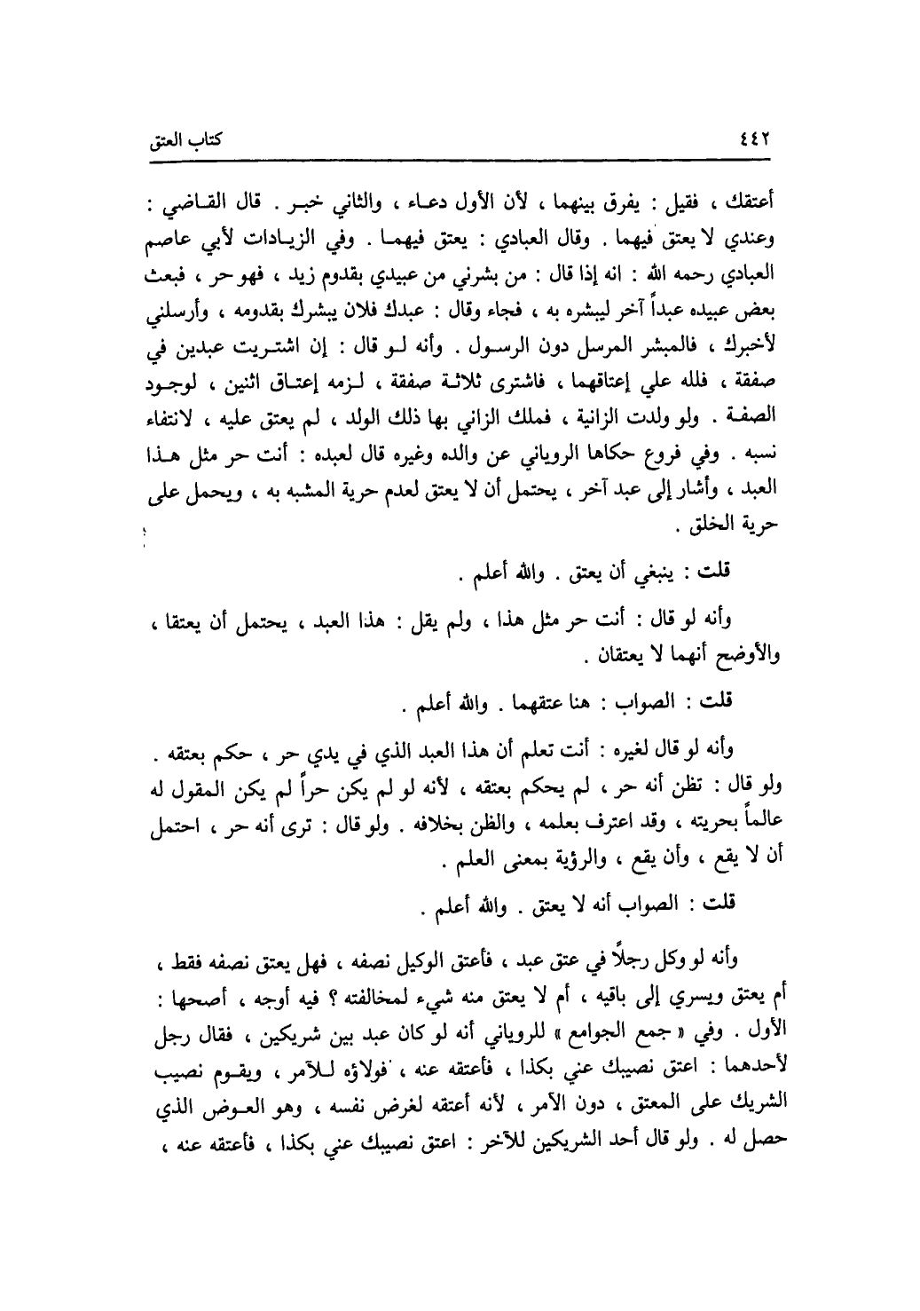 أعتقك، فقيل: يفرق بينهما، لان الاول دعاء، والثاني خبر. قال القاضي: وعندي لا يعتق فيهما. وقال العبادي: يعتق فيهما. وفي الزيادات لابي عاصم العبادي رحمه الله: أنه إذا قال: من بشرني من عبيدي بقدوم زيد، فهو حر، فبعث بعض عبيده عبدا آخر ليبشره به، فجاء وقال: عبدك فلان يبشرك بقدومه، وأرسلني لاخبرك، فالمبشر المرسل دون الرسول. وأنه لو قال: إن اشتريت عبدين في صفقة، فلله علي إعتاقهما، فاشترى ثلاثة صفقة، لزمه إعتاق اثنين، لوجود الصفة. ولو ولدت الزانية، فملك الزاني بها ذلك الولد، لم يعتق عليه، لانتفاء نسبه. وفي فروع حكاها الروياني عن والده وغيره قال لعبده: أنت حر مثل هذا العبد، وأشار إلى عبد آخر، يحتمل أن لا يعتق لعدم حرية المشبه به، ويحمل على حرية الخلق. قلت: ينبغي أن يعتق. والله أعلم. وأنه لو قال: أنت حر مثل هذا، ولم يقل: هذا العبد، يحتمل أن يعتقا، والاوضح أنهما لا يعتقان. قلت: الصواب: هنا عتقهما. والله أعلم. وأنه لو قال لغيره: أنت تعلم أن هذا العبد الذي في يدي حر، حكم بعتقه. ولو قال: تظن أنه حر، لم يحكم بعتقه، لانه لو لم يكن حرا لم يكن المقول له عالما بحريته، وقد اعترف بعلمه، والظن بخلافه. ولو قال: ترى أنه حر، احتمل أن لا يقع، وأن يقع، والرؤية بمعنى العلم. قلت: الصواب أنه لا يعتق. والله أعلم. وأنه لو وكل رجلا في عتق عبد، فأعتق الوكيل نصفه، فهل يعتق نصفه فقط، أم يعتق ويسري إلى باقيه، أم لا يعتق منه شئ لمخالفته ؟ فيه أوجه، أصحها: الاول. وفي جمع الجوامع للروياني أنه لو كان عبد بين شريكين، فقال رجل لاحدهما: اعتق نصيبك عني بكذا، فأعتقه عنه، فولاؤه للآمر، ويقوم نصيب الشريك على المعتق، دون الآمر، لانه أعتقه لغرض نفسه، وهو العوض الذي حصل له. ولو قال أحد الشريكين للآخر: أعتق نصيبك عني بكذا، فأعتقه عنه،
