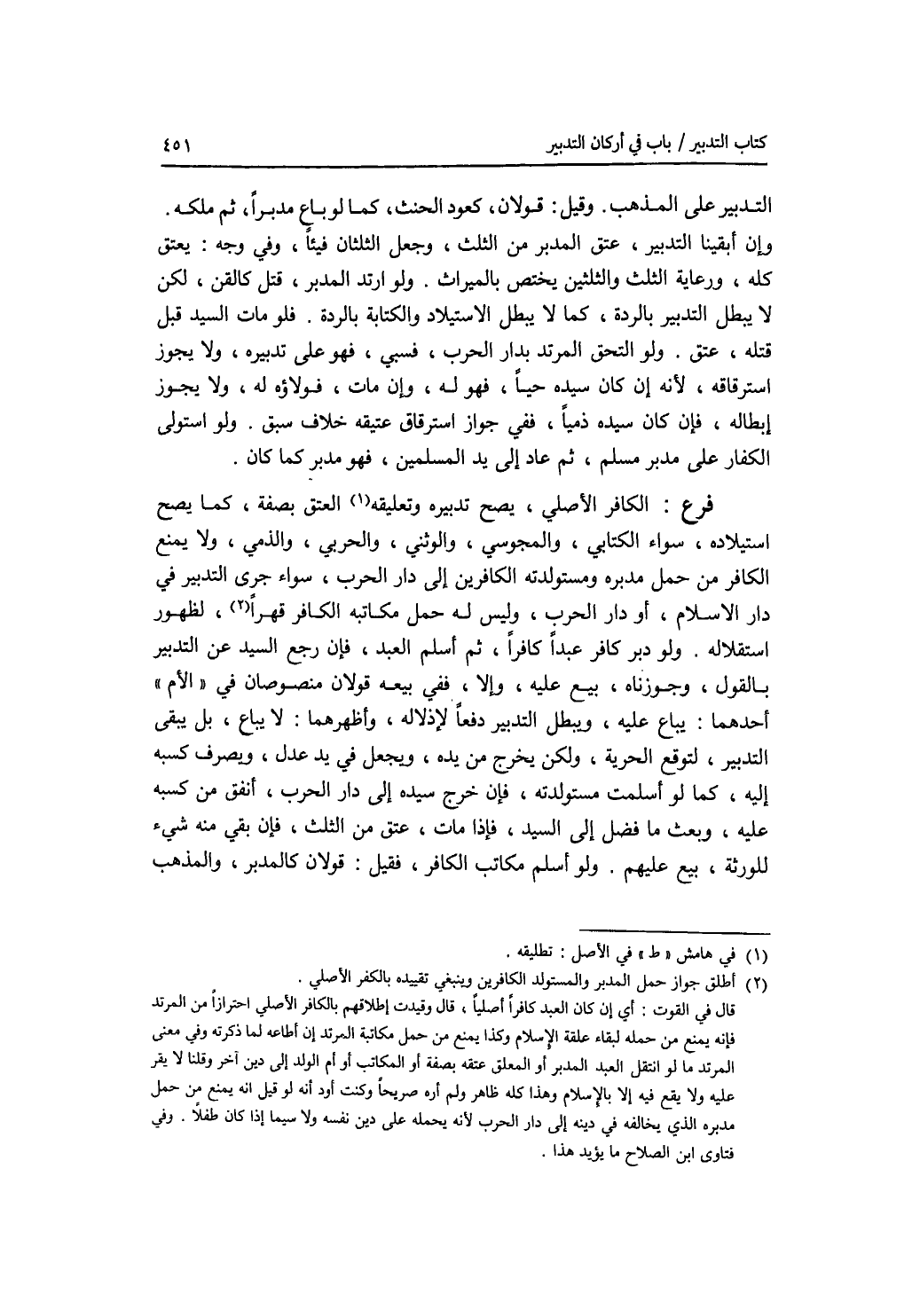 التدبير على المذهب. وقيل: قولان، كعود الحنث، كما لو باع مدبرا، ثم ملكه. وإن أبقينا التدبير، عتق المدبر من الثلث، وجعل الثلثان فيئا، وفي وجه: يعتق كله، ورعاية الثلث والثلثين يختص بالمياث. ولو ارتد المدبر، قتل كالقن، لكن لا يبطل التدبير بالردة، كما لا يبطل الاستيلاد والكتابة بالردة. فلو مات السيد قبل قتله، عتق. ولو التحق المرتد بدار الحرب، فسبي، فهو على تدبيره، ولا يجوز استرقاقه، لانه إن كان سيده حيا، فهو له، وإن مات، فولاؤه له، ولا يجوز إبطاله، فإن كان سيده ذميا، ففي جواز استرقاق عتيقه خلاف سبق. ولو استولى الكفار على مدبر مسلم، ثم عاد إلى يد المسلمين، فهو مدبر كما كان. فرع الكافر الاصلي، يصح تدبير وتعليقه العتق بصفة، كما يصح استيلاده، سواء الكتابي، والمجوسي، والوثني والحربي، والذمي، ولا يمنع الكافر من حمل مدبره ومستولدته الكافرين إلى دار الحرب، سواء جرى التدبير في دار الاسلام، أو دار الحرب، وليس له حمل مكاتبه الكافر قهرا، لظهور استقلاله. ولو دبر كافر عبدا كافرا، ثم أسلم العبد، فإن رجع السيد عن التدبير بالقول، وجوزناه، بيع عليه، وإلا، ففي بيعه قولان منصوصان في الام أحدهما: يباع عليه، ويبطل التدبير دفعا لاذلاله، وأظهرهما: لا يباع، بل يبقى التدبير، لتوقع الحرية، ولكن يخرج من يده، ويجعل في يد عدل، ويصرف كسبه إليه، كما لو أسلمت مستولدته، فإن خرج سيده إلى دار الحرب، أنفق من كسبه عليه، وبعث ما فضل إلى السيد، فإذا مات، عتق من الثلث، فإن بقي منه شئ للورثة، بيع عليهم. ولو أسلم مكاتب الكافر، فقيل: قولان كالمدبر، والمذهب