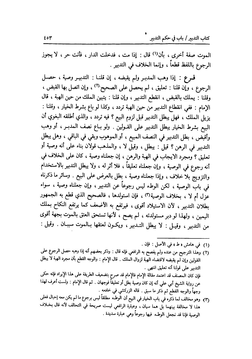 الموت صفة أخرى، بأن قال: إذا مت، فدخلت الدار، فأنت حر، لا يجوز الرجوع باللفظ قطعا، وإنما الخلاف في التدبير. فرع إذا وهب المدبر ولم يقبضه، إن قلنا: التدبير وصية، حصل الرجوع، وإن قلنا: تعليق، لم يحصل على الصحيح، وإن اتصل بها القبض، وقلنا: يملك بالقبض، انقطع التدبير، وإن قلنا: يتبين الملك من حين الهبة، قال الامام: ففي انقطاع التدبير من حين الهبة تردد، وكذا لو باع بشرط الخيار، وقلنا: يزيل الملك، فهل يبطل التدبير قبل لزوم البيع ؟ فيه تردد، والذي أطلقه البغوي أن البيع بشرط الخيار يبطل التدبير على القولين. ولو باع نصف المدبر، أو وهب وأقبض، بطل التدبير في النصف المبيع، أو الموهوب وبقي في الباقي، وهل يبطل التدبير في الرهن ؟ قيل: يبطل، وقيل لا، والمذهب قولان بناء على أنه وصية أو تعليق ؟ ومجرد الايجاب في الهبة والرهن، إن جعلناه وصية، كان على الخلاف في أنه رجوع في الوصية، وإن جعلناه تعليقا، فلا أثر له، ولا يبطل التدبير بالاستخدام والتزويج بلا خلاف، وإذا جعلناه وصية، بطل بالعرض على البيع. وسائر ما ذكرناه في باب الوصية، لكن الوطئ ليس رجوعا عن التدبير، وإن جعلناه وصية، سواء عزل أم لا، بخلاف الوصية، فإن استولدها، فالصحيح الذي قطع به الجمهور بطلان التدبير، لان الاستيلاد أقوى، فيرتفع به الاضعف، كما يرتفع النكاح بملك اليمين، ولهذا لو دبر مستولدته، لم يصح، لانها تستحق العتق بالموت بجهة أقوى من التدبير، وقيل: لا يبطل التدبير، ويكون لعتقها بالموت سببان. وقيل: