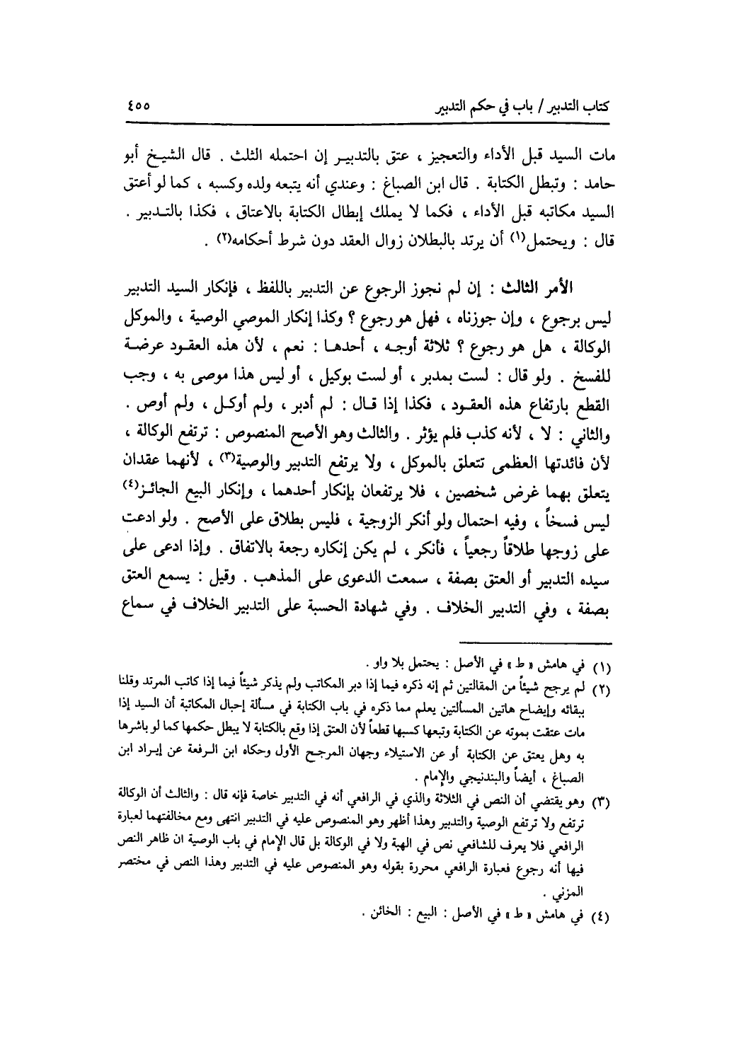 مات قبل الاداء والتعجيز الاداء والتعجيز، عتق بالتدبير إن احتمله الثلث. قال الشيخ أبو حامد: وتبطل الكتابة. قال ابن الصباغ: وعندي أنه يتبعه ولده وكسبه، كما لو أعتق السيد مكاتبه قبل الاداء، فكما لا يملك إبطال الكتابة بالاعتاق، فكذا بالتدبير. قال: ويحتمل أن يريد بالبطلان زوال العقد دون سقوط أحكامه. الامر الثالث: إن لم نجوز الرجوع عن التدبير باللفظ، فإنكار السيد التدبير ليس برجوع، وإن جوزناه، فهل هو رجوع ؟ وكذا إنكار الموصي الوصية، والموكل الوكالة، هل هو رجوع ؟ ثلاثة أوجه، أحدها: نعم، لان هذه العقود عرضة للفسخ. ولو قال: لست بمدبر، أو لست بوكيل، أو ليس هذا موصى به، وجب القطع بارتفاع هذه العقود، فكذا إذا قال: لم أدبر، ولم أوكل، ولم أوص. والثاني: لا، لانه كذب فلم يؤثر. والثالث وهو الاصح المنصوص: ترتفع الوكالة، لان فائدتها العظمى تتعلق بالموكل، ولا يرتفع التدبير والوصية، لانهما عقدان يتعلق بهما غرض شخصين، فلا يرتفعان بإنكار أحدهما، وإنكار البيع الجائز ليس فسخا، وفيه احتمال. ولو أنكر الزوجية، فليس بطلاق على الاصح. ولو ادعت على زوجها طلاقا رجعيا، فأنكر، لم يكن إنكاره رجعة بالاتفاق. وإذا ادعى على سيده التدبير أو العتق بصفة، سمعت الدعوى على المذهب. وقيل: يسمع العتق بصفة، وفي التدبير الخلاف. وفي شهادة الحسبة على التدبير الخلاف في سماع