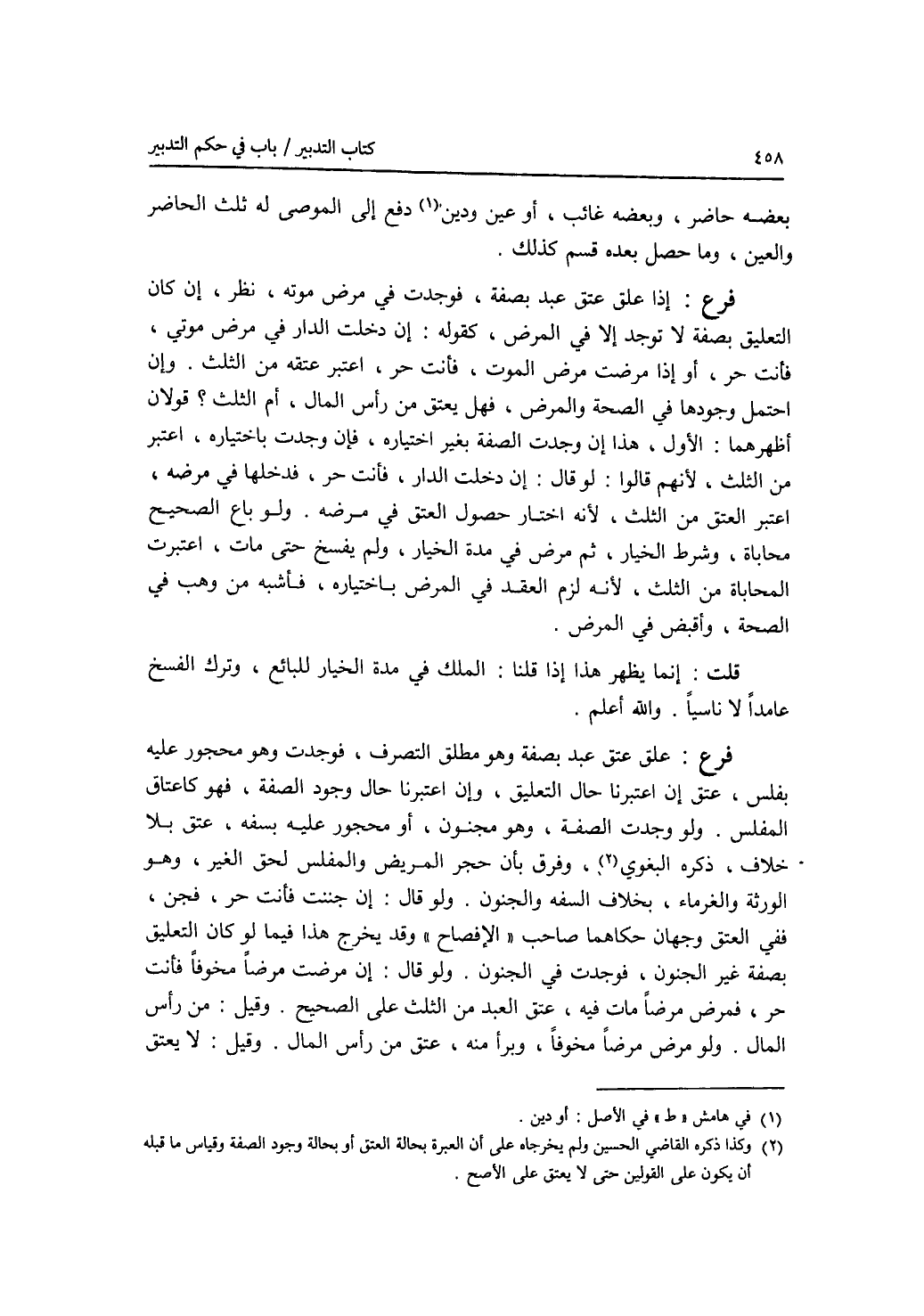 وبعضه حاضر، وبعضه غائب، أو عين ودين دفع إلى الموصى له ثلث الحاضر والعين، وما حصل بعده قسم كذلك. فرع إذا علق عتق عبد بصفة، فوجدت في مرض موته، نظر، إن كان التعليق بصفة لا توجد إلا في المرض، كقوله: إن دخلت الدار في مرض موتي، فأنت حر، أو إذا مرضت مرض الموت، فأنت حر، اعتبر عتقه من الثلث. وإن احتمل وجودها في الصحة والمرض، فهل يعتق من رأس المال، أم الثلث ؟ قولان أظهرهما: الاول، هذا إن وجدت الصفة بغير اختياره، فإن وجدت باختياره، اعتبر من الثلث، لانهم قالوا: لو قال: إن دخلت الدار، فأنت حر، فدخلها في مرضه، اعتبر العتق من الثلث، لانه اختار حصول العتق في مرضه. ولو باع الصحيح محاباة، وشرط الخيار، ثم مرض في مدة الخيار، ولم يفسخ حتى مات، اعتبرت المحاباة من الثلث، لانه لزم العقد في المرض باختياره، فأشبه من وهب في الصحة، وأقبض في المرض. قلت: إنما يظهر هذا إذا قلنا: الملك في مدة الخيار للبائع، وترك الفسخ عامدا لا ناسيا. والله أعلم. فرع علق عتق عبد بصفة وهو مطلق التصرف، فوجدت وهو محجور عليه بفلس، عتق إن اعتبرنا حال التعليق، وإن اعتبرنا حال وجود الصفة، فهو كإعتاق المفلس. ولو وجدت الصفة، وهو مجنون، أو محجور عليه بسفه، عتق بلا خلاف، ذكره البغوي، وفرق بأن حجر المريض والمفلس لحق الغير، وهو الورثة والغرماء، بخلاف السفه والجنون. ولو قال: إن جننت فأنت حر، فجن، ففي العتق وجهان حكاهما صاحب الافصاح وقد يخرج هذا فيما لو كان التعليق بصفة غير الجنون، فوجدت في الجنون. ولو قال: إن مرضت مرضا مخوفا فأنت حر، فمرض مرضا مات فيه، عتق العبد من الثلث على الصحيح. وقيل: من رأس المال. ولو مرض مرضا مخوفا، وبرأ منه، عتق من رأس المال. وقيل: لا يعتق
