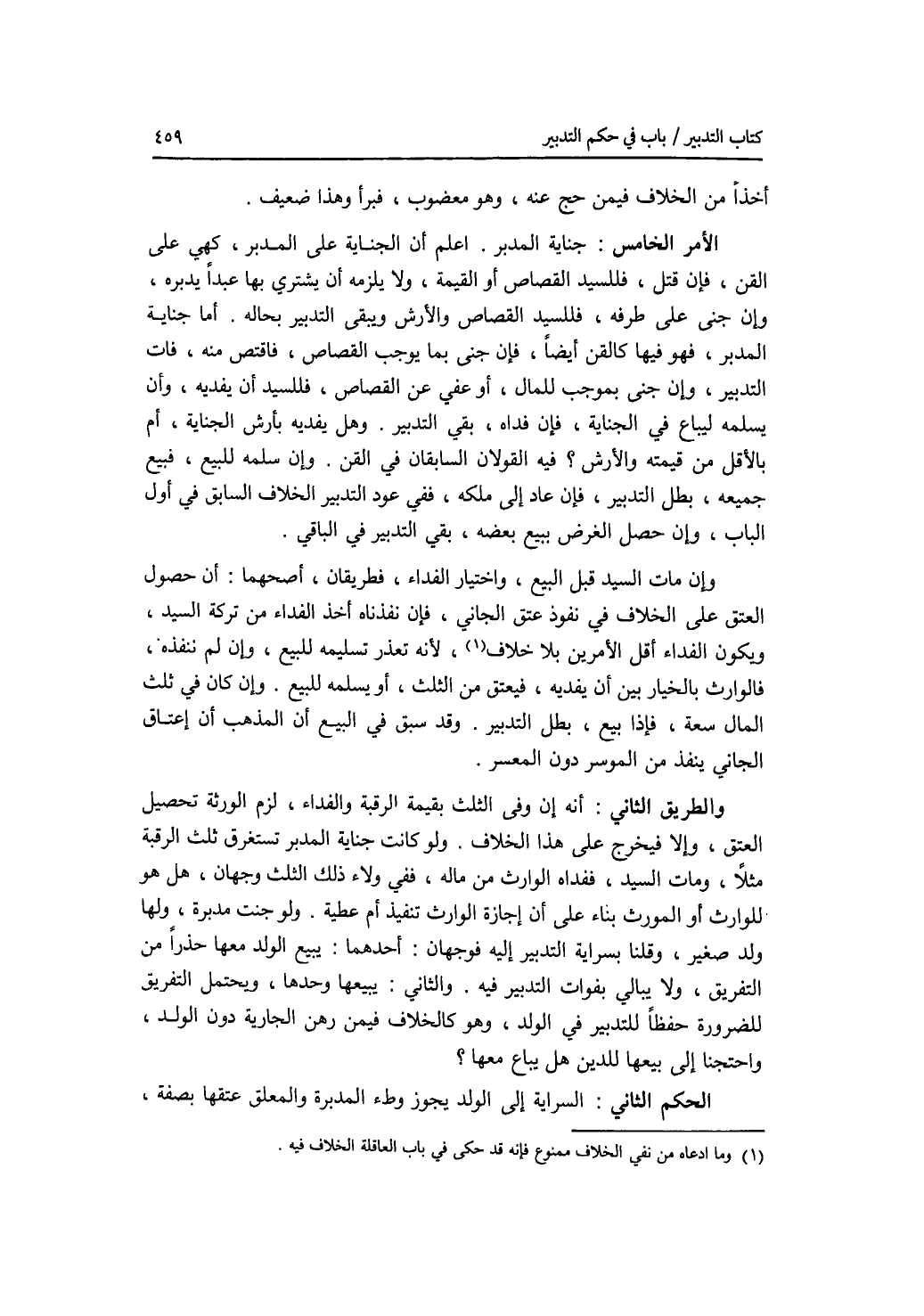 أخذا من الخلاف فيمن حج عنه، وهو معضوب، فبرأ وهذا ضعيف. الامر الخامس: جناية المدبر. اعلم أن الجناية على المدبر، كهي على القن، فإن قتل، فللسيد القصاص أو القيمة، ولا يلزمه أن يشتري بها عبدا يدبره، وإن جنى على طرفه، فللسيد القصاص والارش، ويبقى التدبير بحاله. أما جناية المدبر، فهو فيها كالقن أيضا، فإن جنى بما يوجب القصاص، فاقتص منه، فات التدبير، وإن جنى بموجب للمال، أو عفي عن القصاص، فللسيد أن يفديه، وأن يسلمه ليباع في الجناية، فإن فداه، بقي التدبير. وهل يفديه بأرش الجناية، أم بالاقل من قيمته والارش ؟ فيه القولان السابقان في القن. وإن سلمه للبيع، فبيع جميعه، بطل التدبير، فإن عاد إلى ملكه، ففي عود التدبير الخلاف السابق في أول الباب، وإن حصل الغرض ببيع بعضه، بقي التدبير في الباقي. وإن مات السيد قبل البيع، واختيار الفداء، فطريقان، أصحهما: أن حصول العتق على الخلاف في نفوذ عتق الجاني، فإن نفذناه أخذ الفداء من تركة السيد، ويكون الفداء أقل الامرين بلا خلاف، لانه تعذر تسليمه للبيع، وإن لم ننفذه، فالوارث بالخيار بين أن يفديه، فيعتق من الثلث، أو يسلمه للبيع. وإن كان في ثلث المال سعة، فإذا بيع، بطل التدبير. وقد سبق في البيع أن المذهب أن إعتاق الجاني ينفذ من الموسر دون المعسر. والطريق الثاني أنه إن وفى الثلث بقيمة الرقبة والفداء، لزم الورثة تحصيل العتق، وإلا فيخرج على هذا الخلاف. ولو كانت جناية المدبر تستغرق ثلث الرقبة مثلا، ومات السيد، ففداه الوارث من ماله، ففي ولاء ذلك الثلث وجهان، هل هو للوارث أو المورث بناء على أن إجازة الوارث تنفيذ أم عطية. ولو جنت مدبرة، ولها ولد صغير، وقلنا بسراية التدبير إليه، فوجهان: أحدهما: يبيع الولد معها حذرا من التفريق، ولا يبالي بفوات التدبير فيه. والثاني، يبيعها وحدها، ويحتمل التفريق للضرورة، حفظا للتدبير في الولد، وهو كالخلاف فيمن رهن الجارية دون الولد، واحتجنا إلى بيعها للدين هل يباع معها ؟ الحكم الثاني: السراية إلى الولد يجوز وطئ المدبرة والمعلق عتقها بصفة،