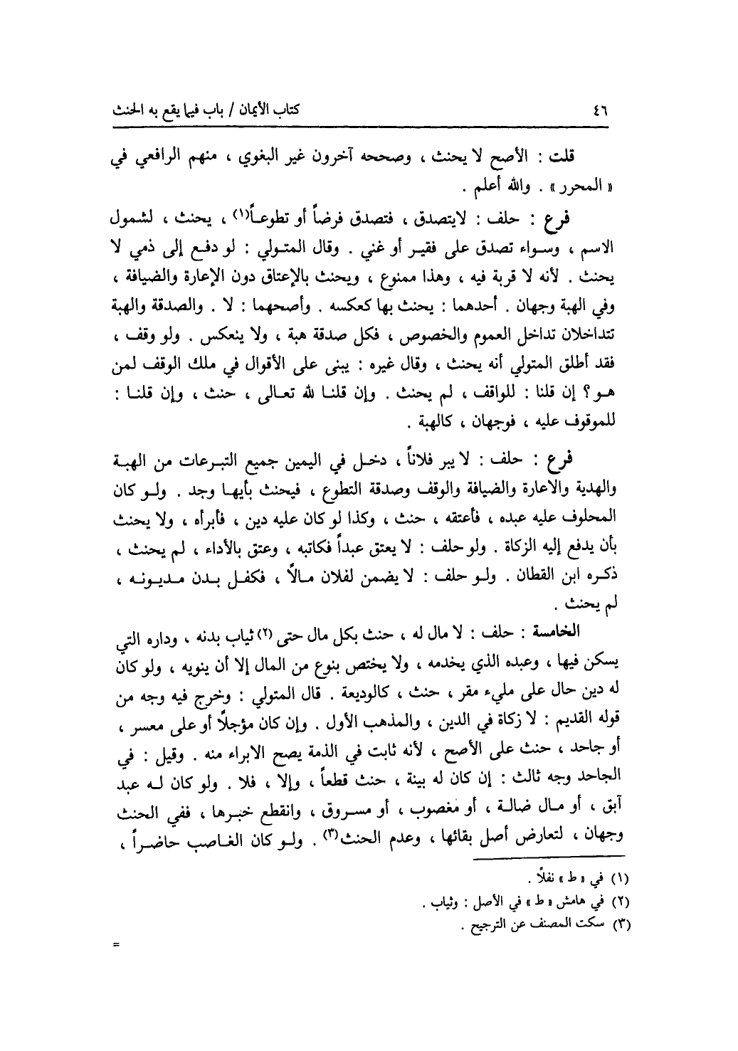 قلت: الاصح لا يحنث، وصححه آخرون غير البغوي، منهم الرافعي في المحرر. والله أعلم. فرع حلف: لا يتصدق، فتصدق فرضا أو نفلا، يحنث، لشمول الاسم، وسواء تصدق على فقير أو غني. وقال المتولي: لو دفع إلى ذمي لا يحنث، لانه لا قربة فيه، وهذا ممنوع، ويحنث بالاعتاق دون الاعارة والضيافة، وفي الهبة وجهان. أحدهما: يحنث بها كعكسه. وأصحهما، لا. والصدقة والهبة تتداخلان تداخل العموم والخصوص، فكل صدقة هبة، ولا ينعكس. ولو وقف، فقد أطلق المتولي أنه يحنث، وقال غيره: يبنى على الاقوال في ملك الوقف لمن هو ؟ إن قلنا: للواقف، لم يحنث. وإن قلنا: لله تعالى، حنث، وإن قلنا: للموقوف عليه، فوجهان، كالهبة. فرع حلف: لا يبر فلانا، دخل في اليمين جميع التبرعات من الهبة والهدية والاعارة والضيافة والوقف وصدقة التطوع، فيحنث بأيها وجد ولو كان المحلوف عليه عبده، فأعتقه، حنث، وكذا لو كان عليه دين، فأبرأه، ولا يحنث بأن يدفع إليه الزكاة. ولو حلف: لا يعتق عبدا فكاتبه، وعتق بالاداء، لم يحنث، ذكره ابن القطان. ولو حلف: لا يضمن لفلان مالا، فكفل بدن مديونه، لم يحنث . الخامسة: حلف: لا مال له، حنث بكل مال حتى ثياب بدنه، وداره التي يسكن فيها، وعبده الذي يخدمه، ولا يختص بنوع من المال إلا أن ينويه، ولو كان له دين حال على ملئ مقر، حنث، كالوديعة. قال المتولي: وخرج فيه وجه من قوله القديم: لا زكاة في الدين، والمذهب الاول، وإن كان مؤجلا أو على معسر، أو جاحد، حنث على الاصح، لانه ثابت في الذمة يصح الابراء منه. وقيل: في الجاحد وجه ثالث: إن كان له مغضوب بينة، حنث قطعا، وإلا، فلا. ولو كان له عبد آبق، أو مال ضالة، أو مفصوب، أو مسروق، وانقطع خبرها، ففي الحنث وجهان، لتعارض أصل بقائها، وعدم الحنث. ولو كان الغاصب حاضرا،