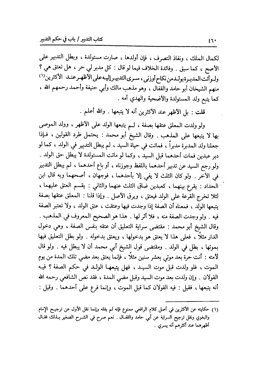 لكمال الملك، ونفاذ التصرف، فإن أولدها، صارت مستولدة، وبطل التدبير على الاصح، كما سبق. وفائدة الخلاف فيما لو قال: كل مدبر لي حر، هل تعتق هي ؟ ولو أتت المدبرة بولد من نكاح أو زنى، سرى التدبير إليه على الاظهر عند الاكثرين، منهم الشيخان أبو حامد والقفال، وهو مذهب مالك وأبي حنيفة وأحمد رحمهم الله، كما يتبع ولد المستولدة والاضحية والهدي أمه. قلت: بل الاظهر عند الاكثرين أنه لا يتبعها. والله أعلم. ولولدت المعلق عتقها بصفة، لم يتبعها الولد على الاظهر، وولد الموصى بها لا يتبعها على المذهب. وقال الشيخ أبو محمد: يحتمل طرد القولين، فإذا جعلنا ولد المدبرة مدبرا، فماتت في حياة السيد، لم يبطل التدبير في الولد، كما لو دبر عبدين فمات أحدهما قبل السيد، وكما لو ماتت المستولدة لا يبطل حق الولد. ولو رجع السيد عن تدبير أحدهما باللفظ وجوزناه، أو باع أحدهما، لم يبطل التدبير في الآخر. ولو كان الثلث لا يفي إلا بأحدهما، فوجهان، أصحهما وبه قال ابن الحداد: يقرع بينهما، كعبدين ضاق الثلث عنهما والثاني: يقسم العتق عليهما، لئتخرج القرعة على الولد فيعتق، ويرق الاصل. وإذا قلنا: المعلق عتقها بصفة يتبعها الولد، فمعناه أن الصفة إذا وجدت فيها وعتقت، عتق الولد، ولا تعتبر الصفة فيه. ولو وجدت الصفة منه، فلا أثر لها. هذا هو الصحيح المعروف في المذهب. وقال الشيخ أبو محمد: مقتضى سراية التعليق أن عتقه بنفس الصفة، وهي دخول الدار مثلا، فعلى هذا لا يعتق هو بدخولها، ويعتق بدخوله. ولو بطل التعليق فيها بموتها، بطل في الولد. ومقتضى قول الشيخ أبي محمد أن لا يبطل فيه. ولو قال لامته: أنت حرة بعد موتي بعشر سنين مثلا، فإنما يعتق بعد مضي تلك المدة من يوم الموت، فلو ولدت قبل موت السيد، فهل يتبعها الولد في حكم الصفة ؟ فيه القولان. وإن ولدت بعد موت السيد وقبل مضي المدة، فقد نص الشافعي رحمه الله أنه يتبعها، فقيل: فيه القولان كما قبل الموت، وإنما فرع على أحدهما. وقيل: